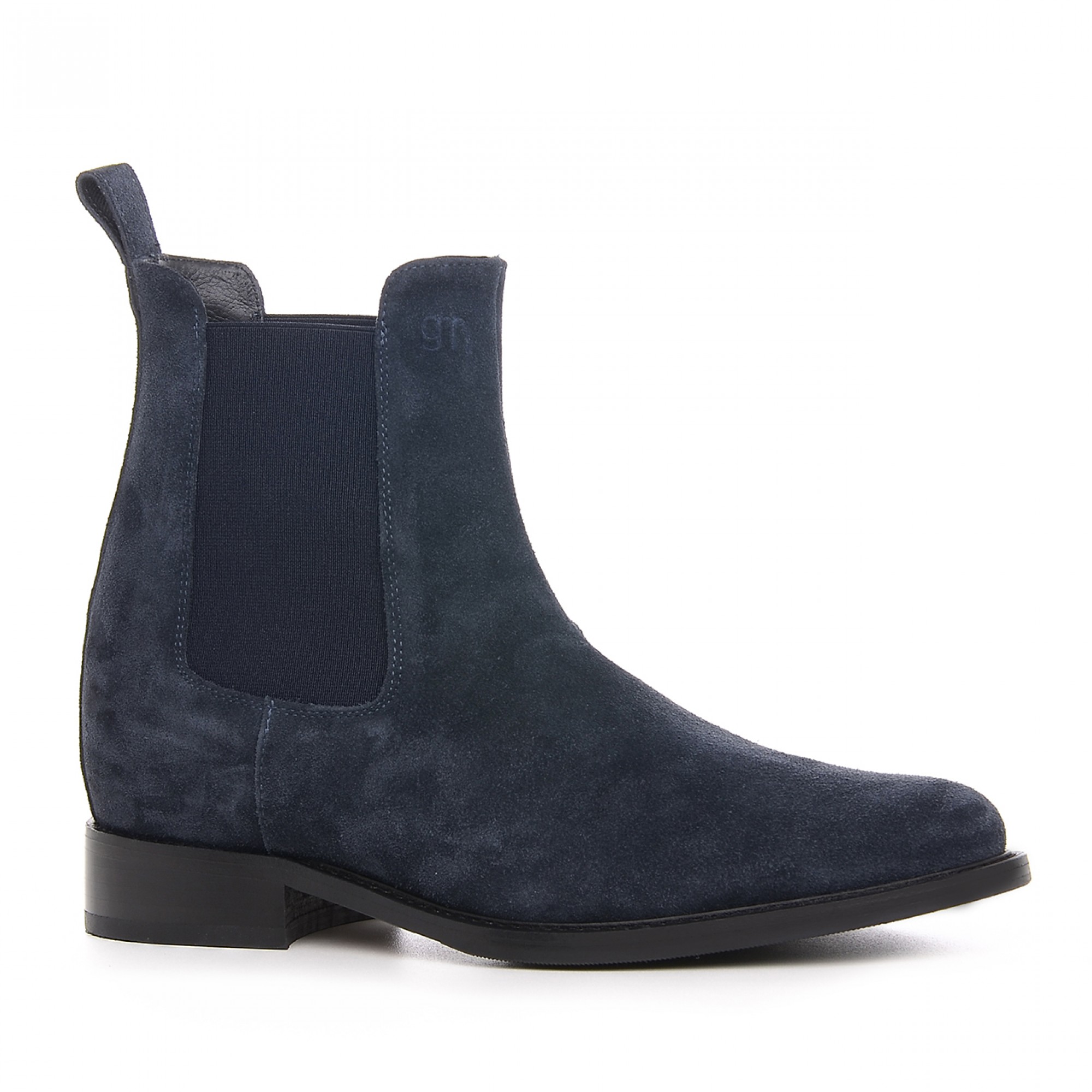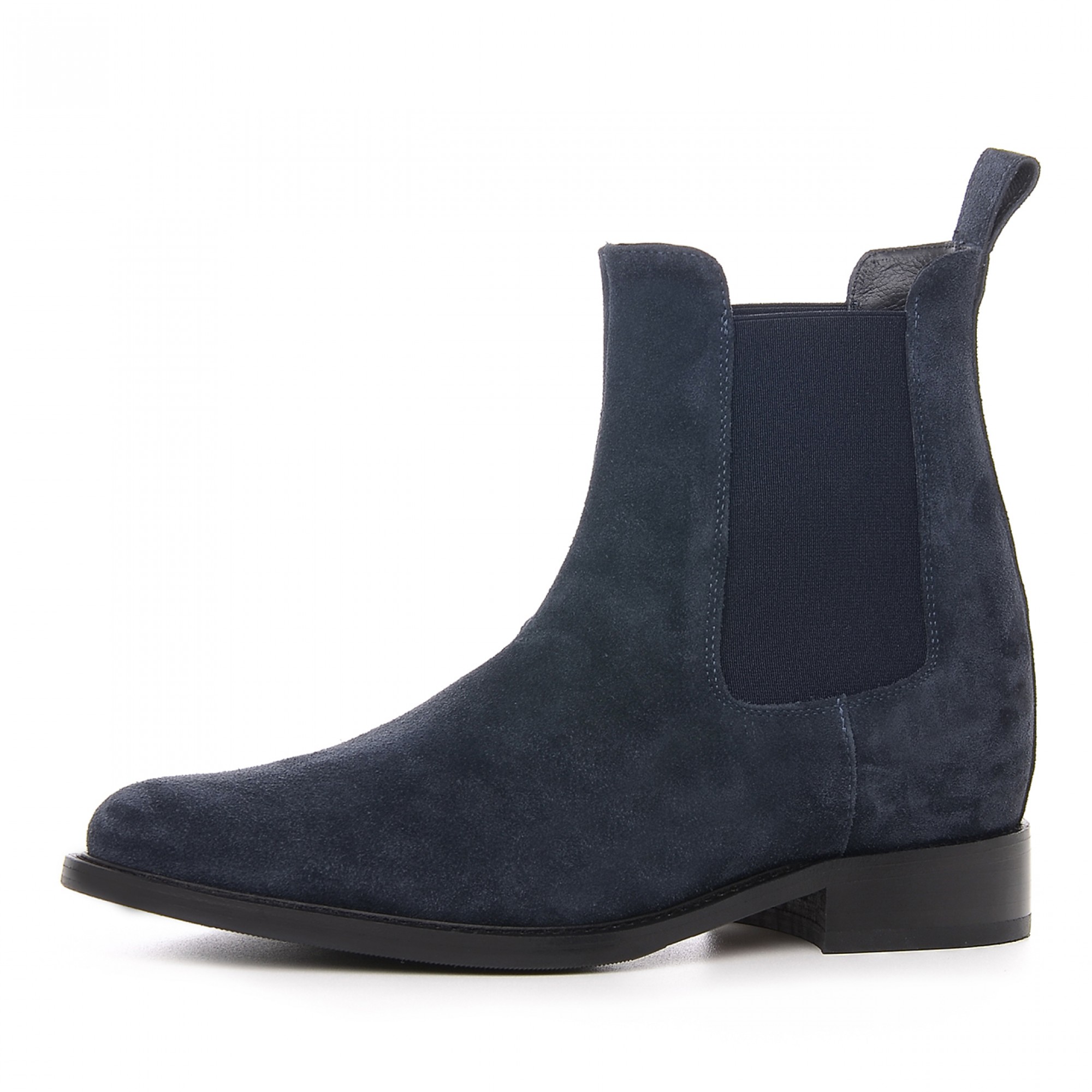 Handcrafted elevator chelsea boots in fine blue navy suede and stiched leather sole with anti slip rubber.