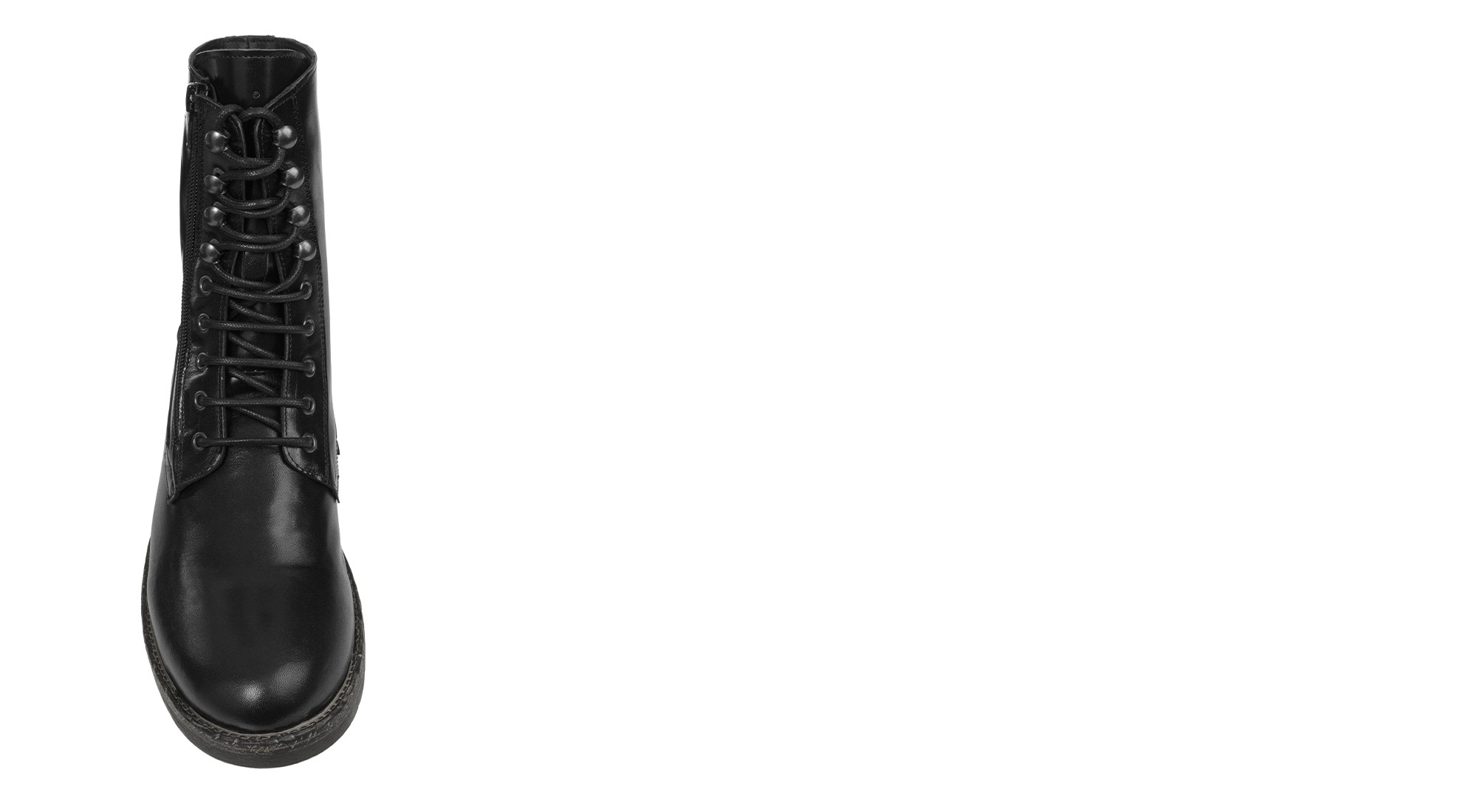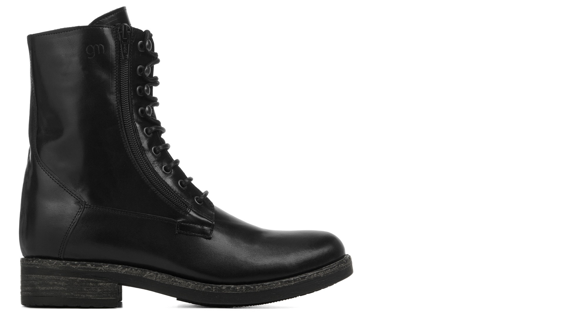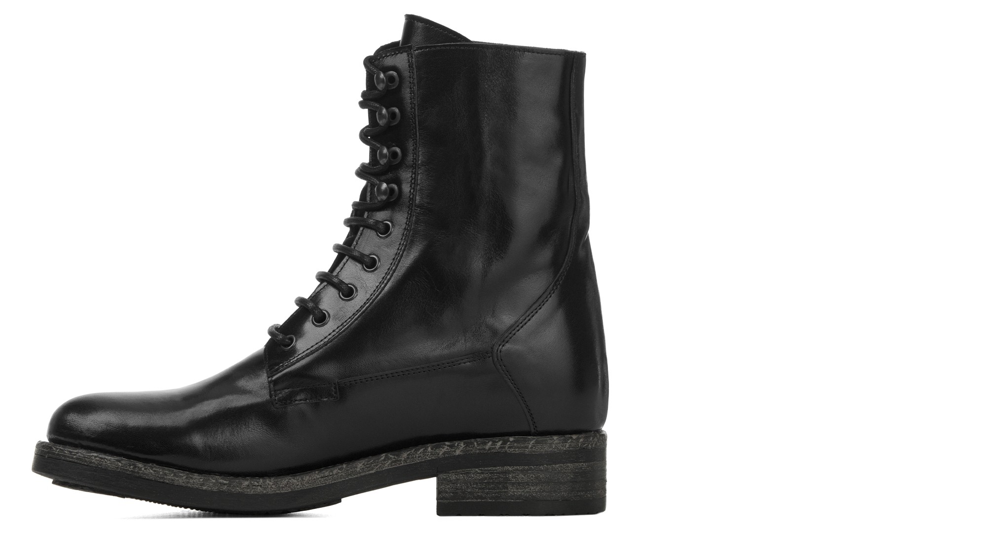 Handmade elevator boots with upper in black full grain distressed leather with an aged effect, side zip and laces. The particular vintage sole is made of natural rubber.
