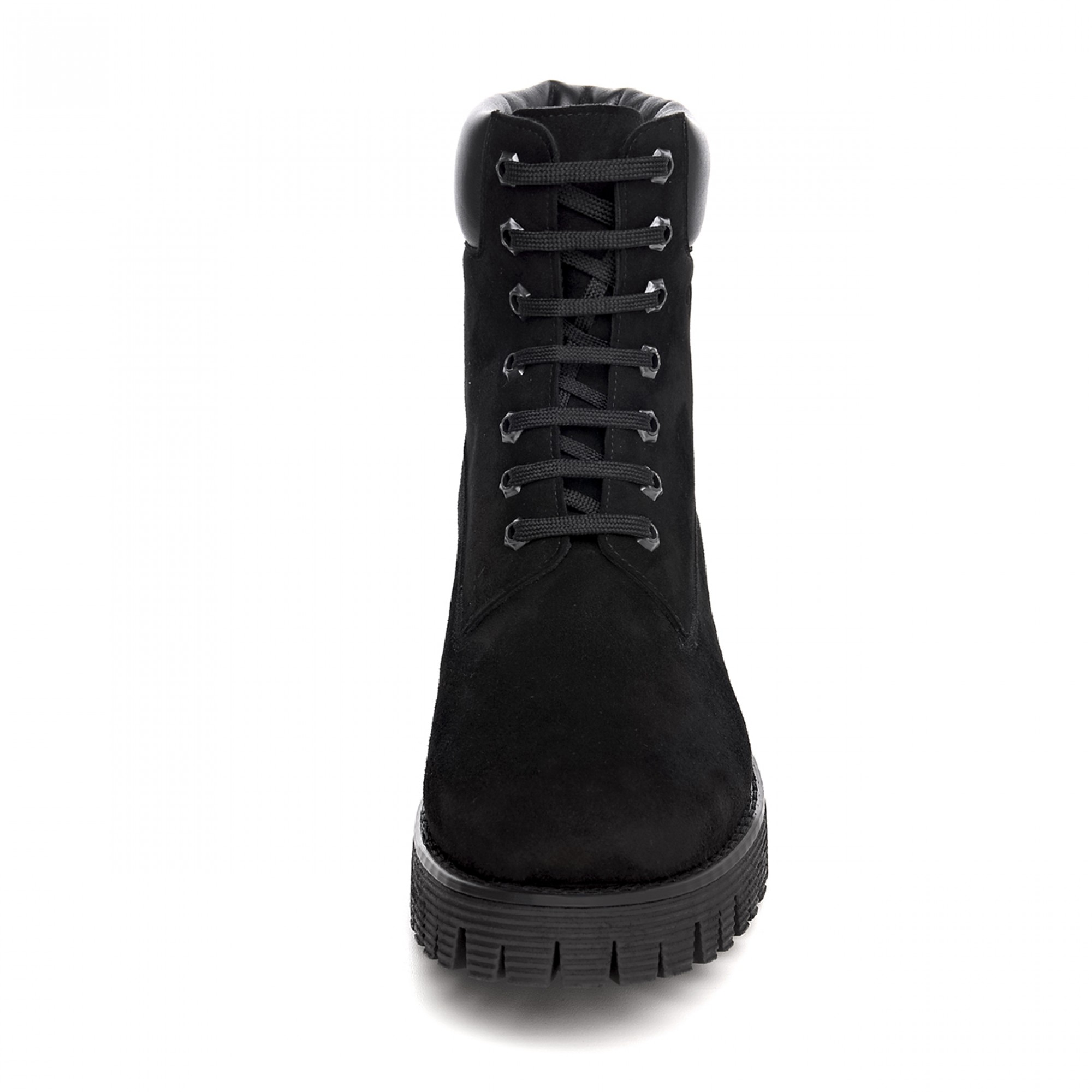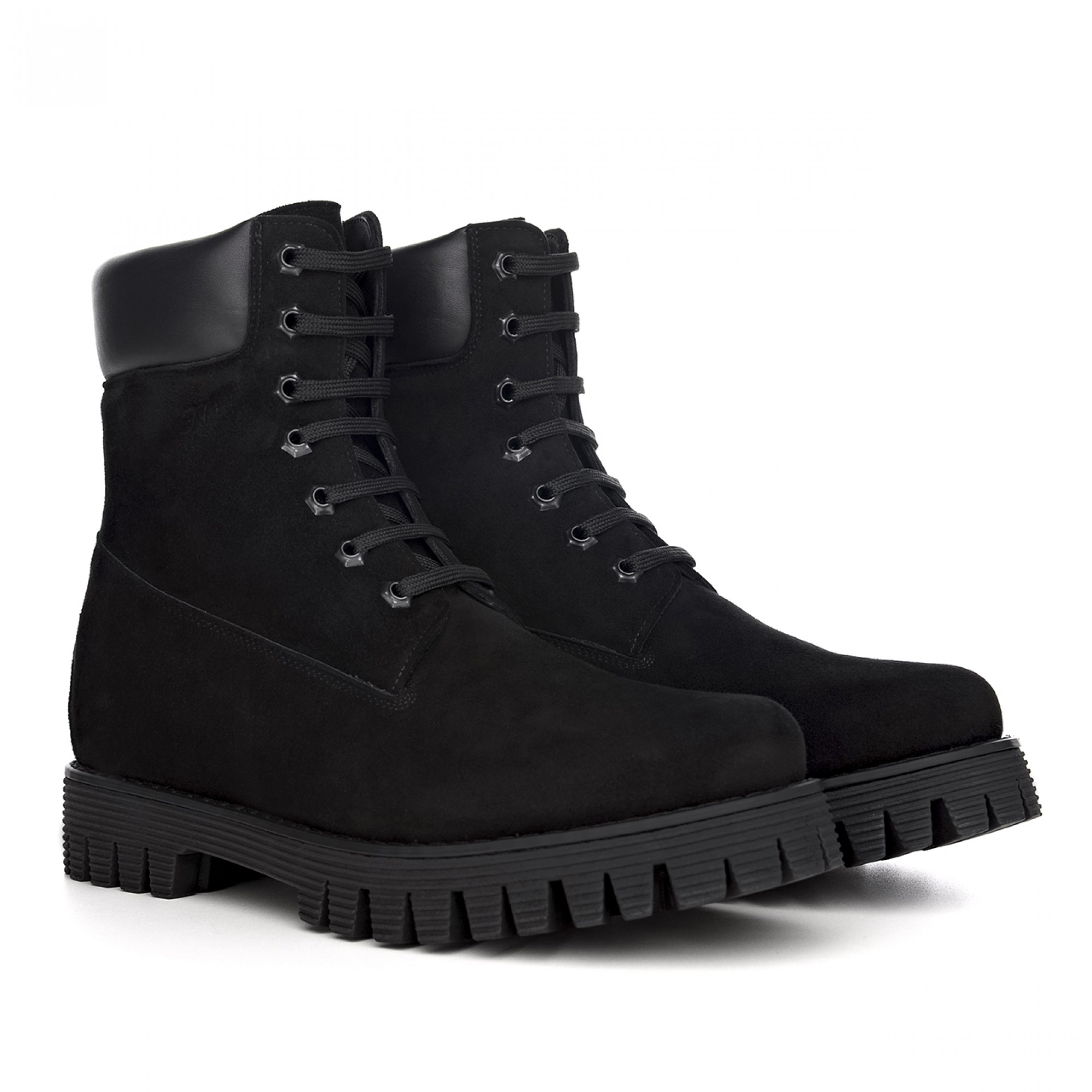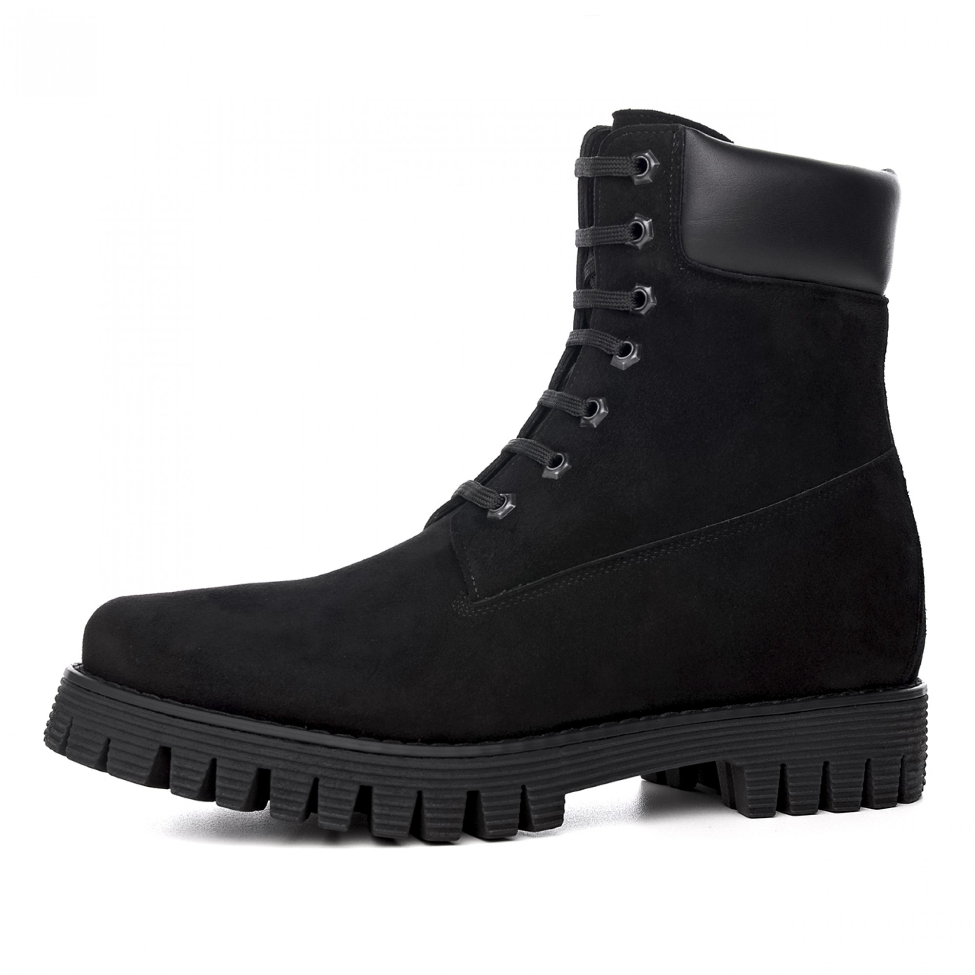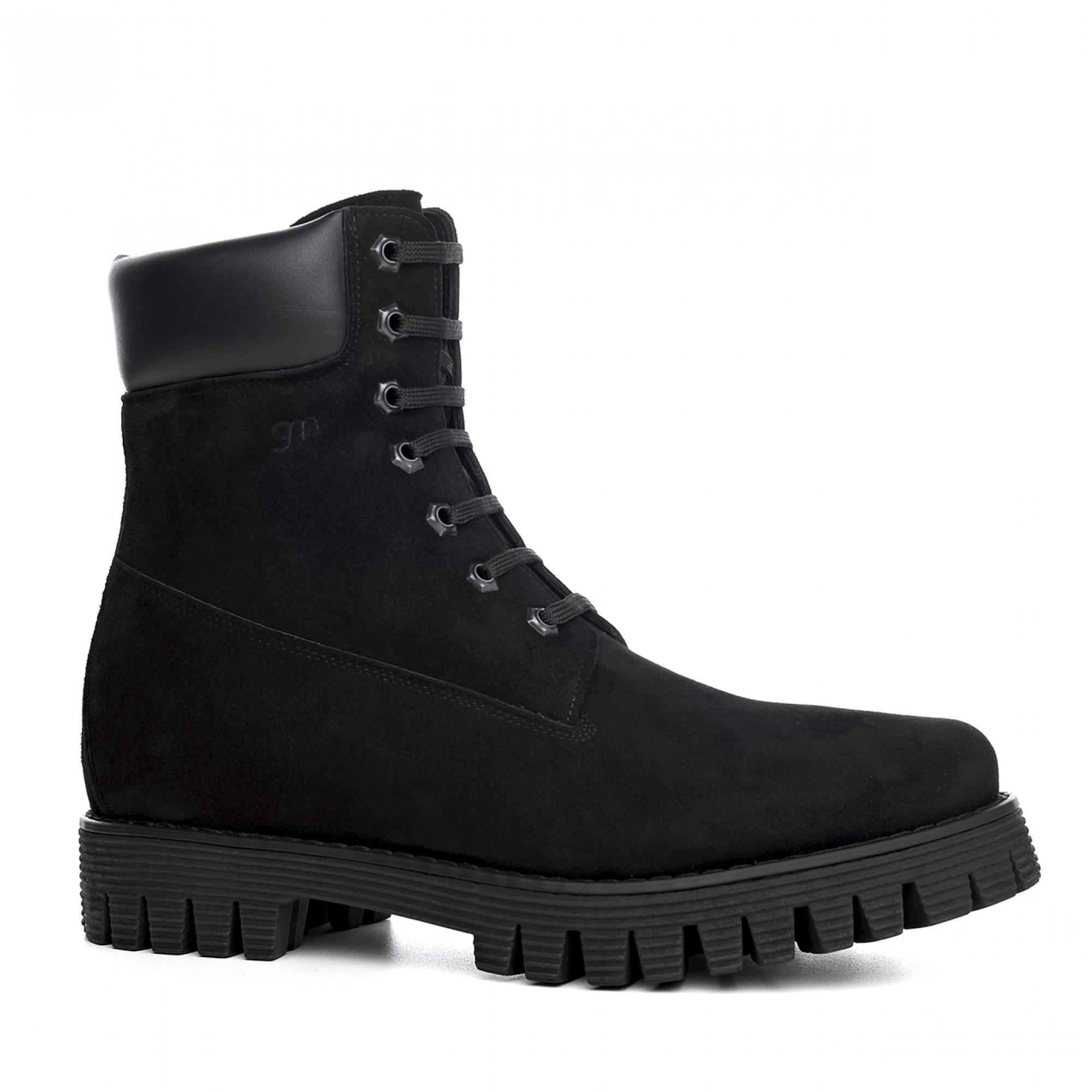 Handcrafted elevator boots with waterproof upper in fine black suede, tone-on-tone full-grain leather detail on the back and rubber sole that ensures maximum comfort and durability.
