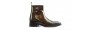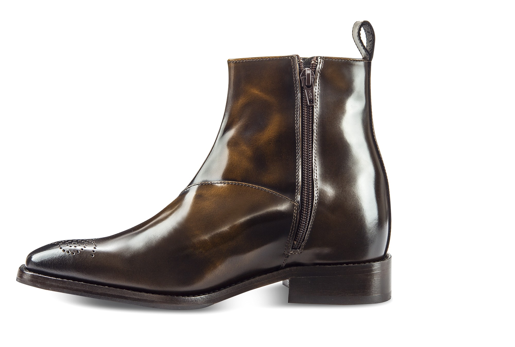 Luxury elevator chelsea boots with upper in shiny calf leather featuring warm brown tones and perforated design on the toe, brown sole in genuine leather with anti-slip rubber and zip closure.