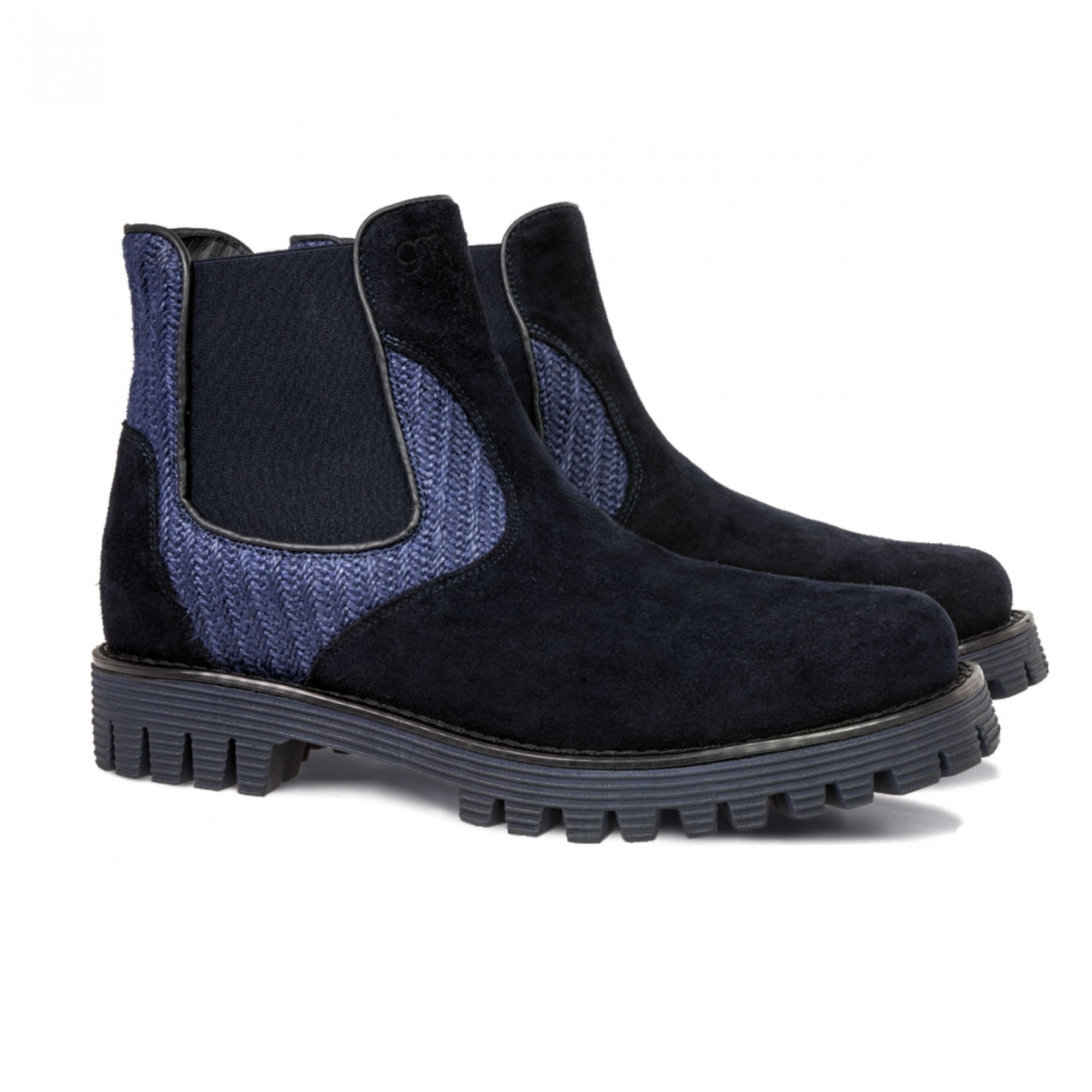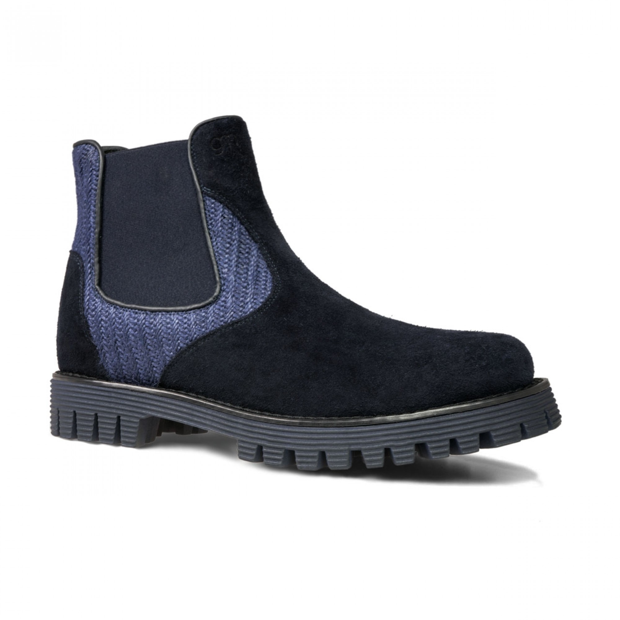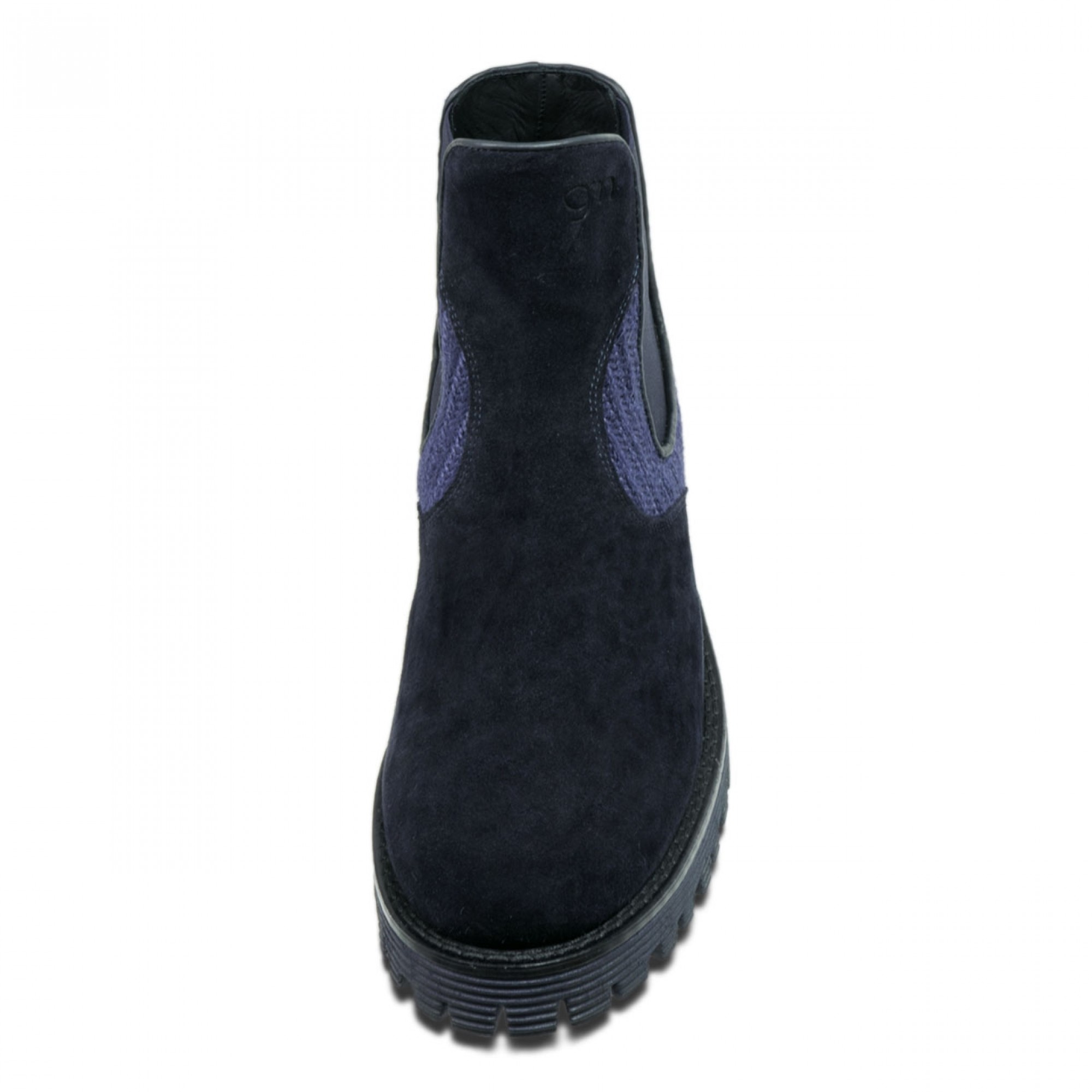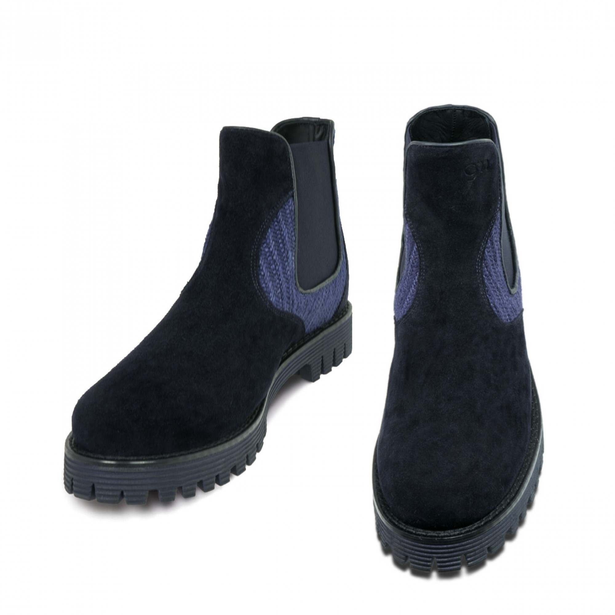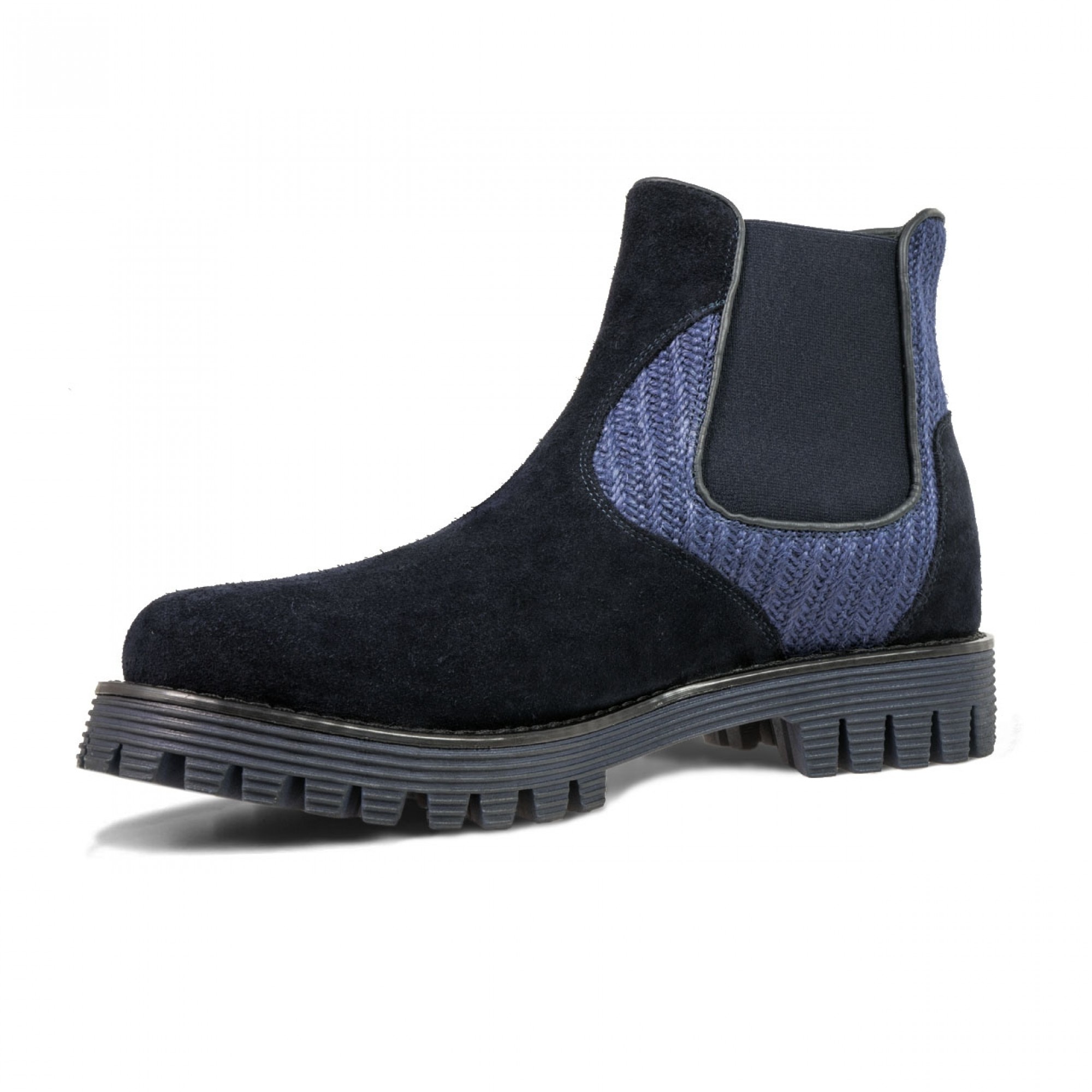 Elevator ankle boots, handmade in Italy with upper in soft blue suede and tone on tone woolen fabric on the side. The super light blue sole is made of rubber.
