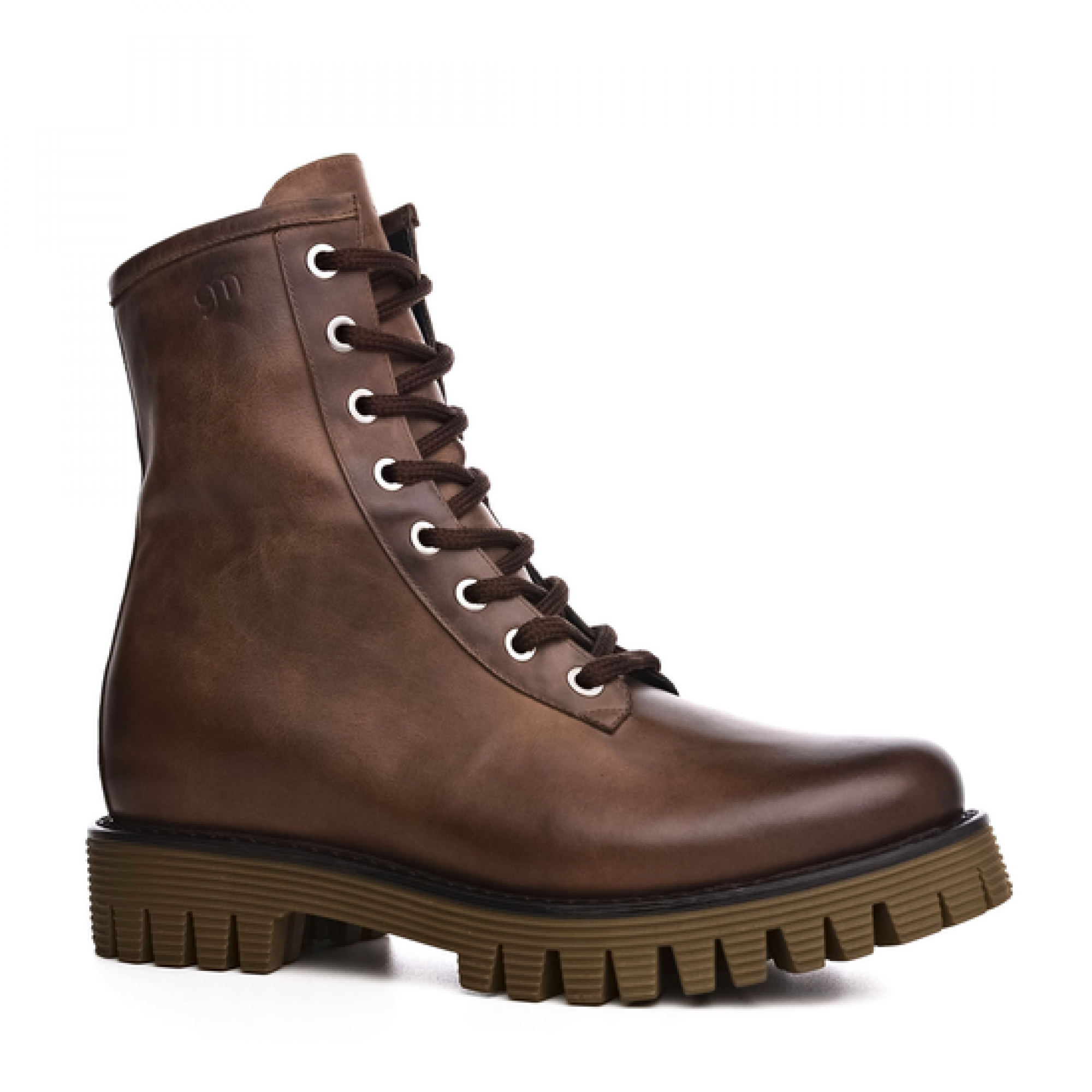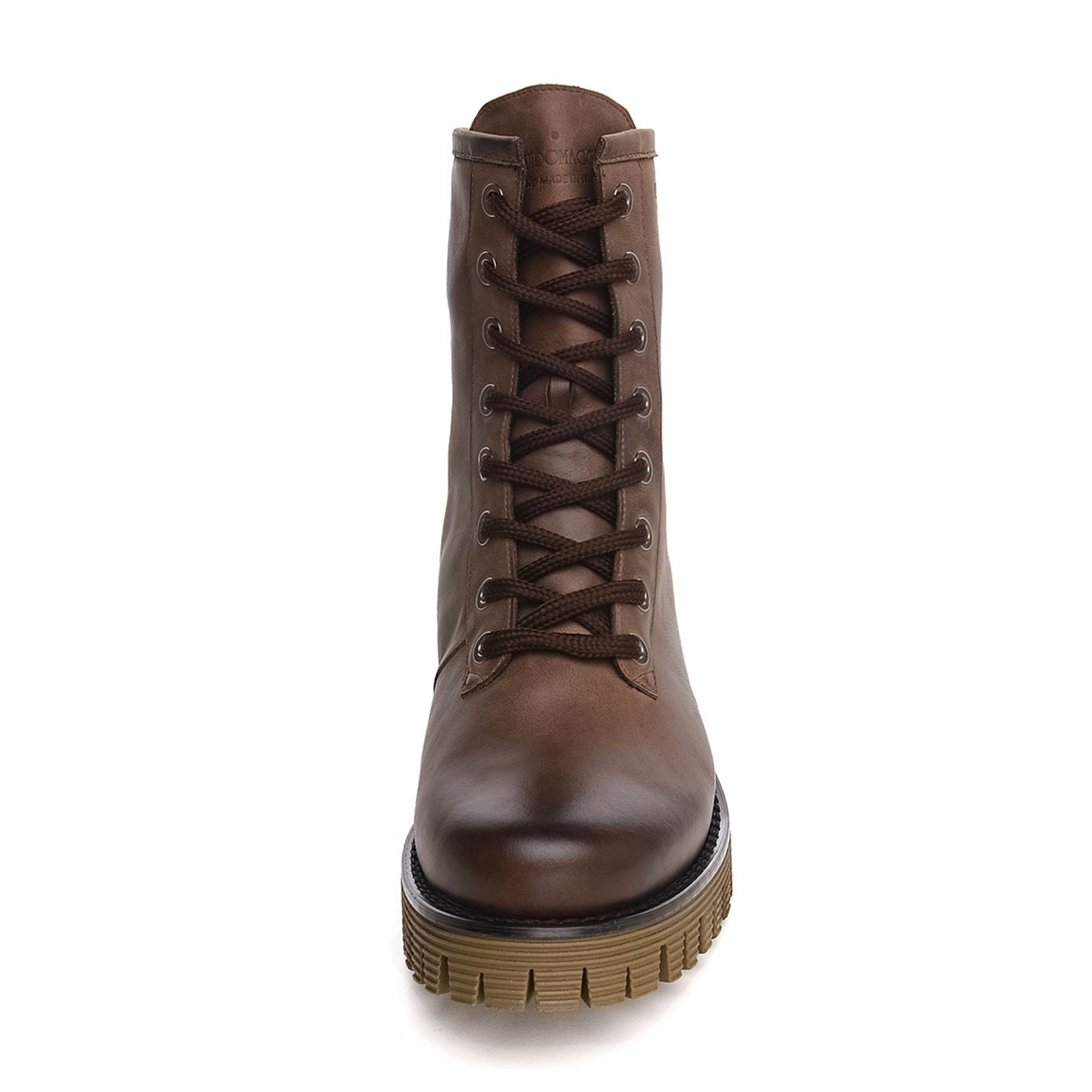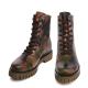 Elevator boot with upper in waxed calf leather featuring a particular brown texture with darker shades on the toe that enhance its vintage appeal. The olive-green striped rubber sole ensures maximum comfort.