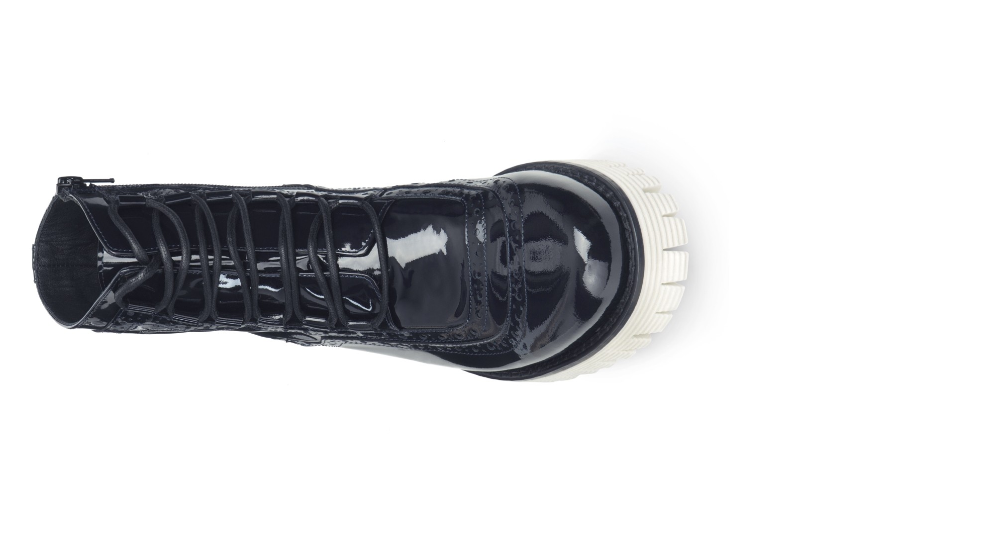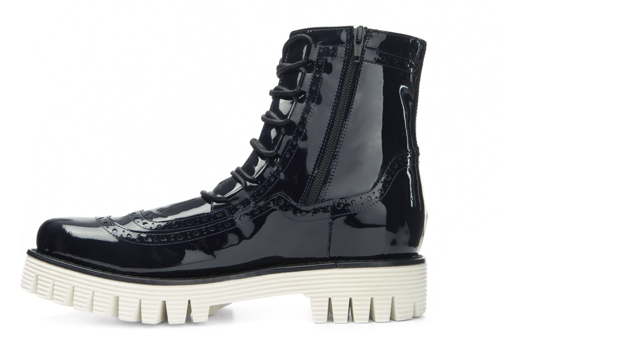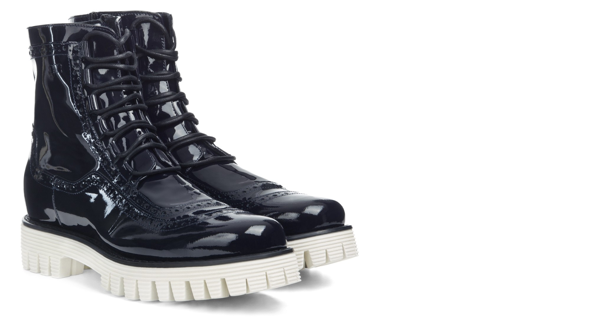 Great character and style for this elevator boot designed by GuidoMaggi. It has elegant stitching that gives it a unique chic touch, enhanced by the dark blue patent leather upper with side zip. The sole is in white super-light rubber. It's handmade, custom made, and adds up to 4.0" (10 cm) of extra height. 100% made in Italy.