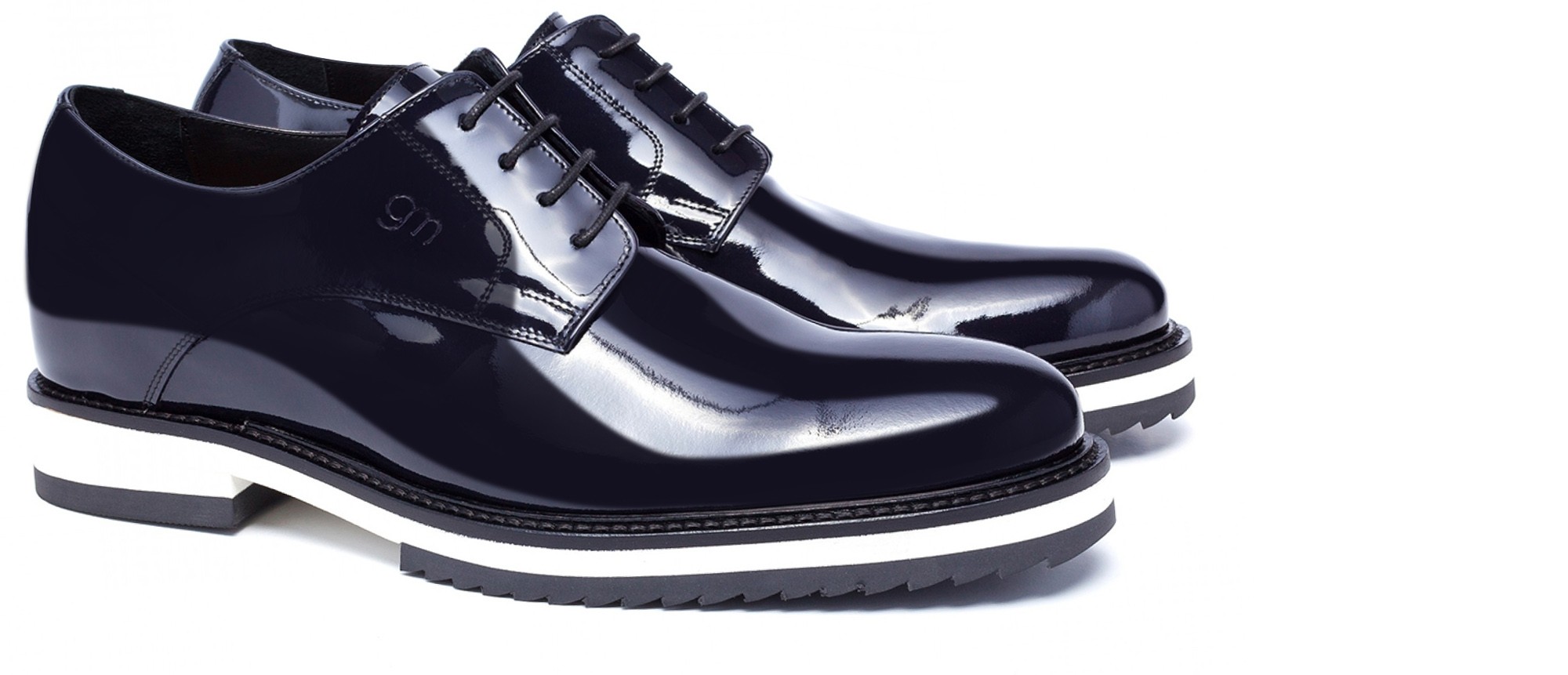 Refined and sophisticated, the new GuidoMaggi "Rue de Rivoli" dress shoes stand out immediately for their gleam and their patent leather dark blue nuance given by the soft upper in calfskin leather. The lightweight antislip rubber sole, handcrafted, white with accurate black details, will make an impression with every step.