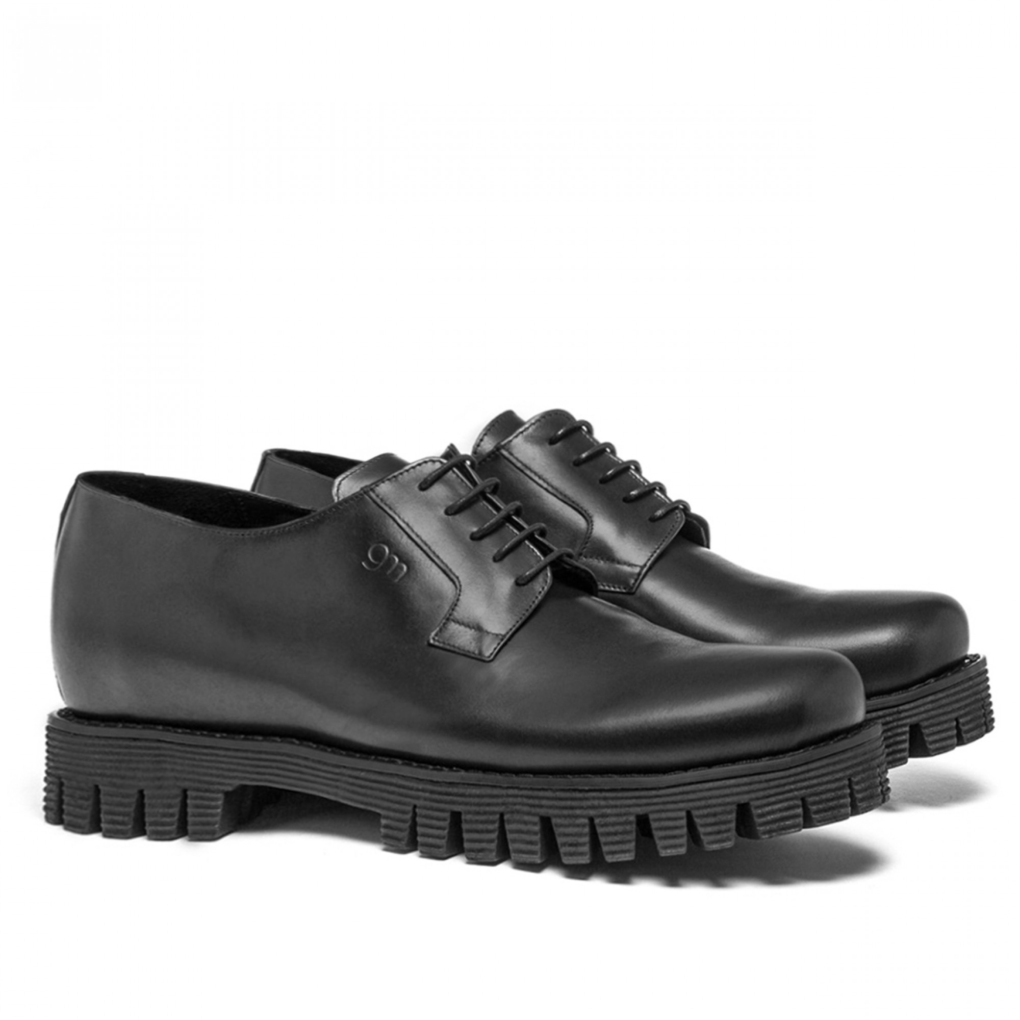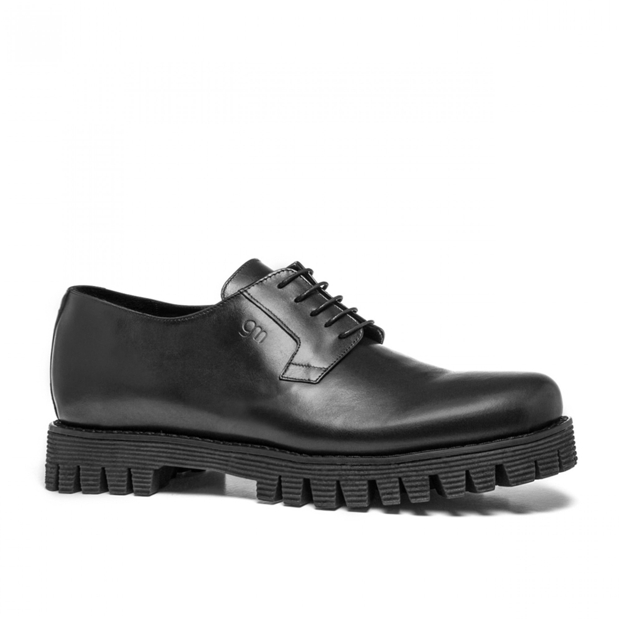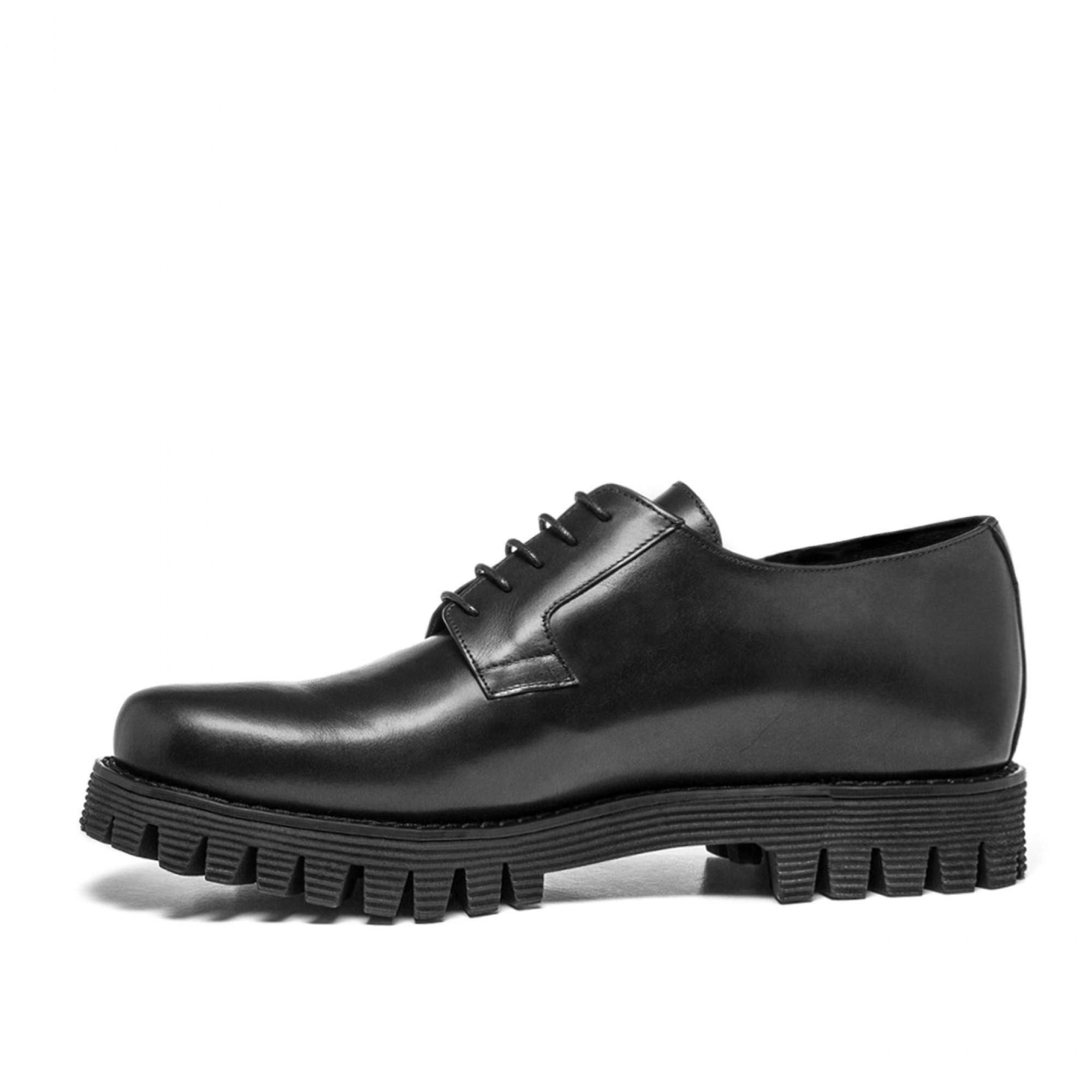 Exclusive elevator derby shoes with upper in black full-grain leather, handcrafted, characterized by the new comfortable, cushioned tank thread outsole, striped black, in 100% natural rubber.