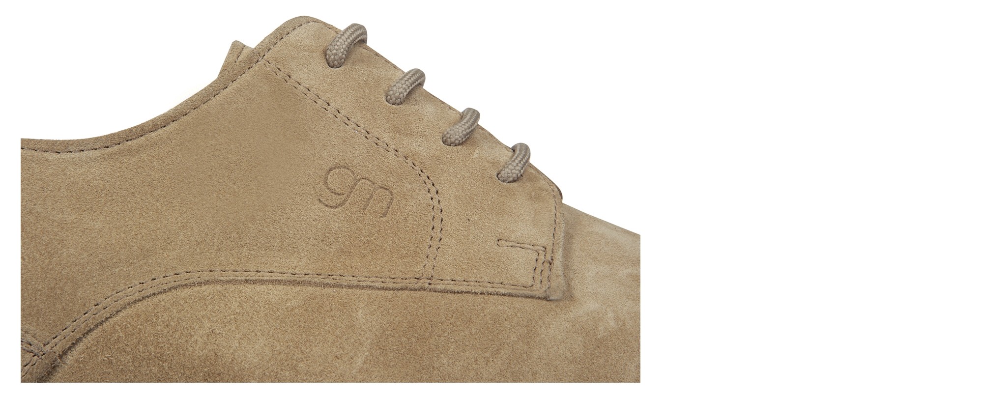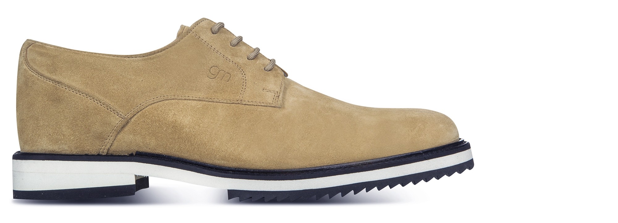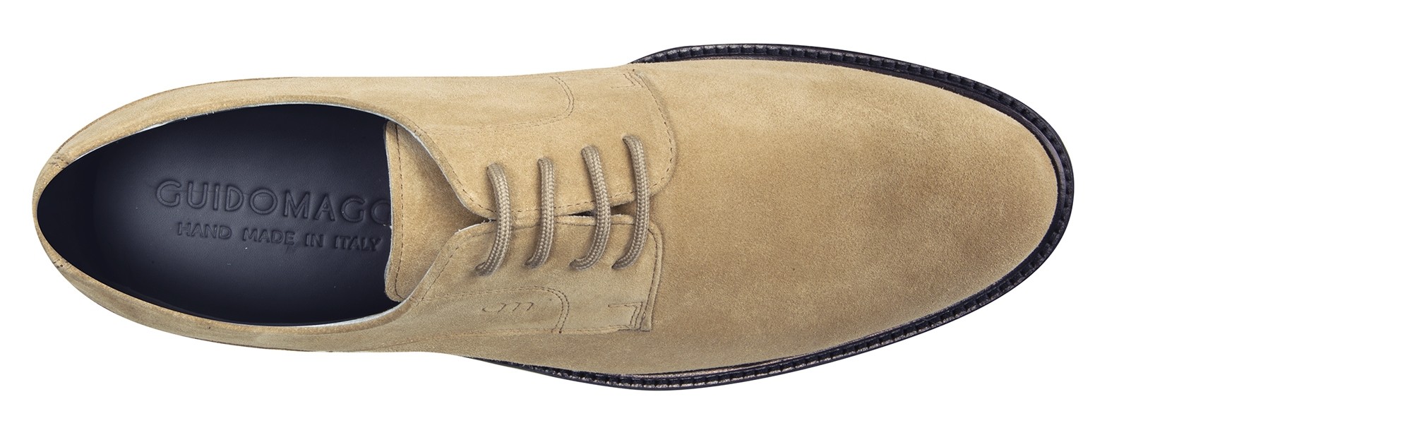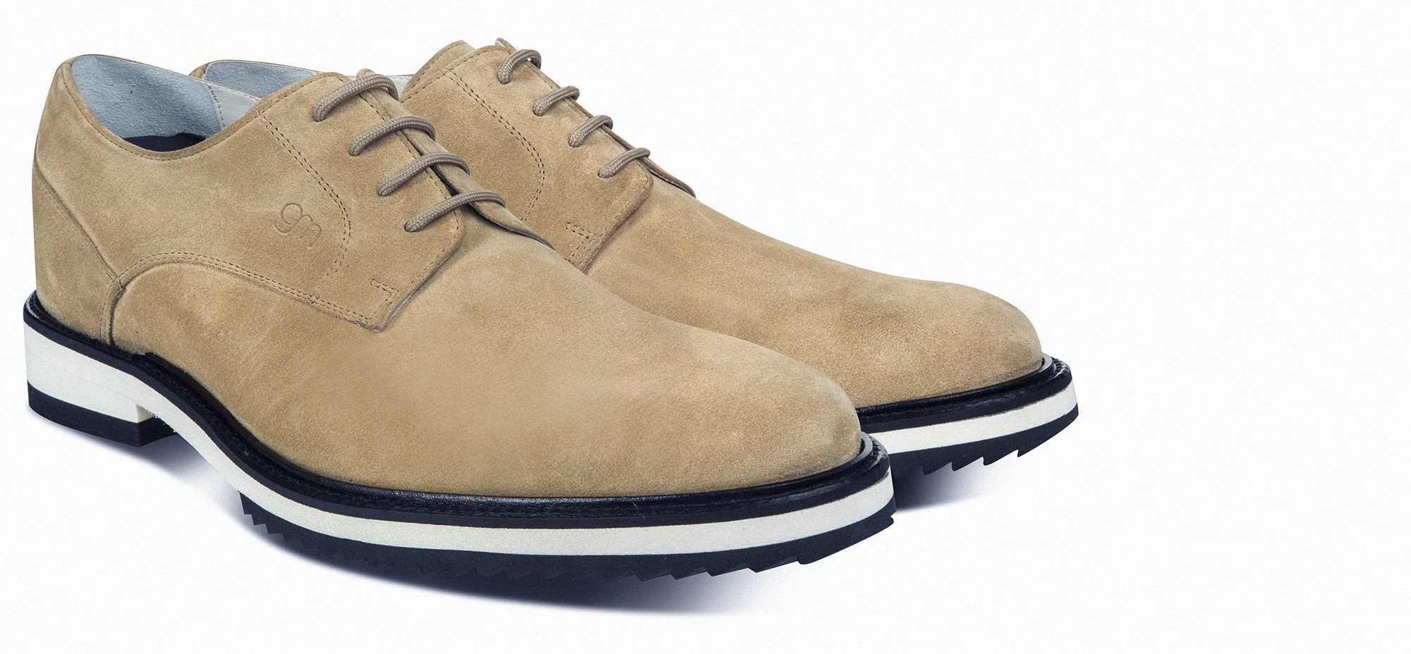 The new spring summer elevator shoes by GuidoMaggi are handmade in sand suede calfskin and two-tone black and white natural rubber sole.