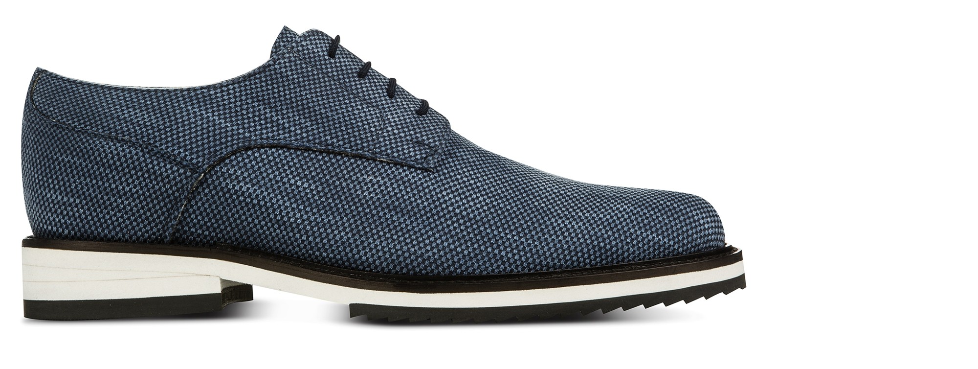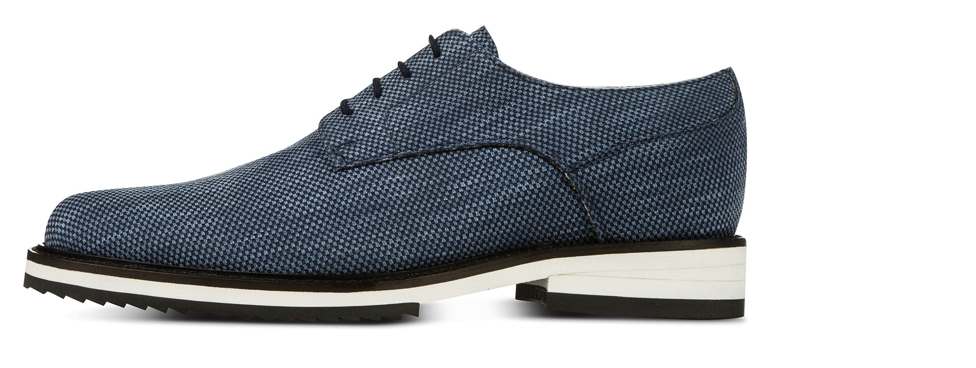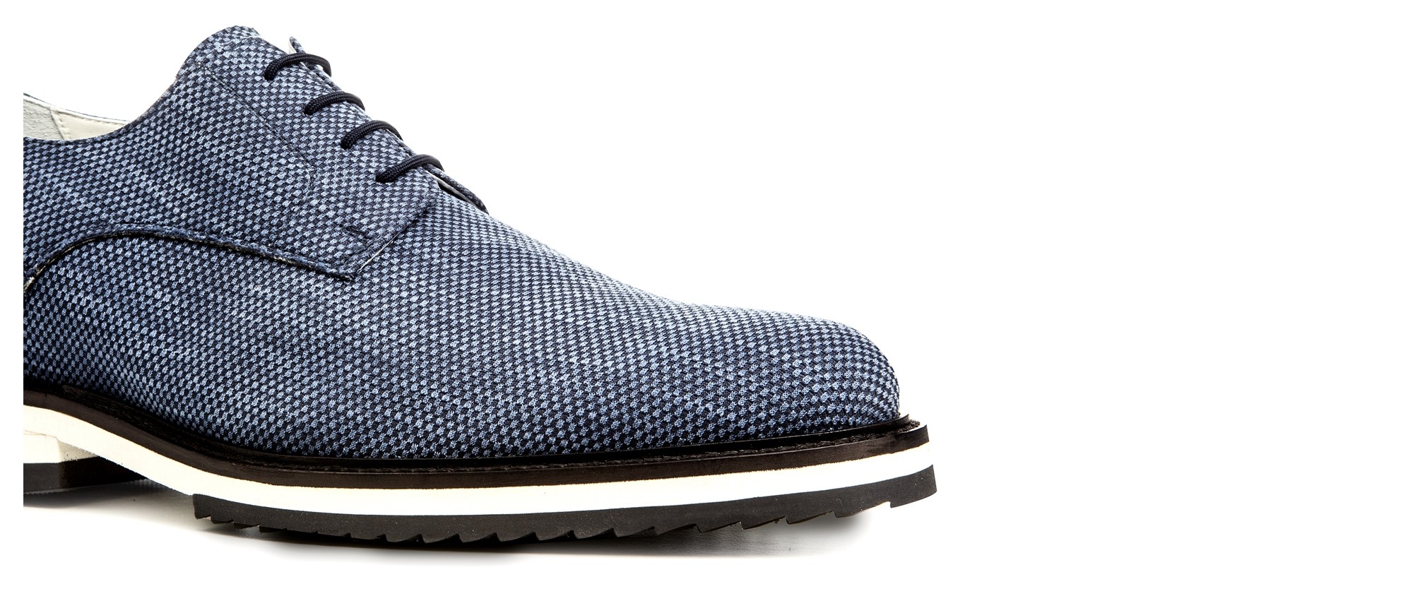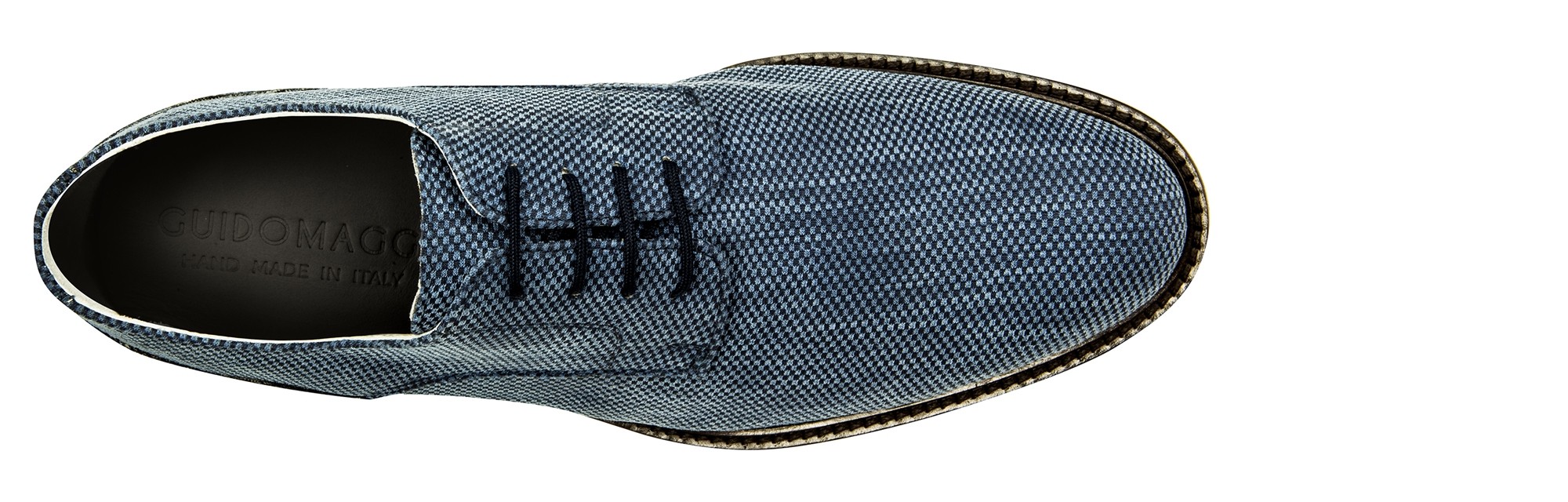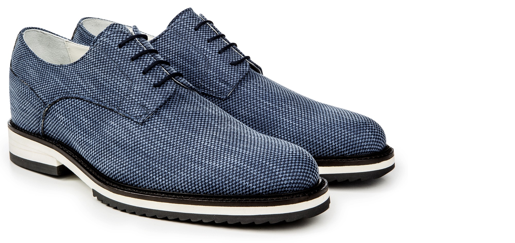 Contemporary elegance is the essence of this new elevator derby from the spring-summer collection by GuidoMaggi. The elevator shoe, handmade and tailored by the master craftsmen of the Lecce Maison, has an upper made entirely of organic cotton in a clear sky blue nuance.