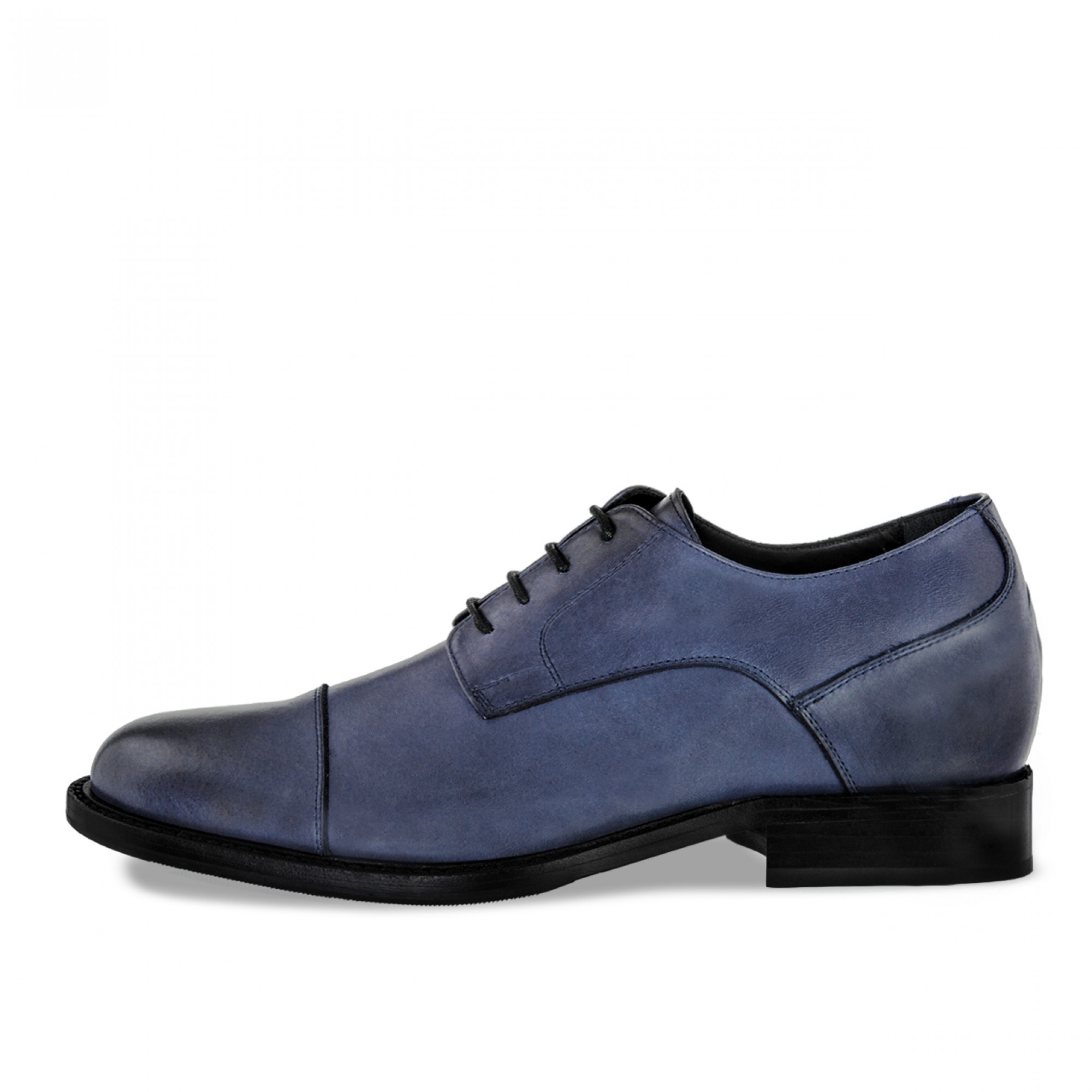 Luxury elevator derby shoes with upper in hand-painted calfskin featuring a coral blue colour with black shades and stiched leather sole with anti slip rubber.