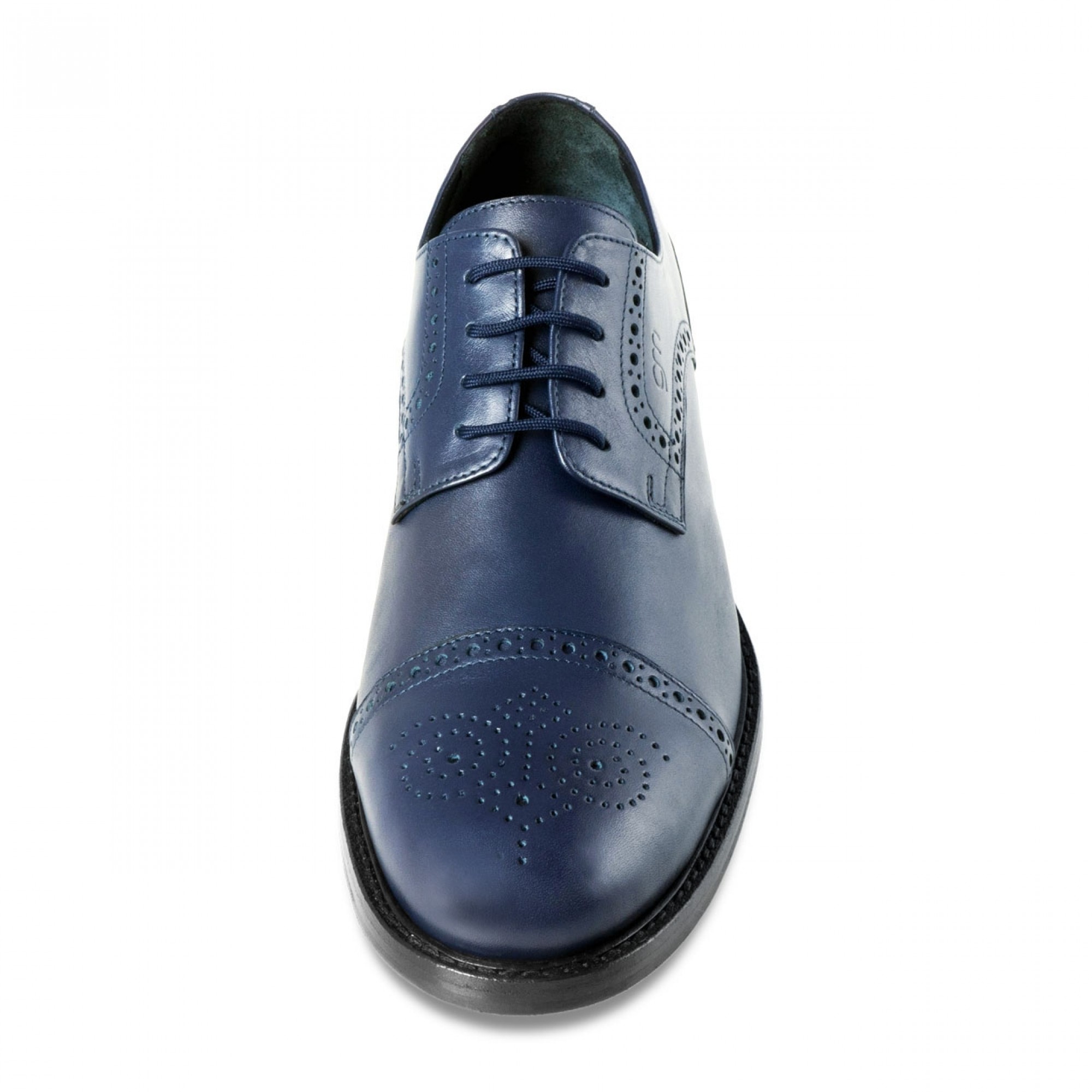 Classic elevator derby shoe featuring upper in blue full grain vegetable tanned leather and stiched leather sole with anti slip rubber.