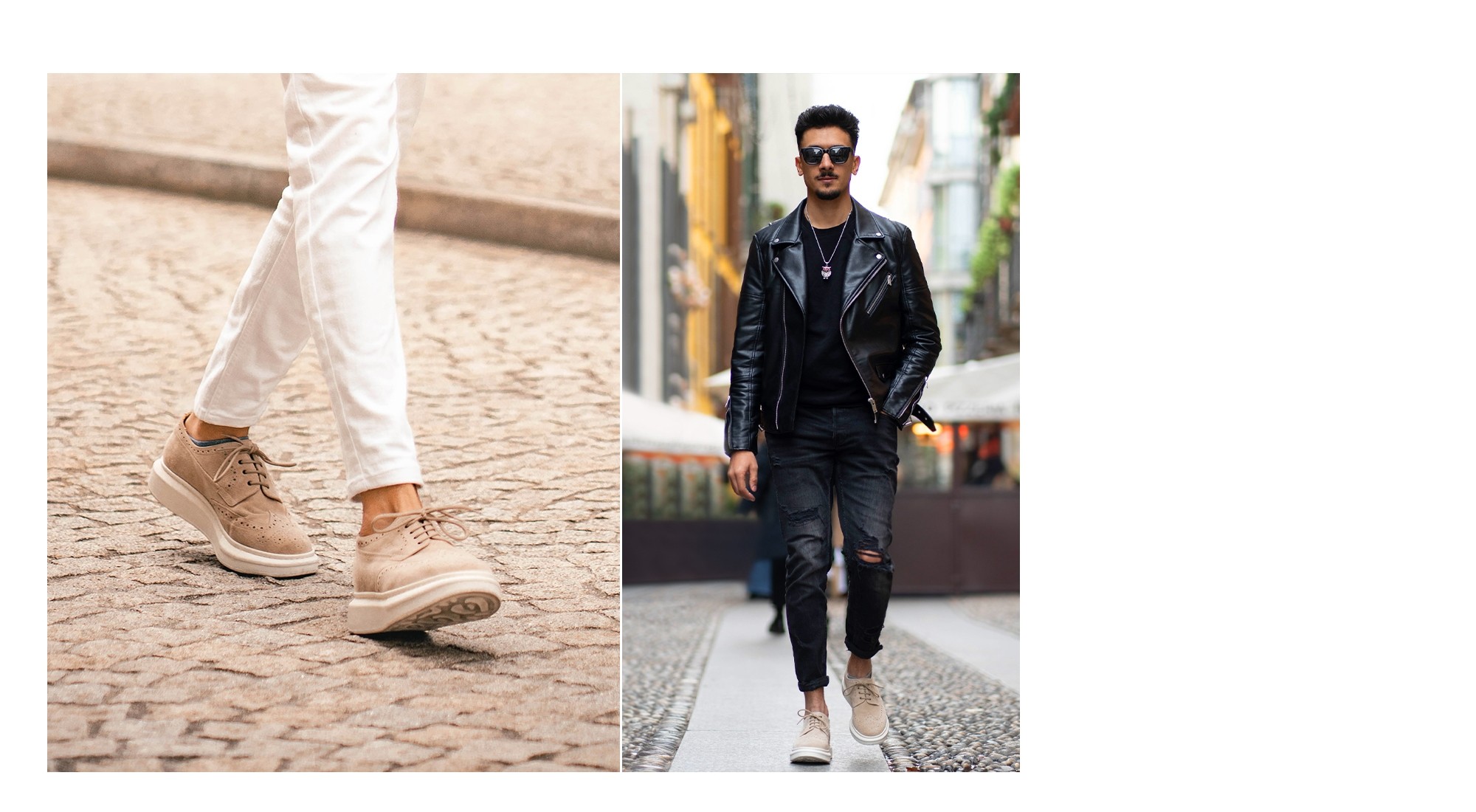 A hybrid, unique and exclusive model that combines the dynamism and comfort of a sneaker sole with the classic elegance of the English brogue. The touch of class is the derby lacing that defines its character and personality. The brown sole is in super-light rubber, the upper in beige suede calfskin with handmade stitching and dovetail decoration. Ideal for any outfit, it gives up to 3.1 inches (8 centimeters) more in height. Handmade in Italy.
