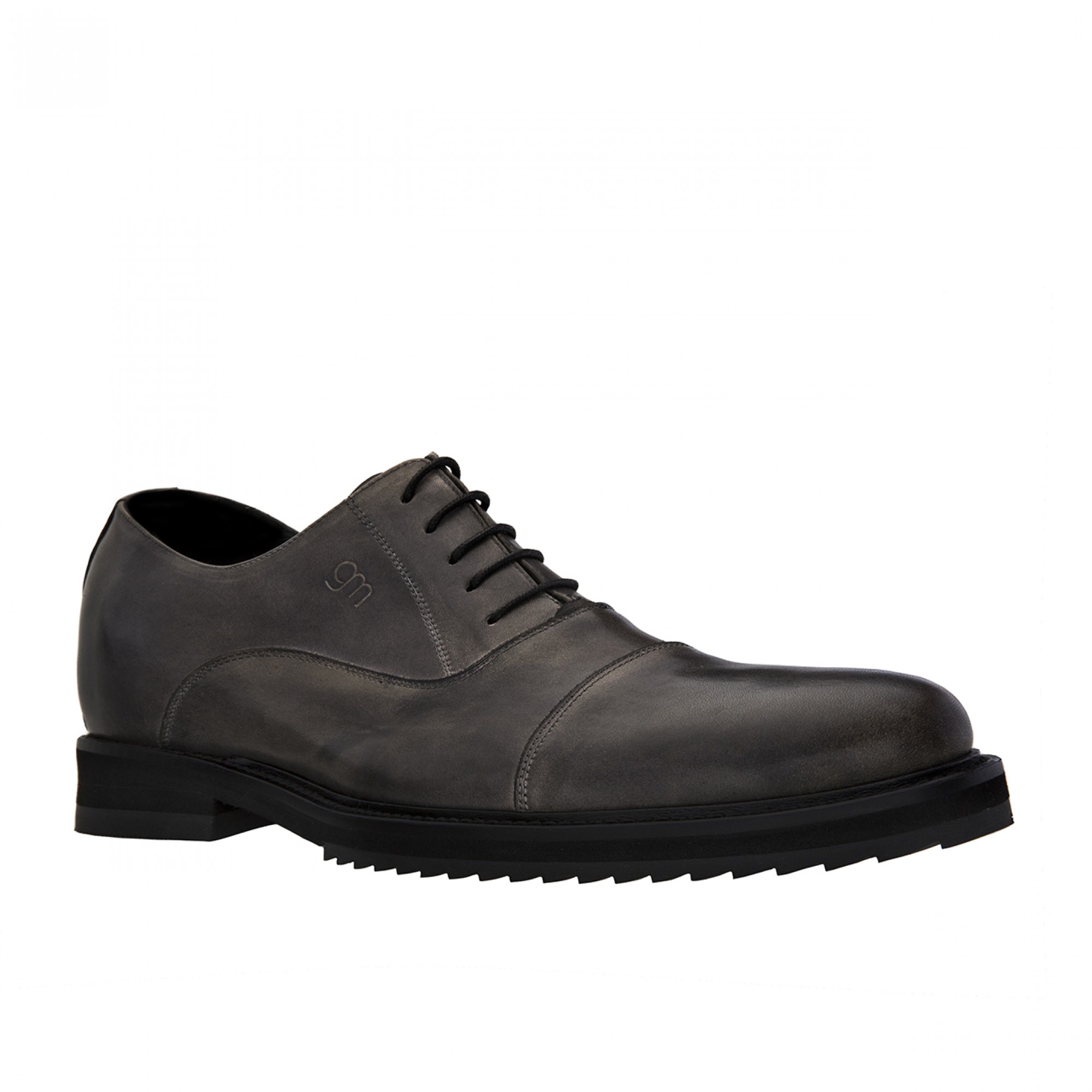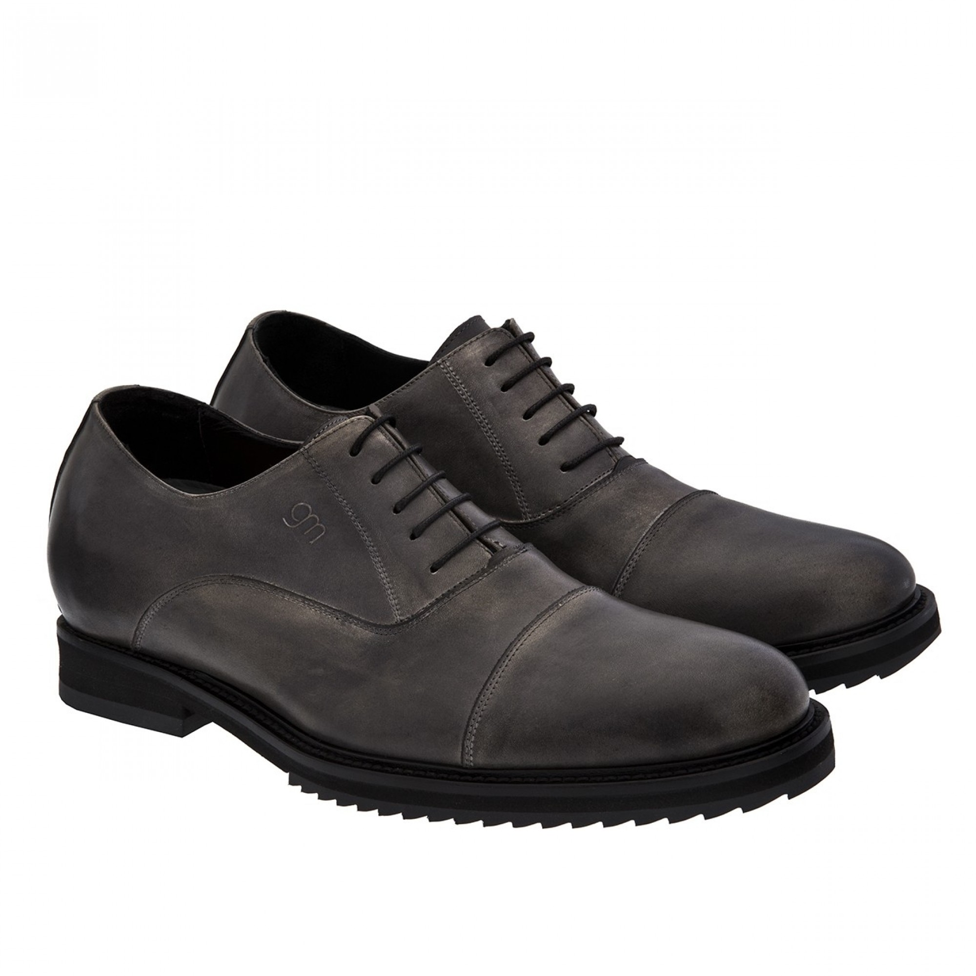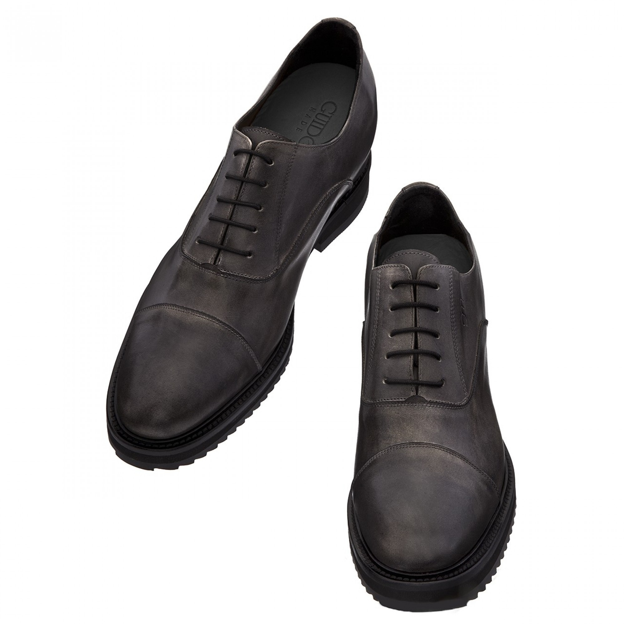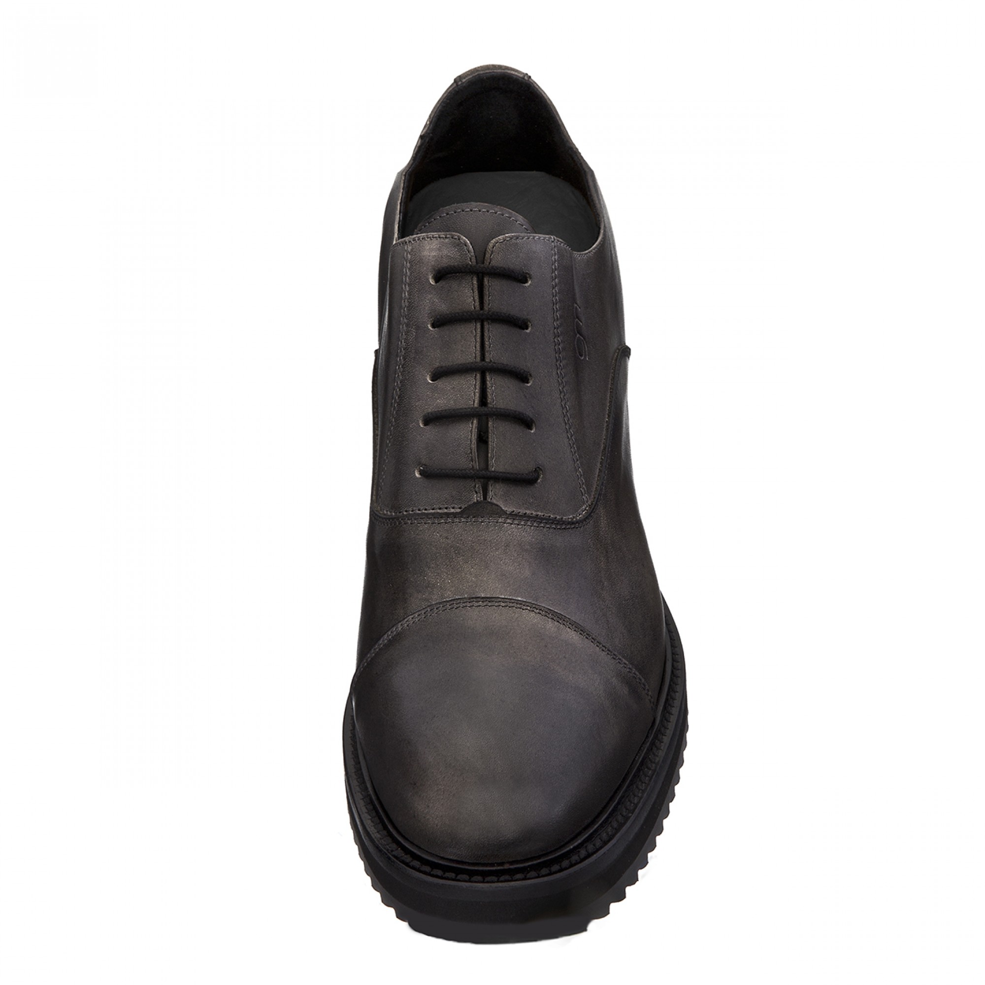 Elevator oxford shoe with upper in dark gray calfskin leather ,buffered by hand to give it an "aged" effect, with delicate graded shades. A shoe with inner height increaser from 2.4 to 3.1 inches, of an absolute exclusivity, ideal to make any outfit elegant and refined.