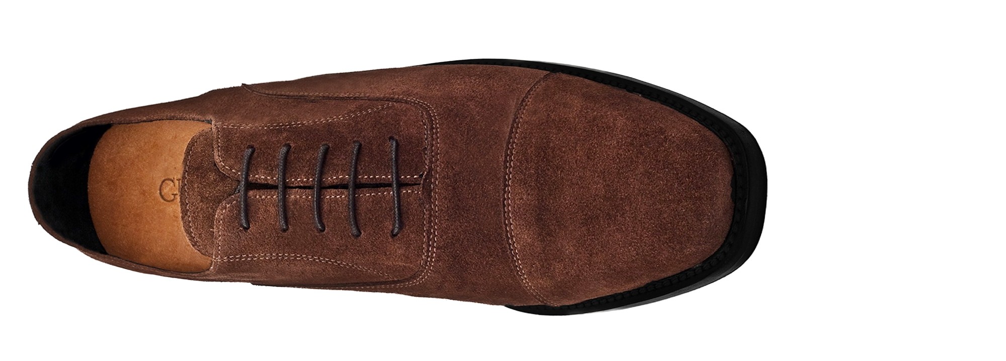 Upper in dark brown suede calf leather. Lining in soft goatskin. Upper leather, outsole and midsole are sewn at sight. Insole and midsole in genuine leather. Cotton waxed shoe laces. Handcrafted leather outsole with special anti-slip rubber. Height increase: 2.4 in(6cm) or 2.75in(7cm) or 3.1in(8cm). Hand Made in Italy