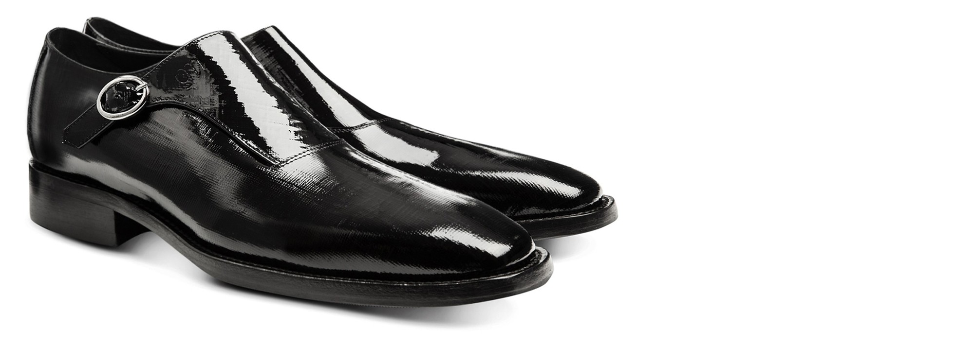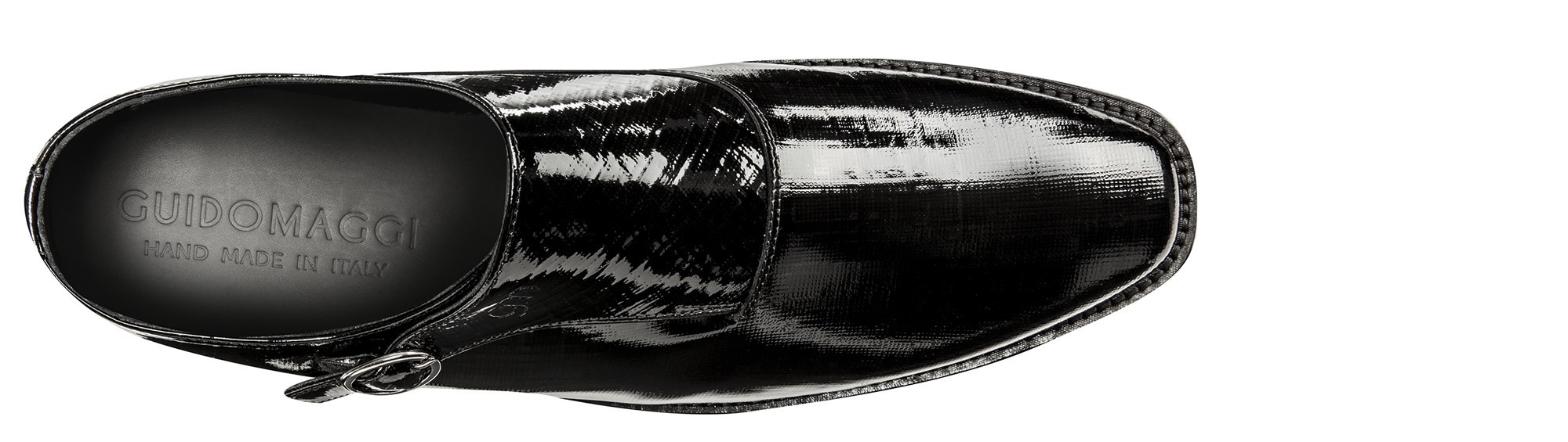 Pure elegance, character and charm for this elevator monkstrap by GuidoMaggi, with a black patent leather upper with a unique iridescent effect and square toe. The sole is in genuine Italian leather with anti slip rubber. A masterpiece of style, handcrafted by GuidoMaggi expert artisans, suitable for ceremonies or special events: this elevator dress shoe emphasizes a unique and unmistakable style and is able to increase the height of the wearer up to 3.1 inches (8 cm). 100% Handmade in Italy