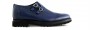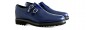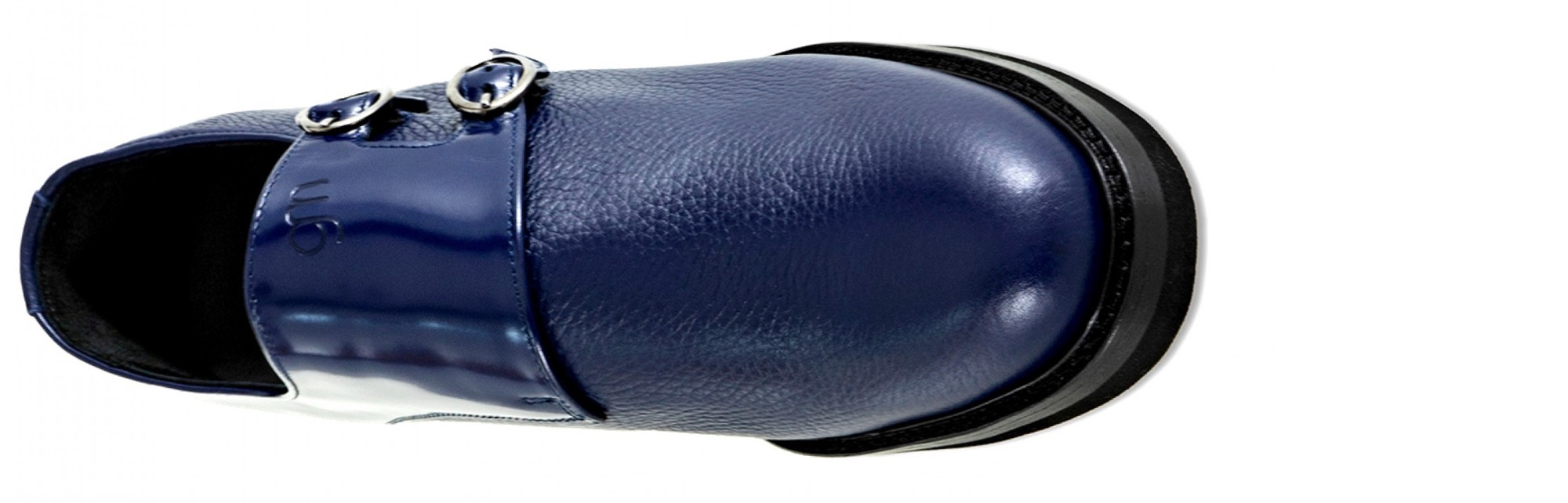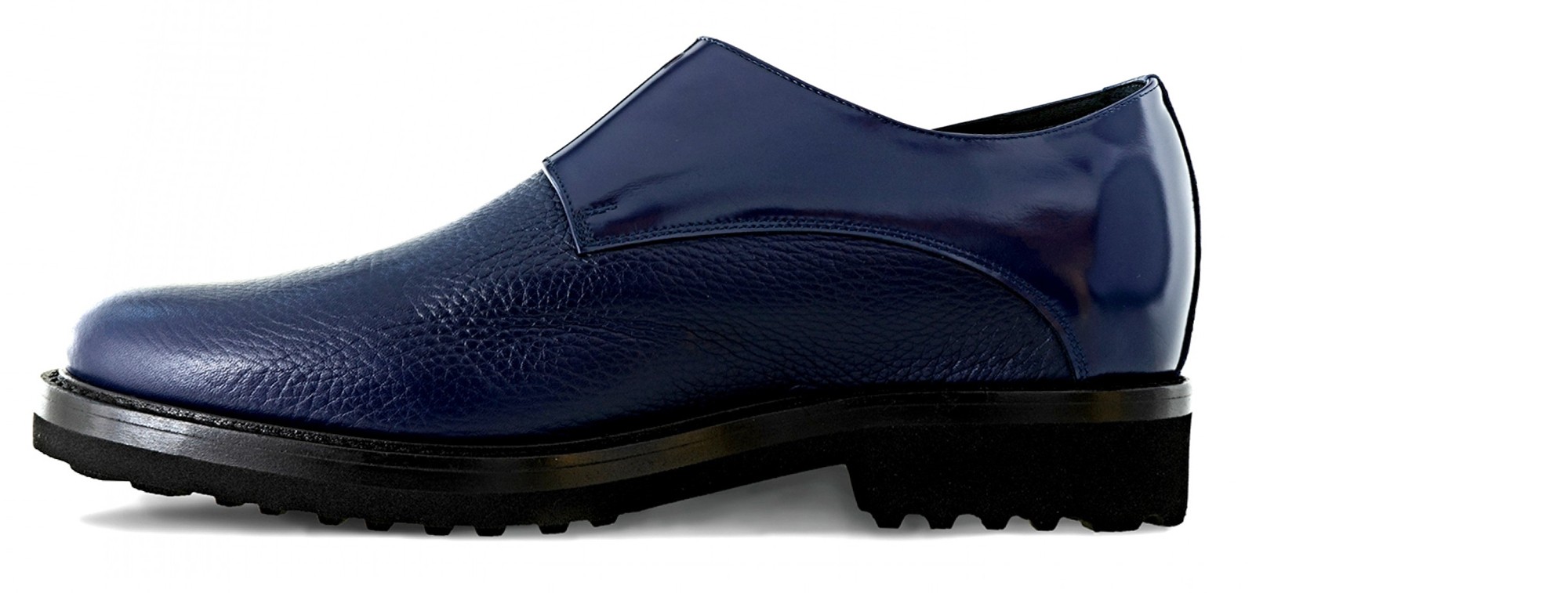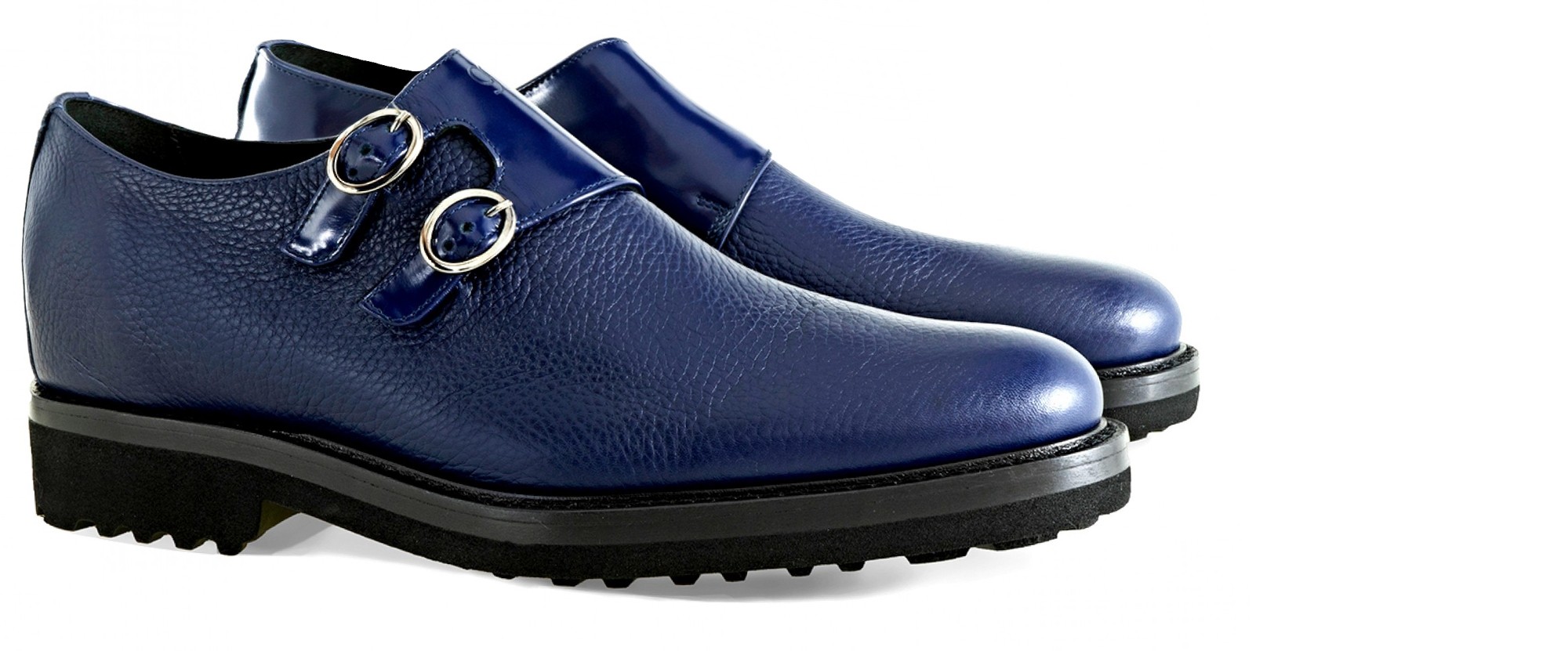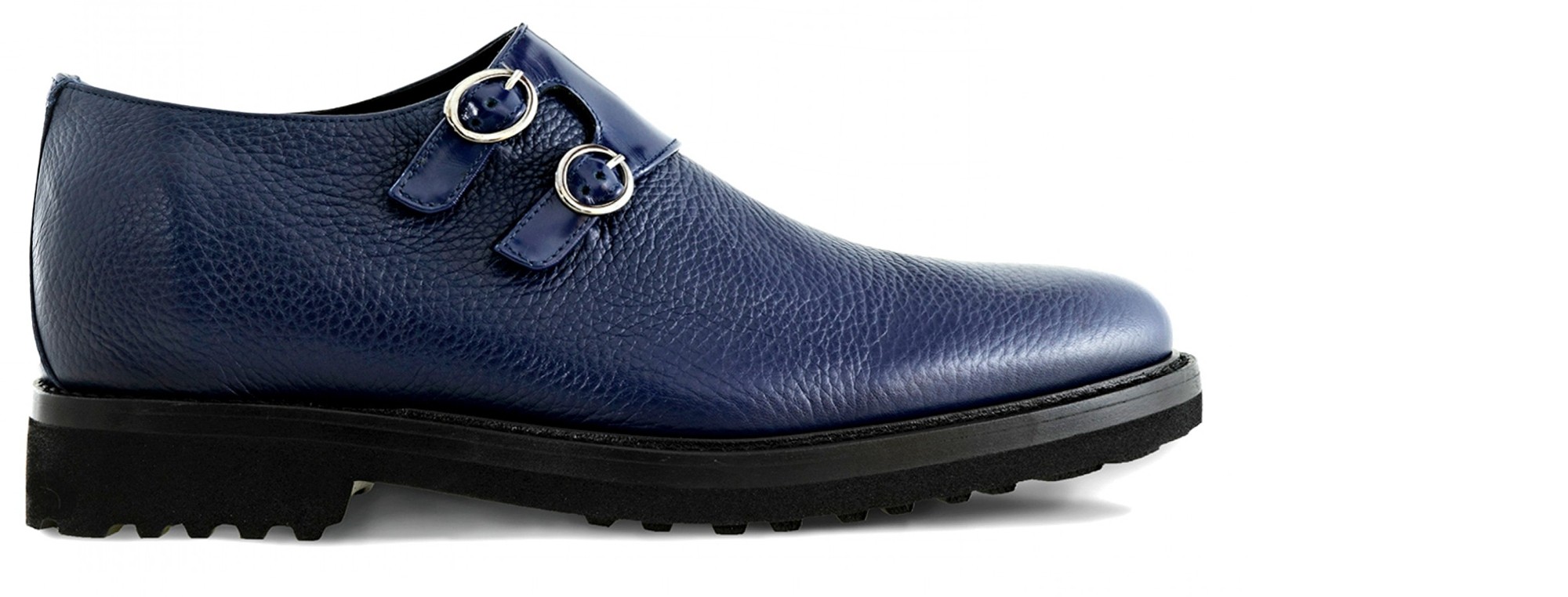 Elevator double buckle shoe with upper made of two fine leathers: blue tumbled calfskin and tone-on-tone shiny calfskin. Clean and refined lines for a meticulously detailed classic elevator shoe.