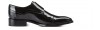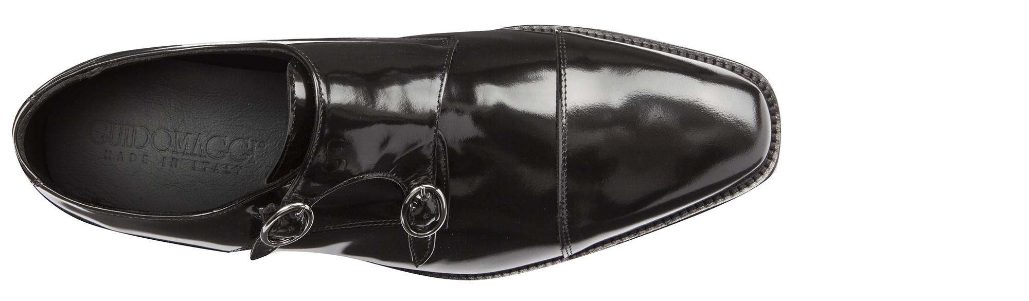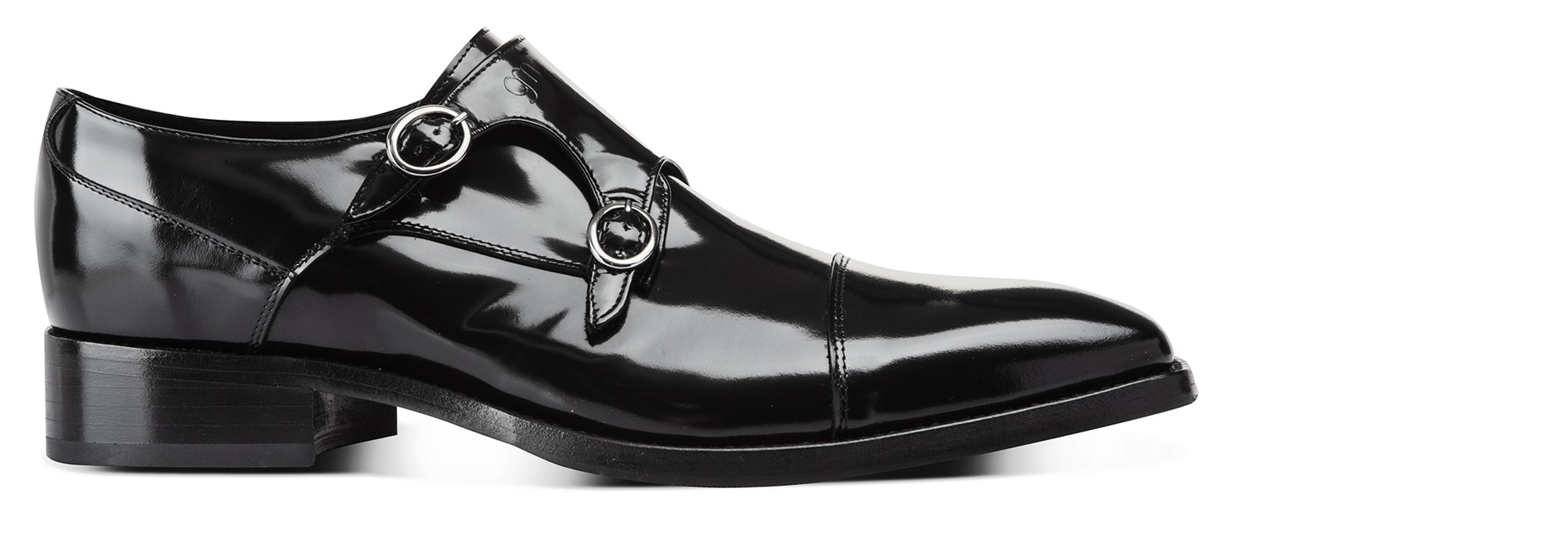 Classic and elegant double monk strap elevator shoes with upper made of black shiny calfskin and stiched leather sole with anti slip rubber.