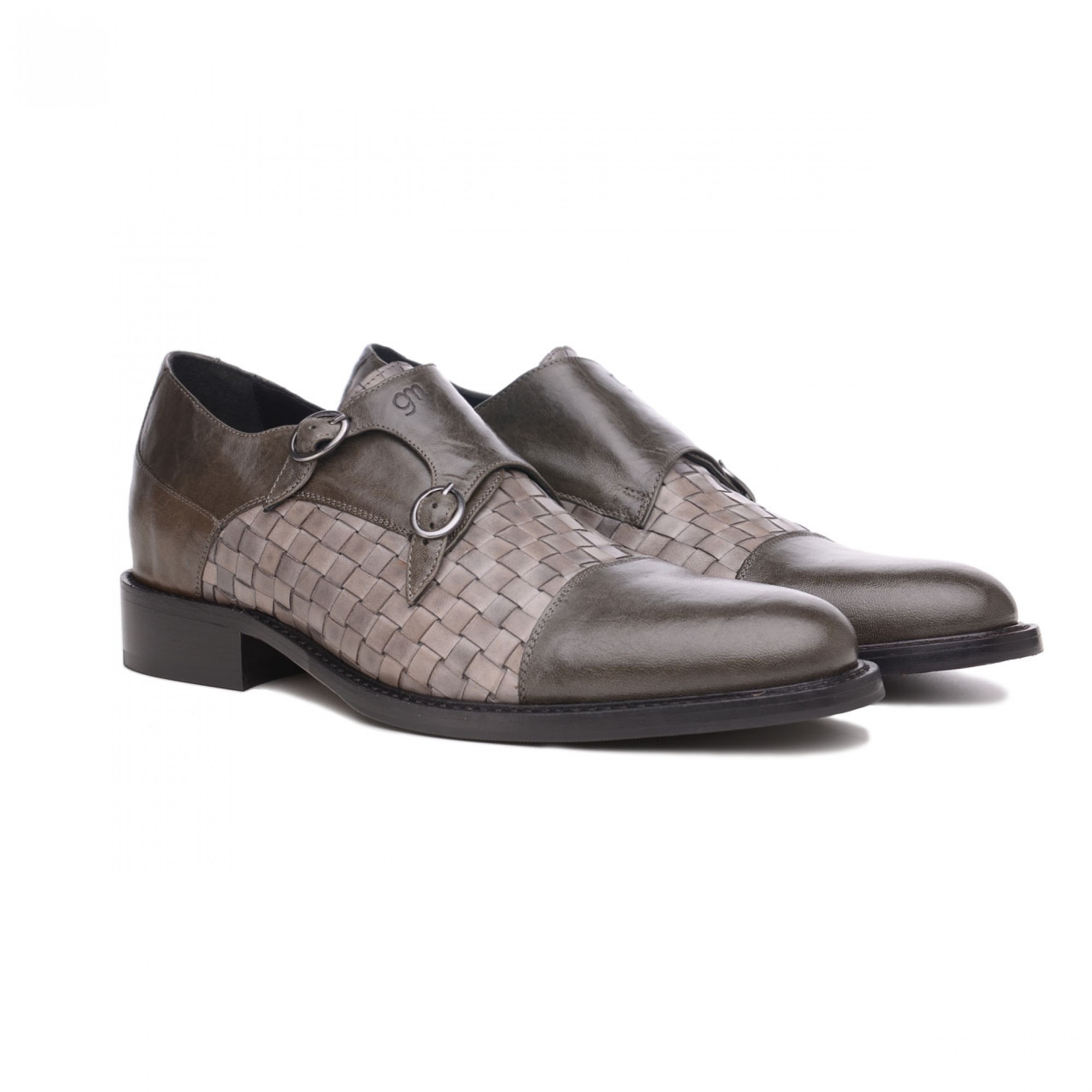 Elevator double buckle shoes with upper in gray aged calf leather and hand-painted calfskin featuring gray shades. The sole is made of leather with anti slip rubber..