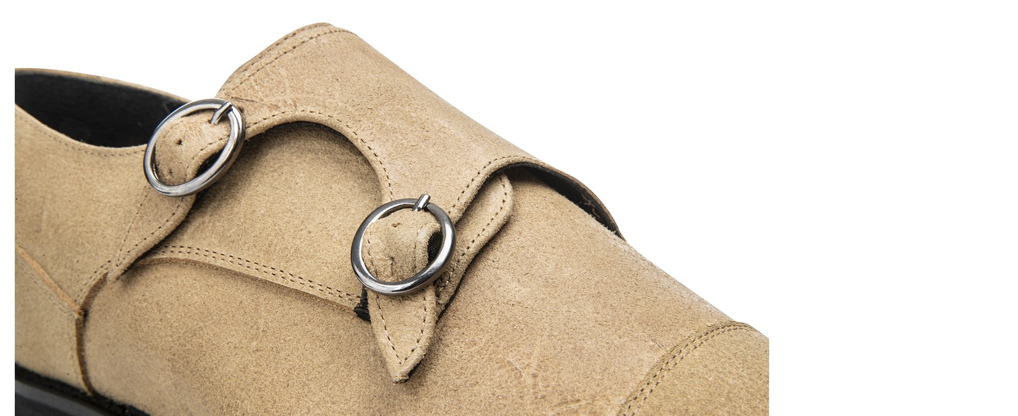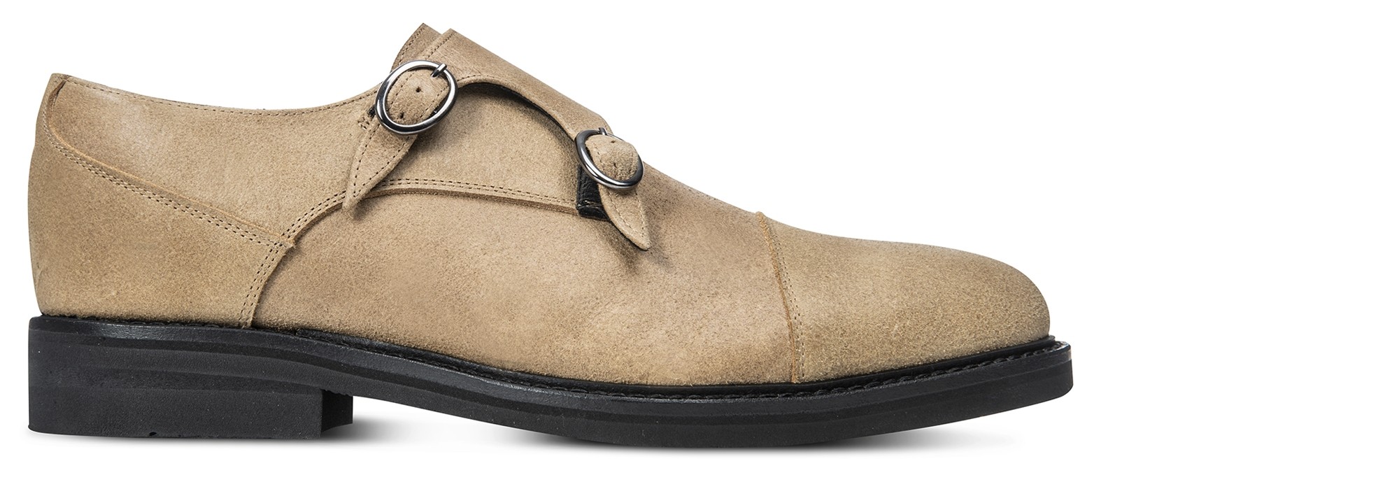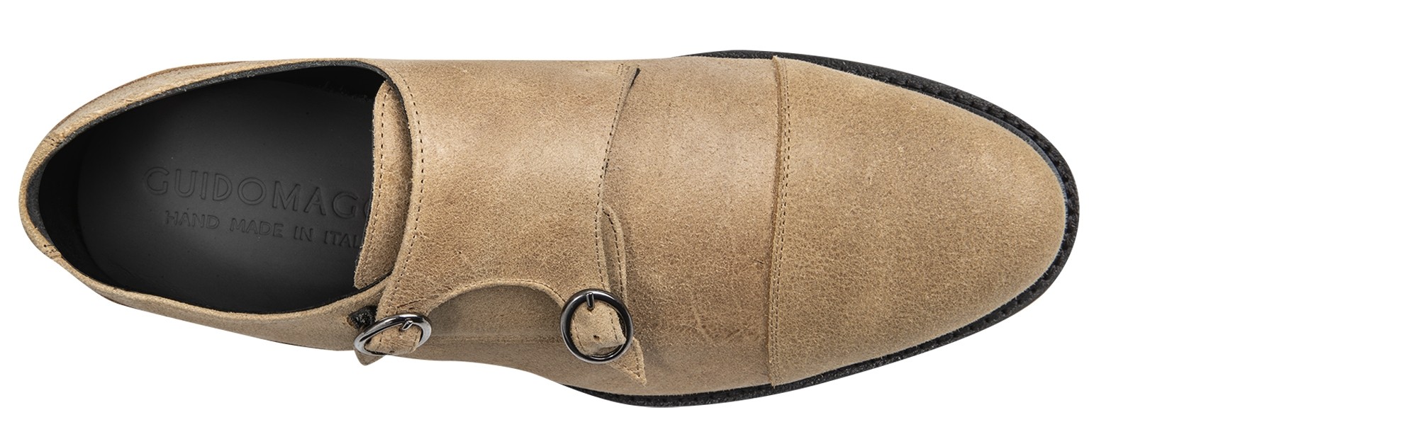 GuidoMaggi reinterprets the concept of elegance with sophisticated elevator shoes and contemporary lines. An example of this tradition is this elevator double monk strap finished by hand in every detail. The upper is in waxed calf leather with a vintage effect in a warm sand shade: an elevator shoel with a strong character, perfect for any look. Super-light Vibram sole stitched at sight. Up to 3.11" of extra height in total comfort. 100% made in Italy.