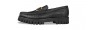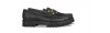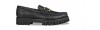 Elevator loafers reinterpreted in a modern key made of black full-grain leather and elegant golden metal alloy clamp. The tone-on-tone striped sole is in superlight natural rubber.