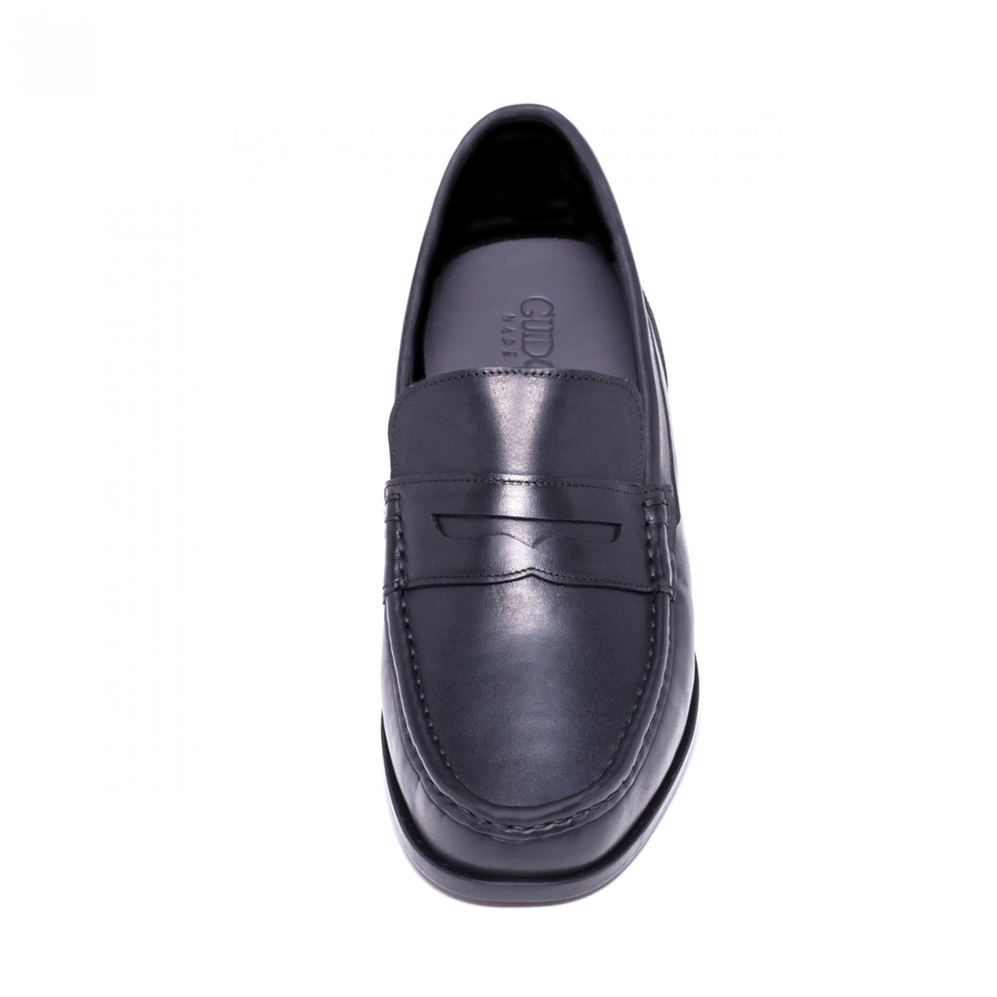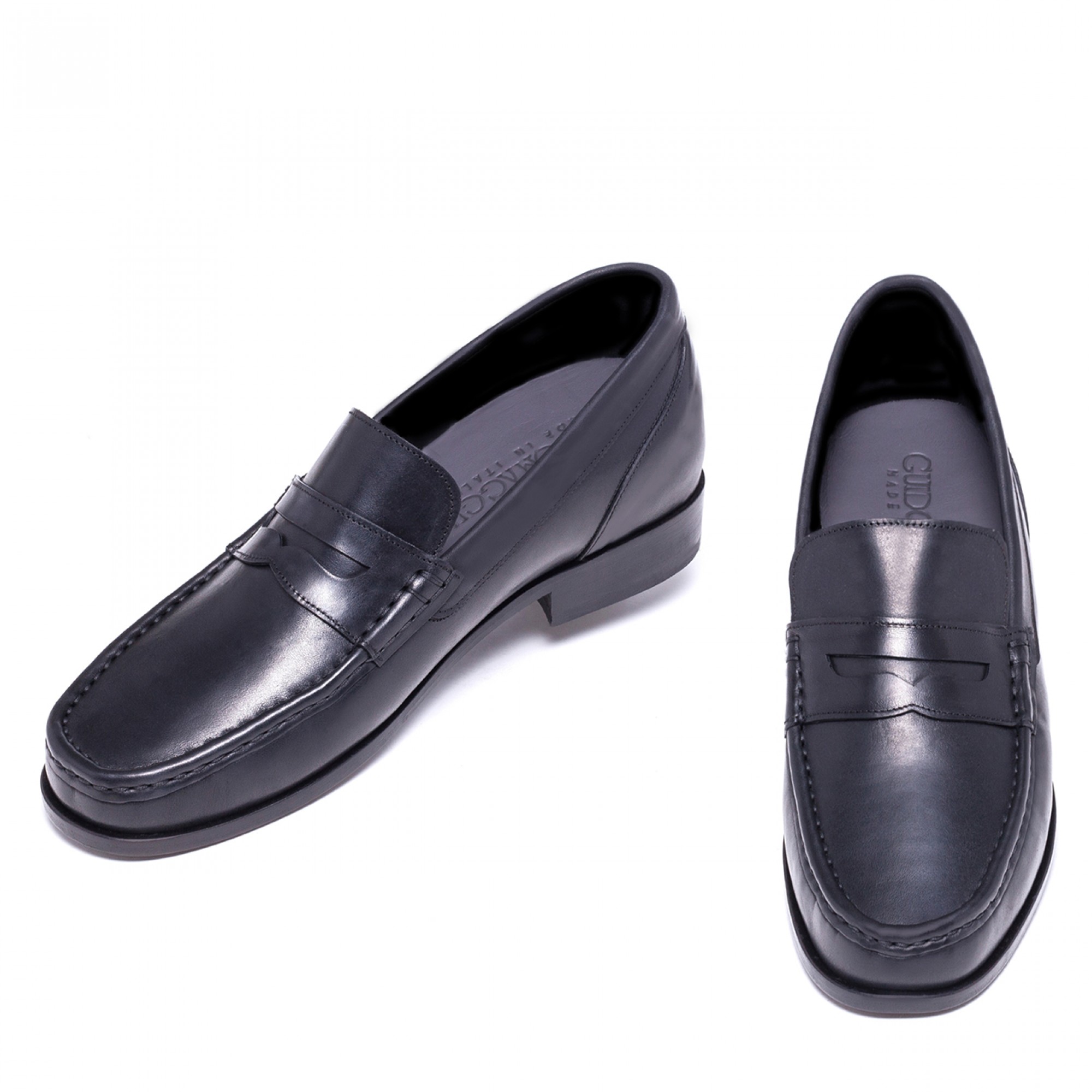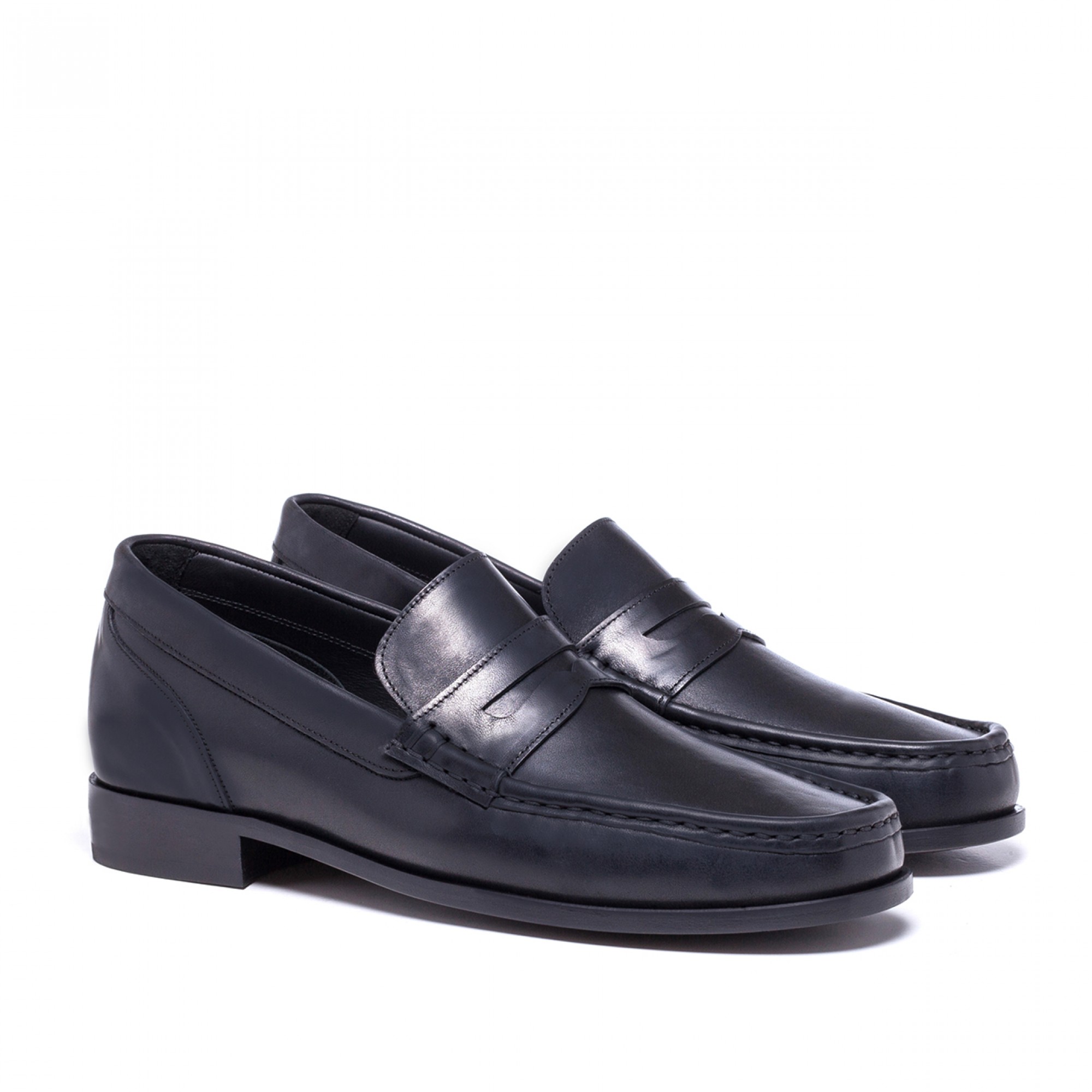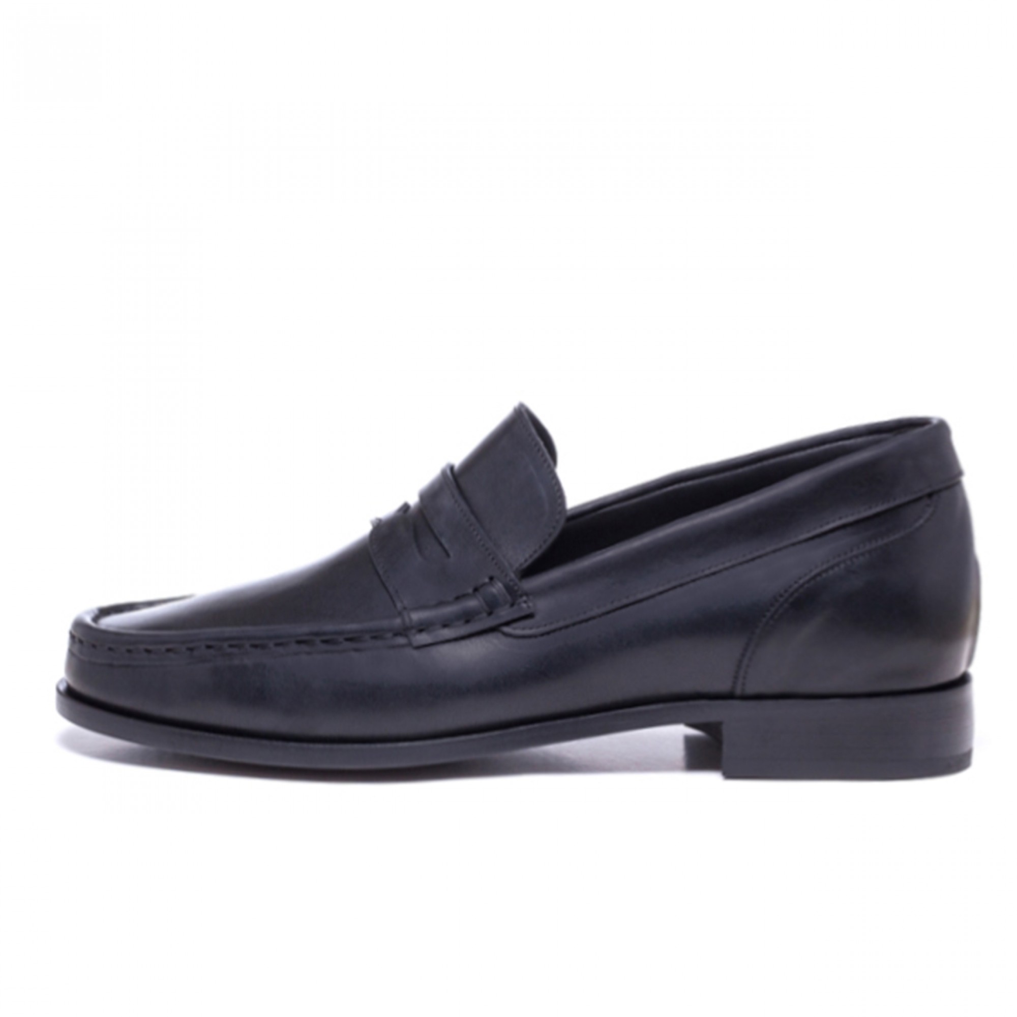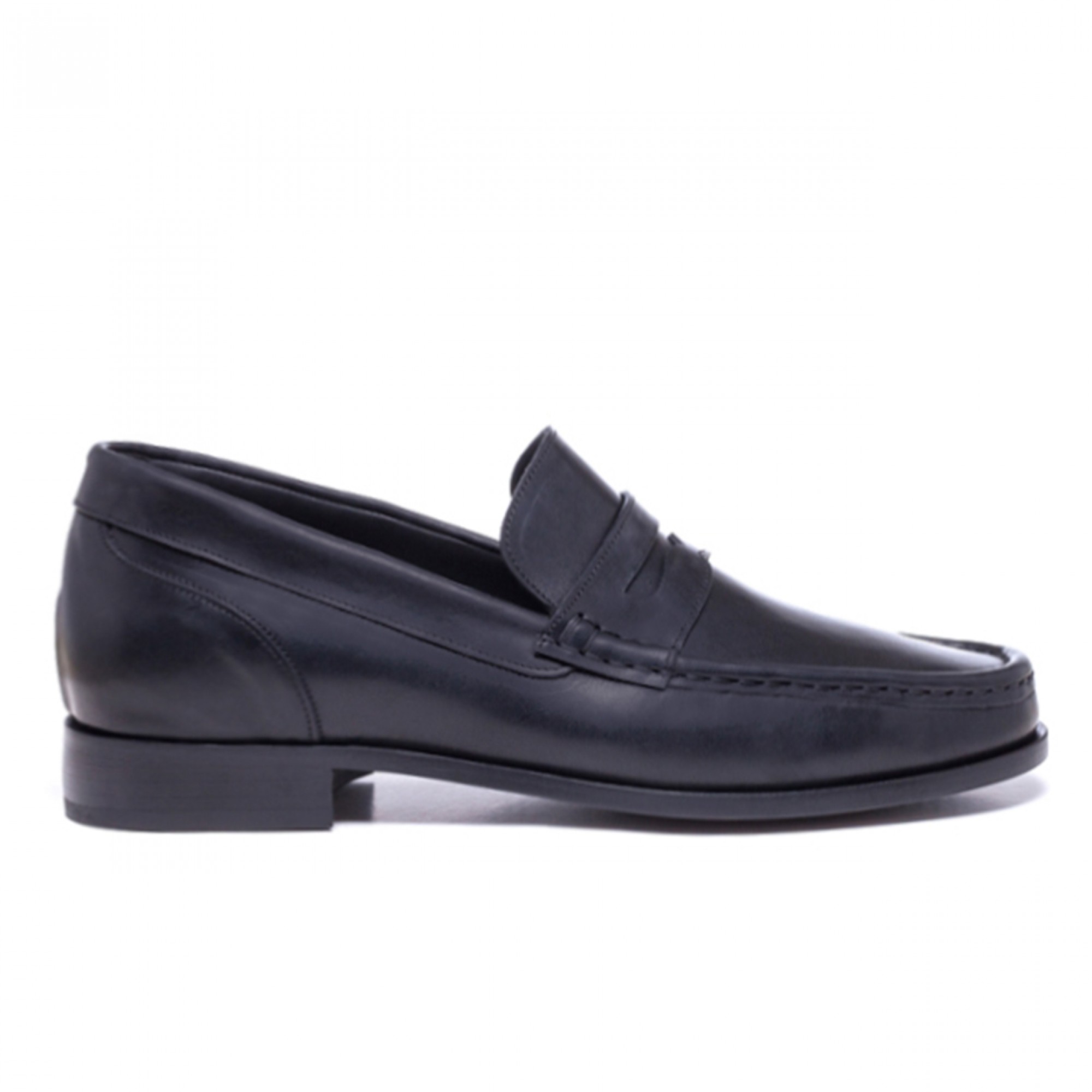 Elegant loafer with inner elevator system able to increase height by 2.6 inches with fine upper in black Cordovan waxed textured leather and stiched leather sole with anti slip rubber.