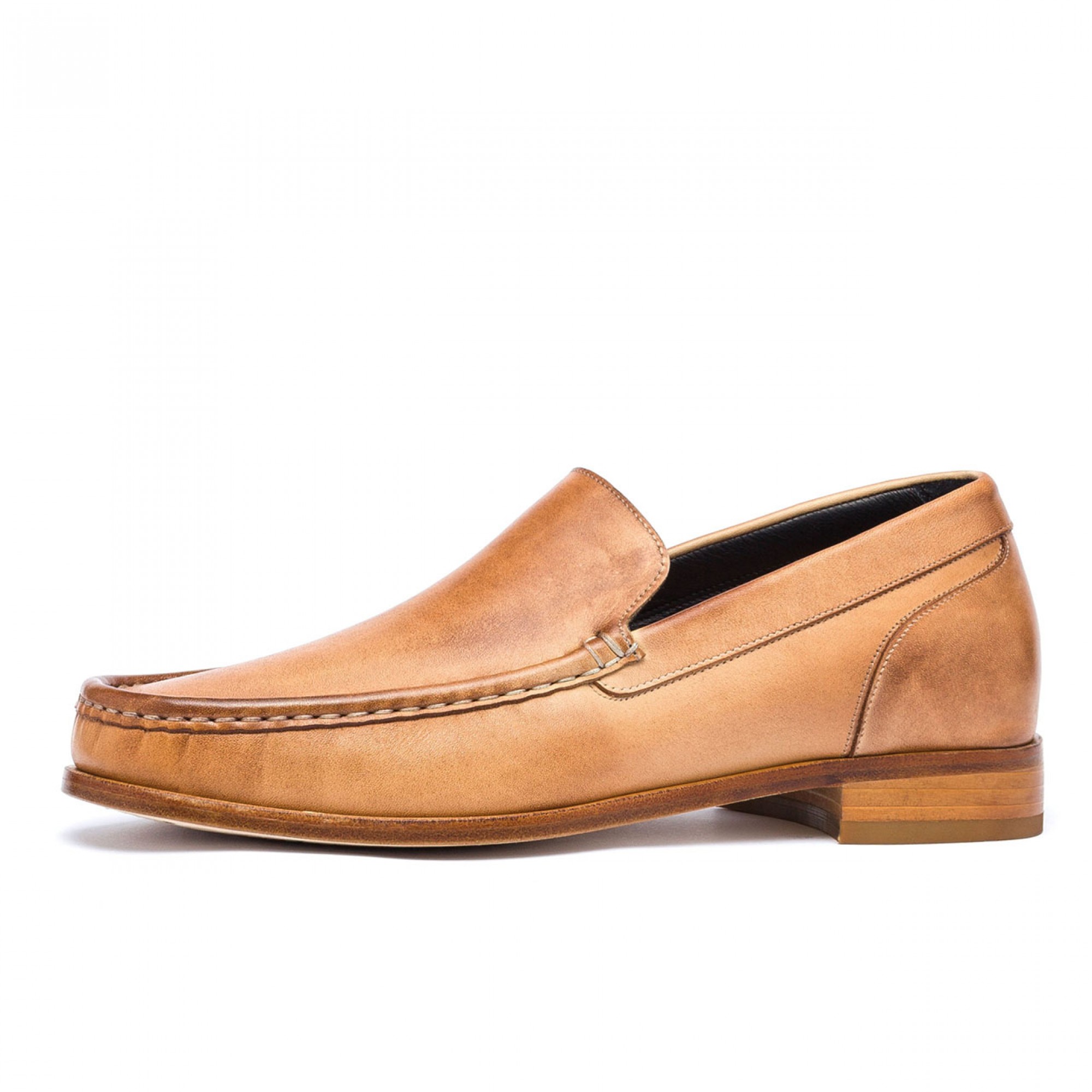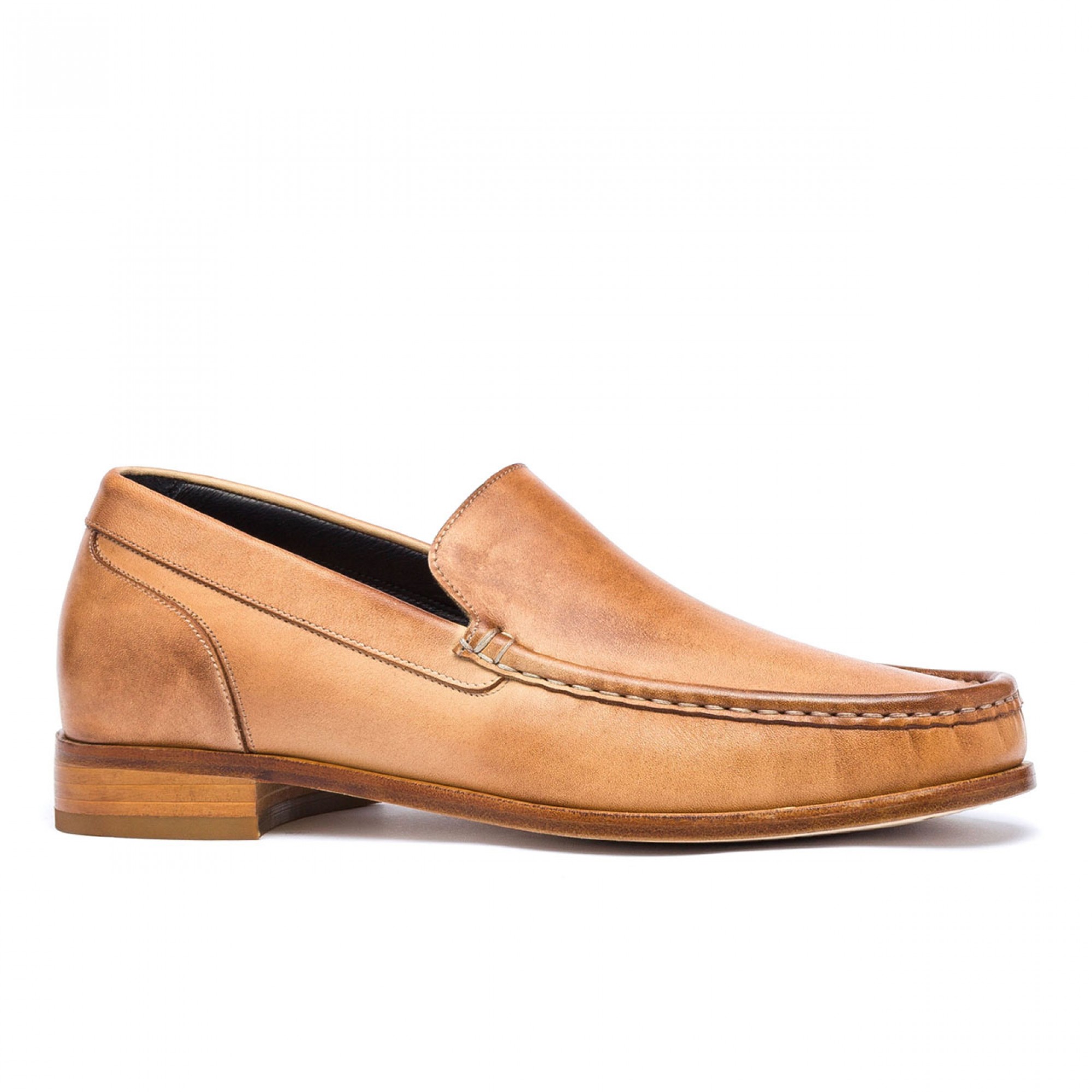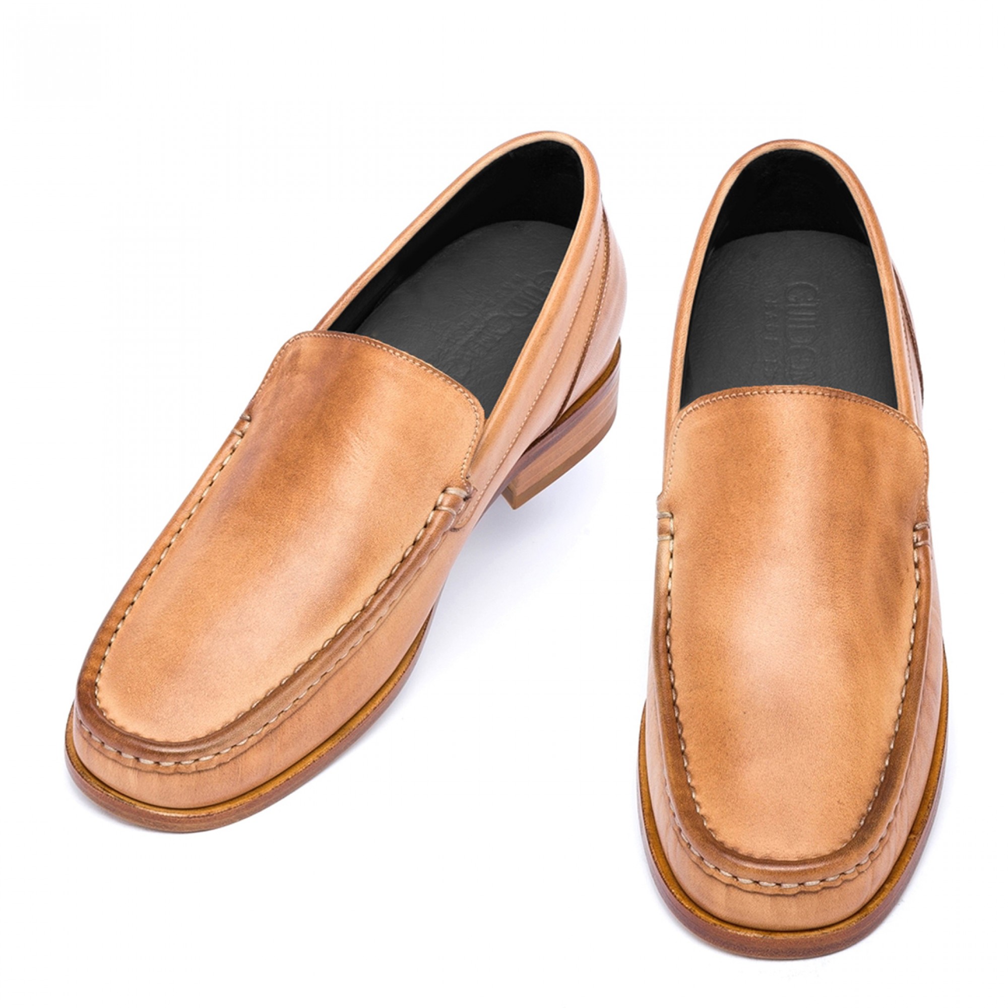 Elegant elevator loafer entirely handcrafted with upper in cognac crust calfskin leather hand-buffered and stiched leather sole with anti slip rubber.