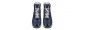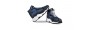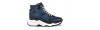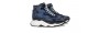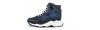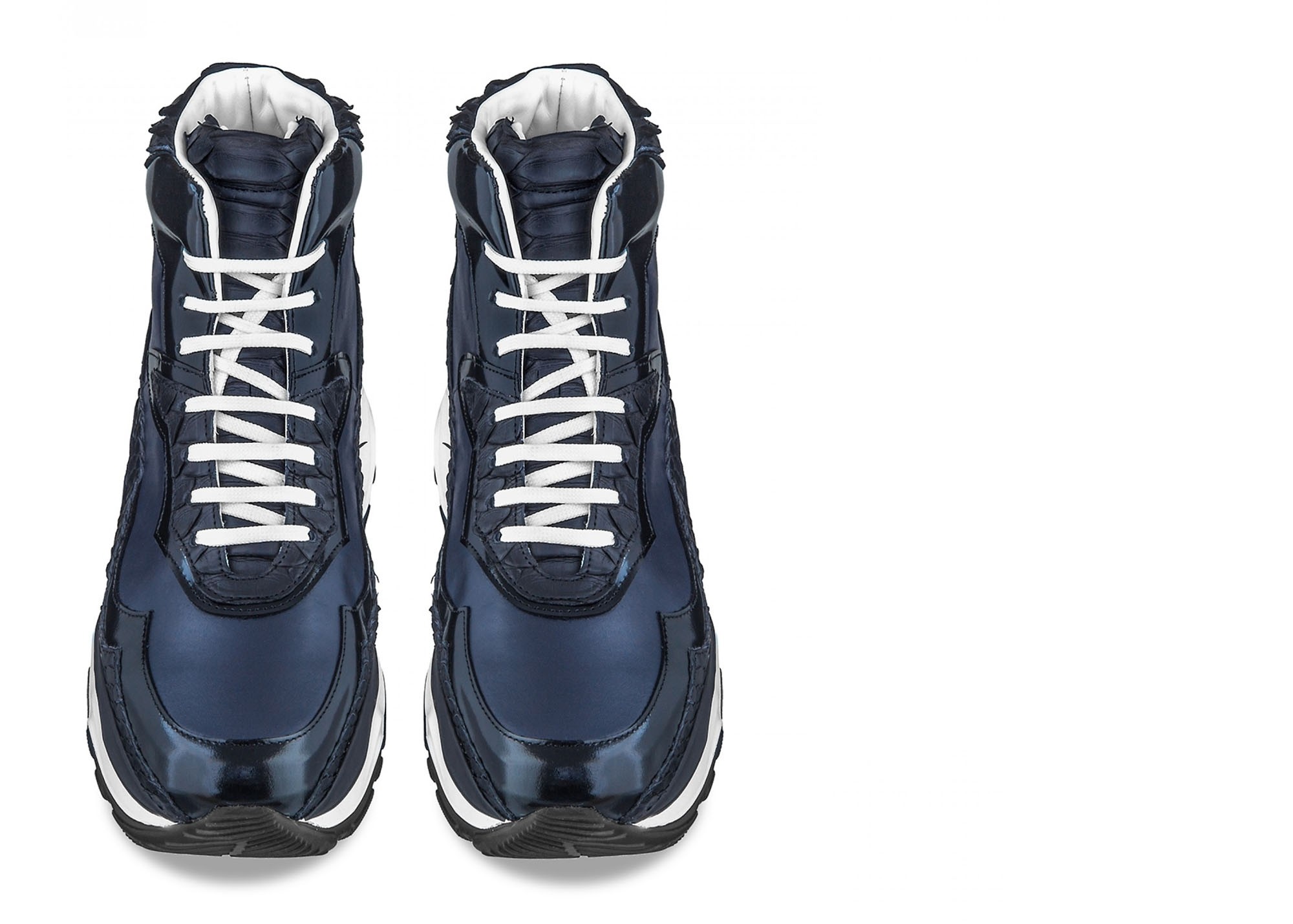 Luxury high top chunky elevator sneakers handmade from blue python leather with bold black reflections, black brushed calfskin, blue and black full grain leather. The two tone sole is in ultralight rubber.