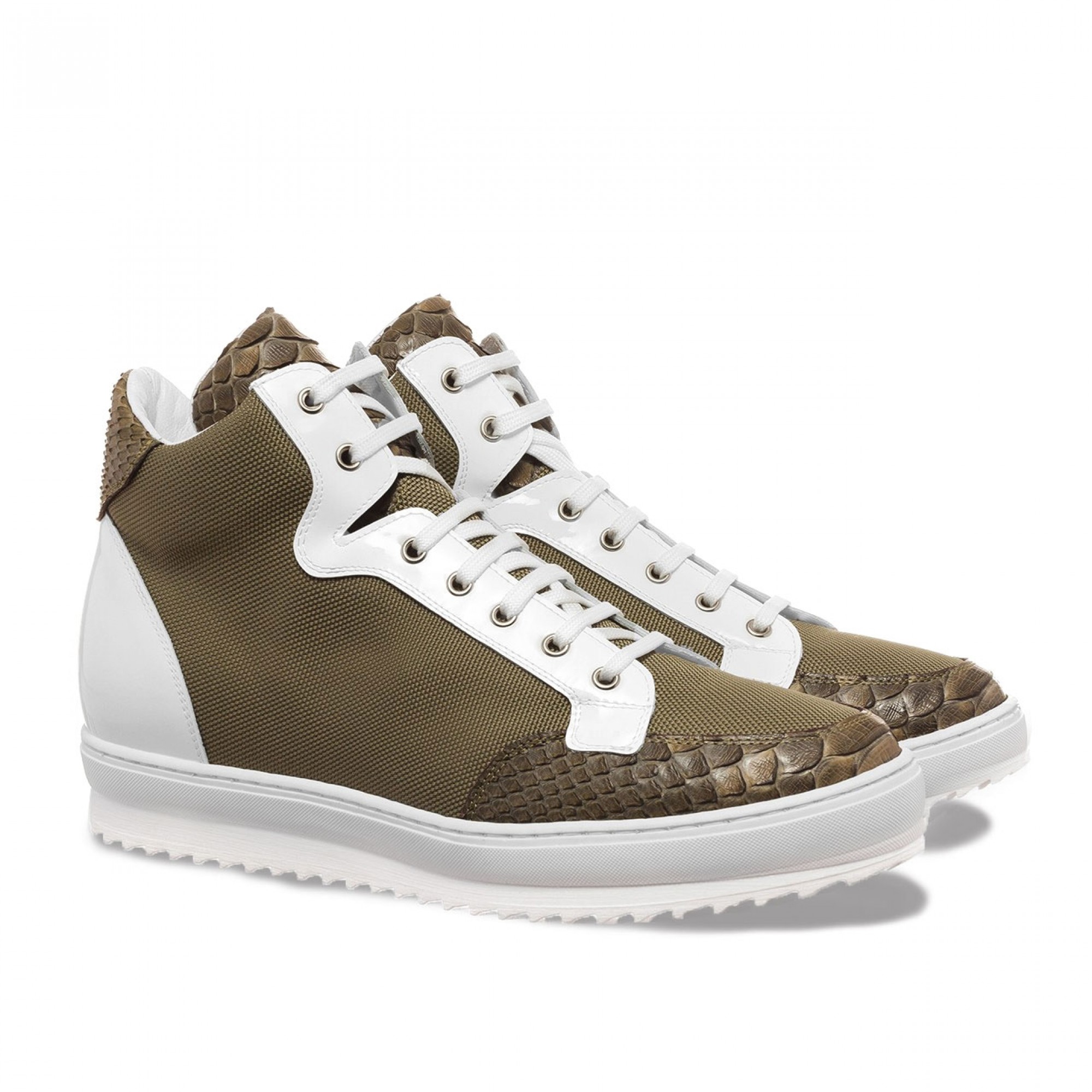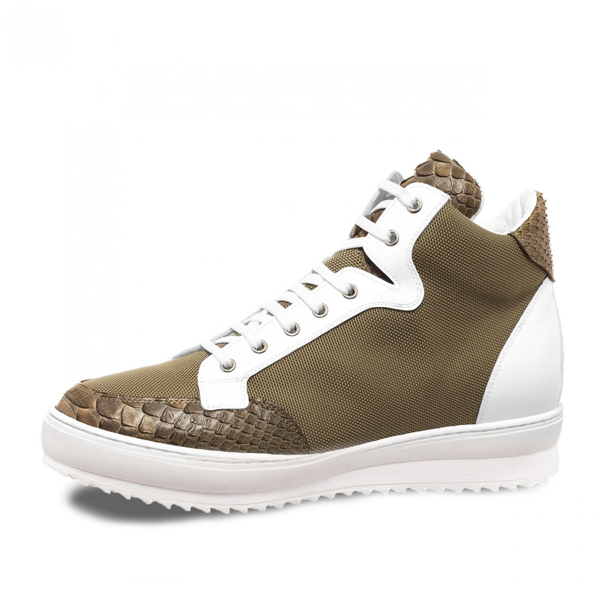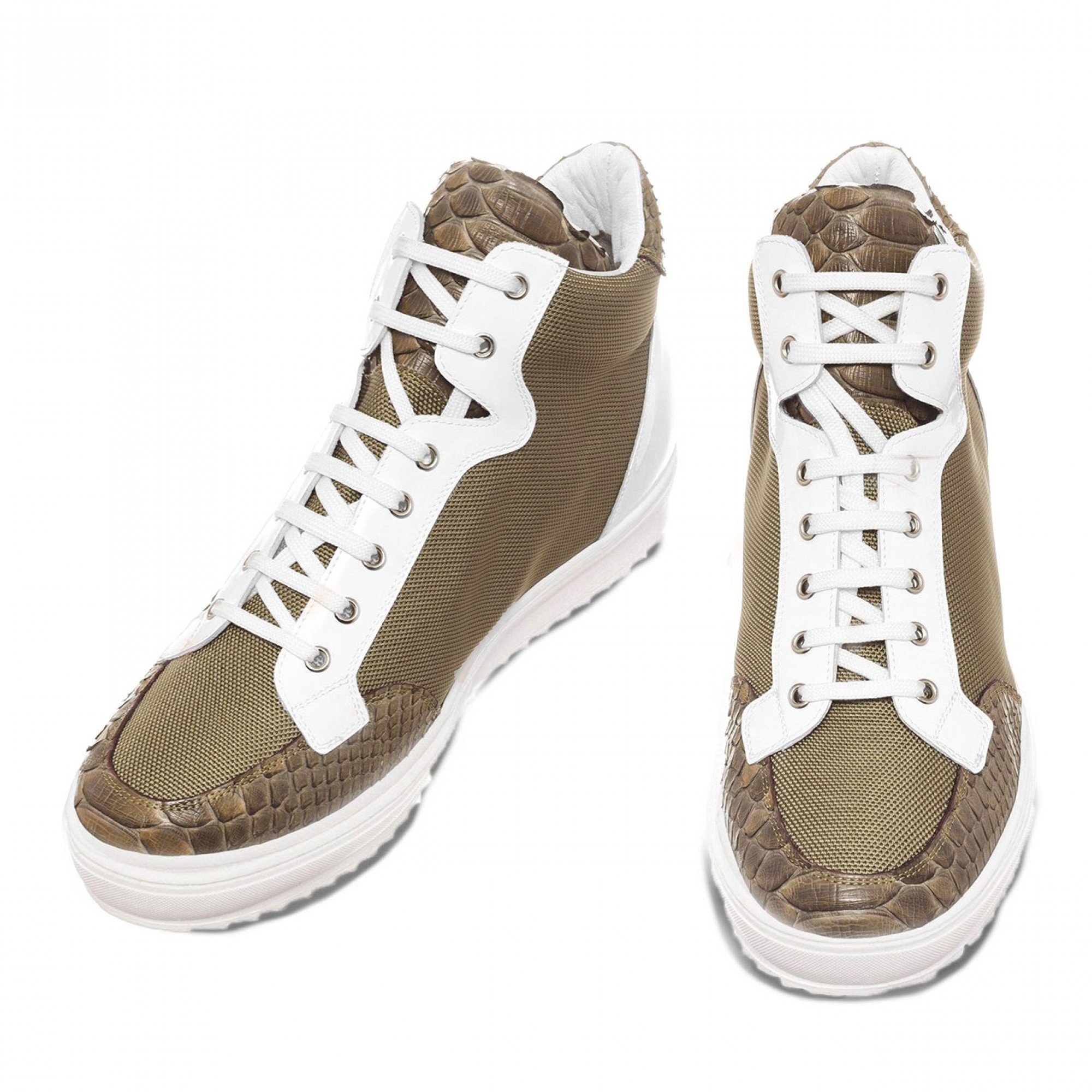 The new Kenya Sneakers elevator shoes are finely handcrafted in Italy. The upper, in military green technical fabric and white patent leather, is embellished with details in python skin. The soft inner lining is made of goatskin. The insole in genuine Italian leather. The outsole of the latest generation, is lightweight high quality rubber.