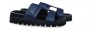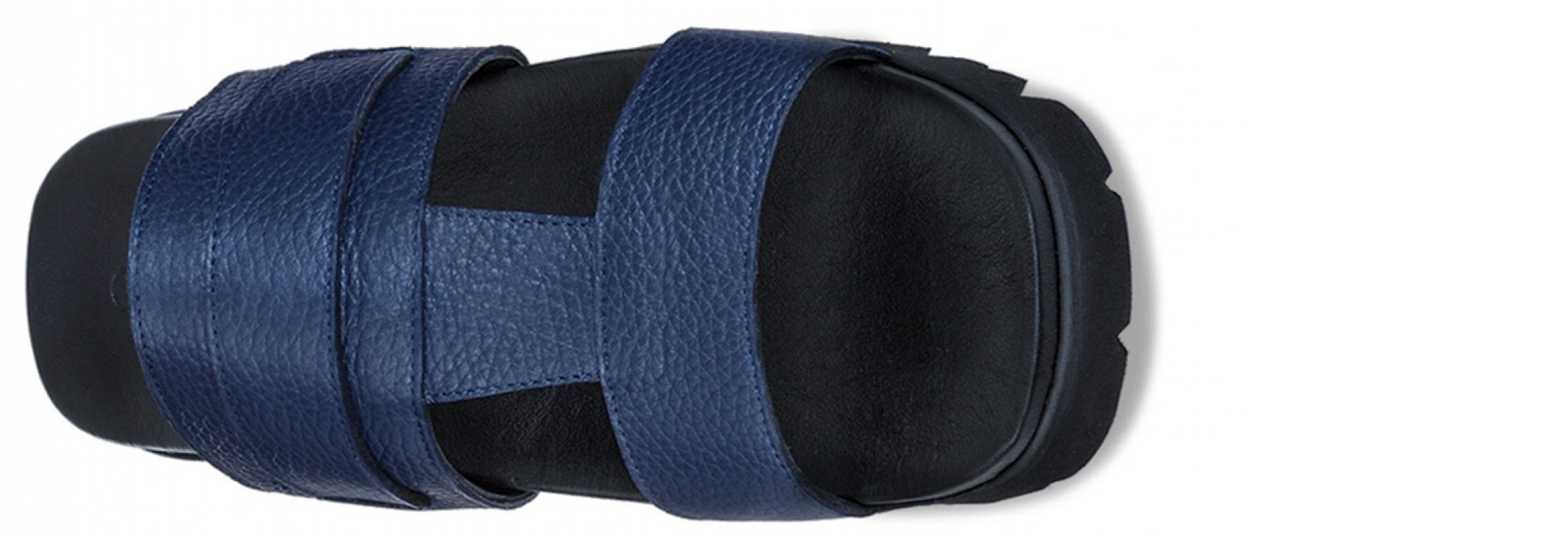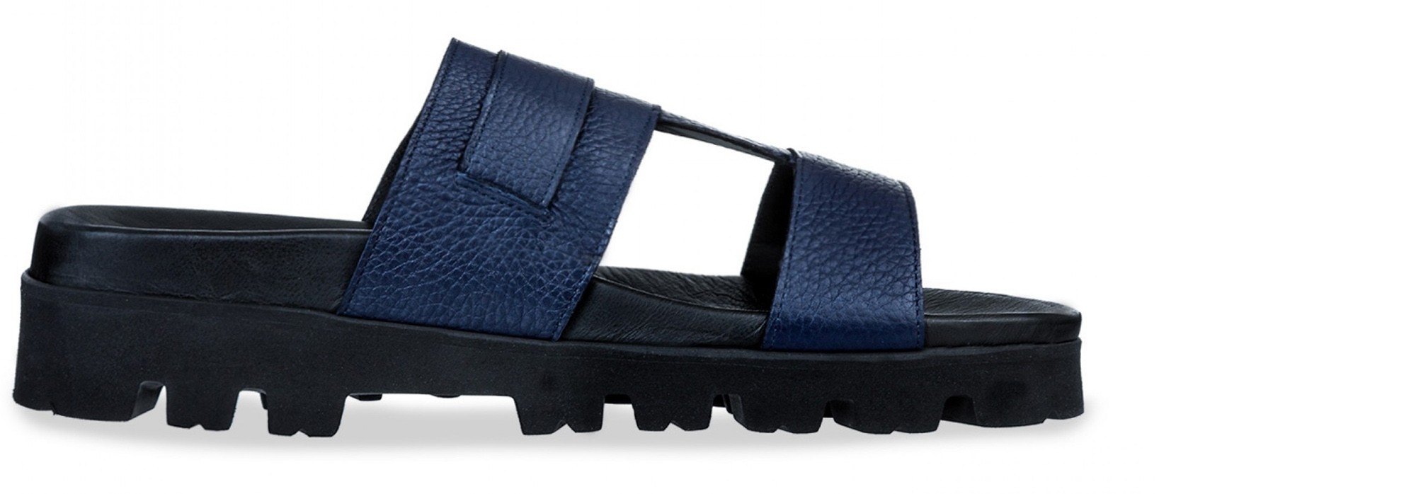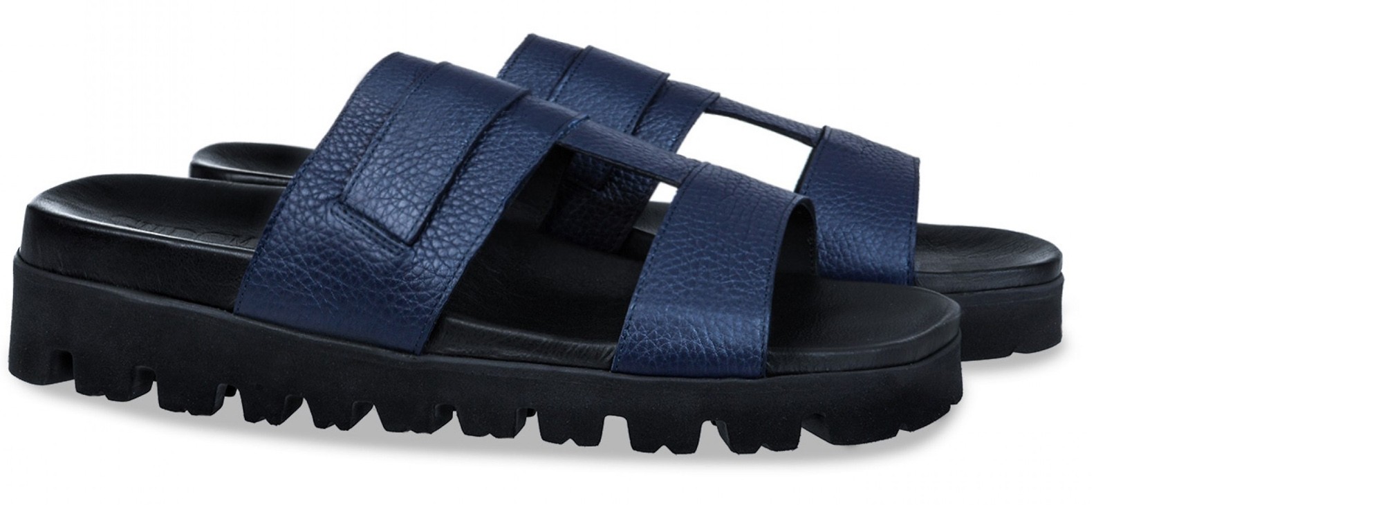 New summer sandals in blue textured calfskin and comfortable full-grain leather covered insole. The sole is made of natural rubber.