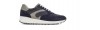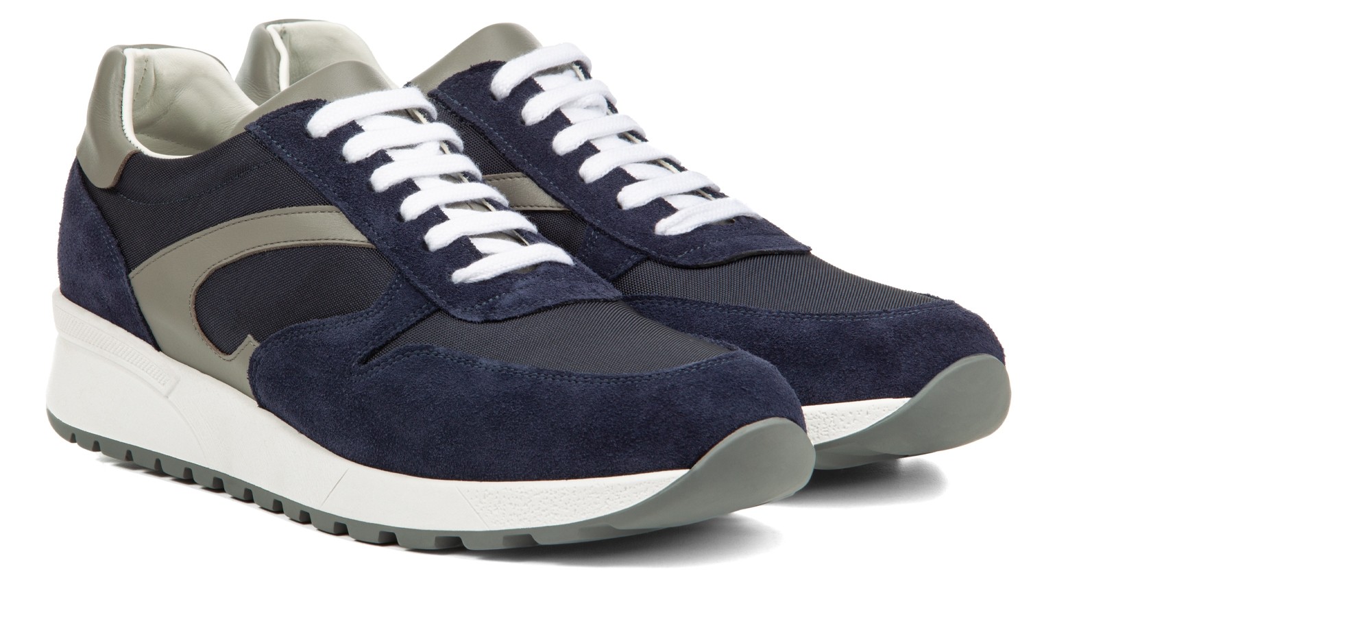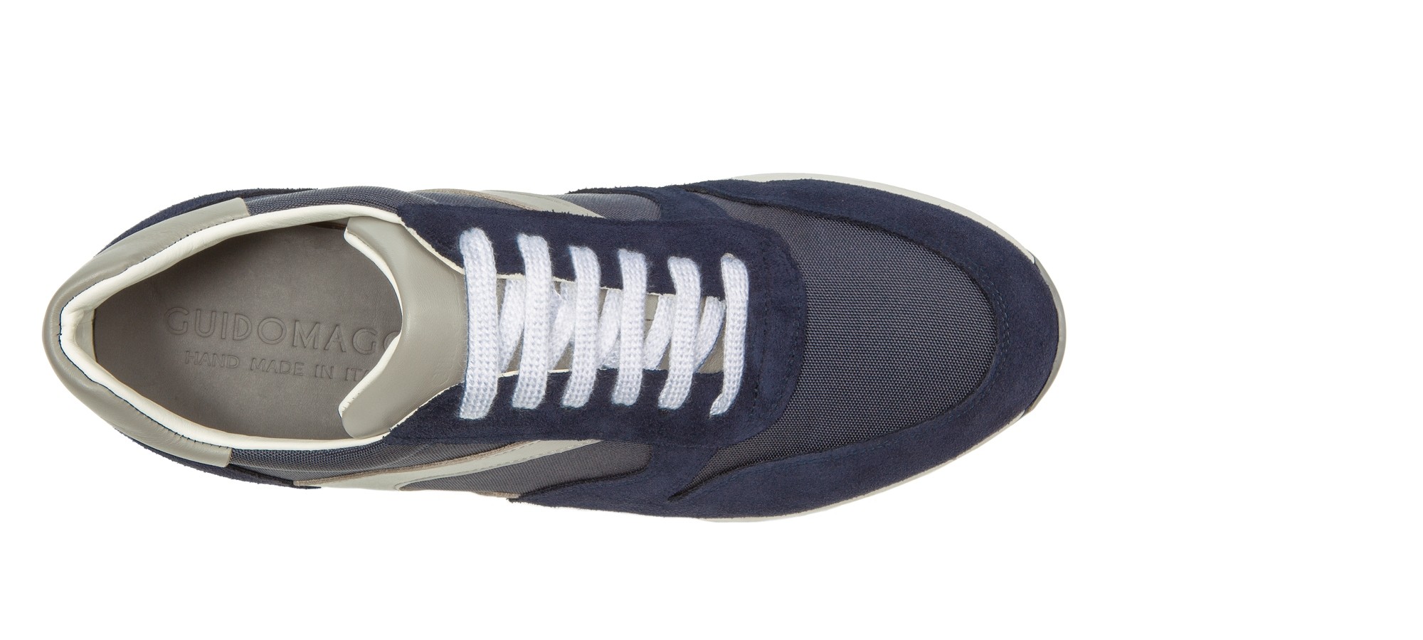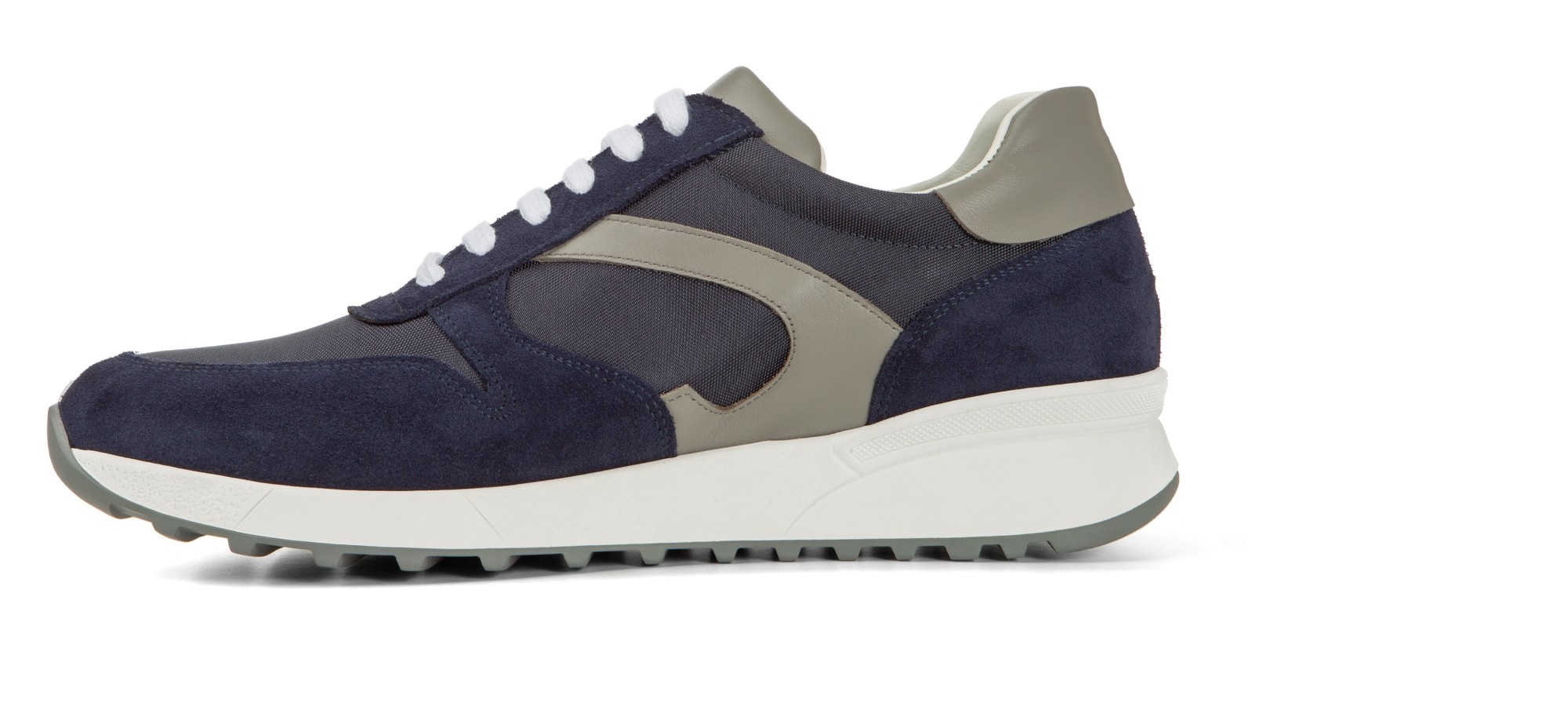Handcrafted elevator sneakers, street style inspired with upper in blue suede calfskin, blue technical fabric and gray full grain leather details on the sides and heel tab.