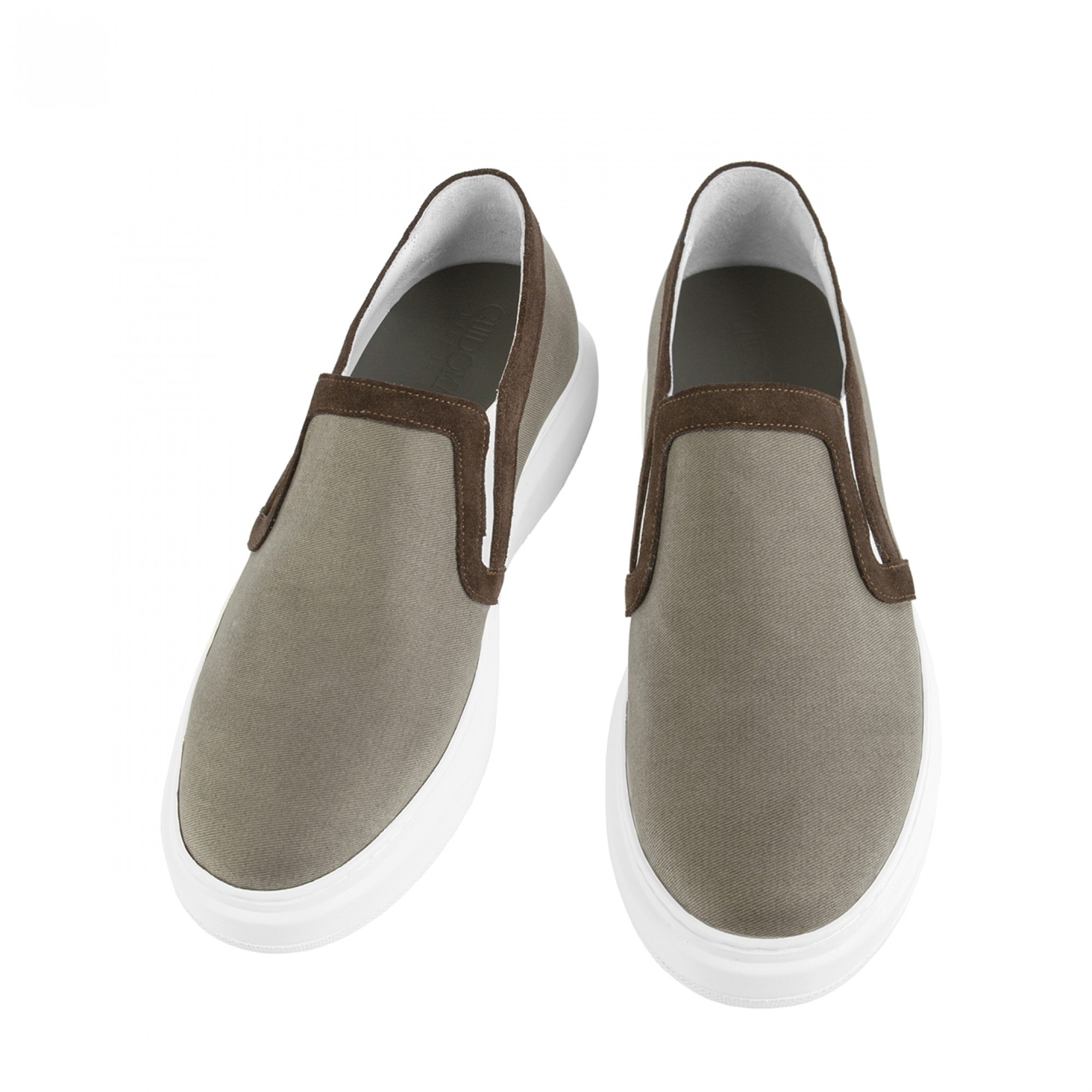 Handcrafted slip-on with upper in breathable grey technical fabric and details in dark brown suede. The sole is made of white rubber.