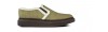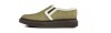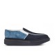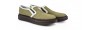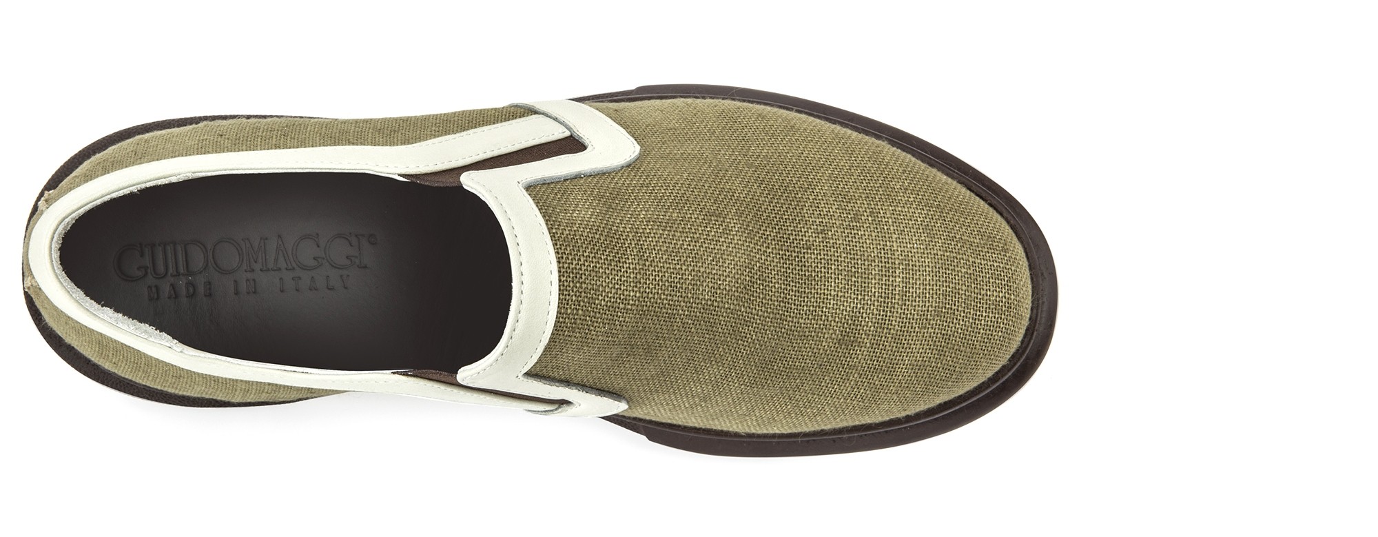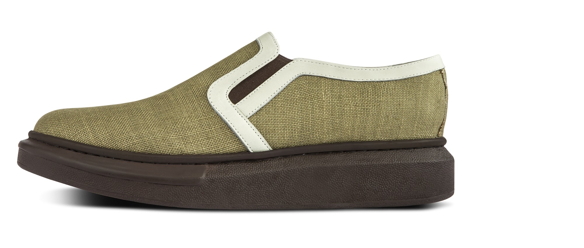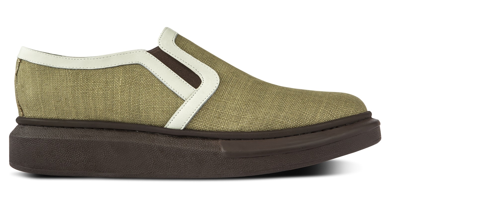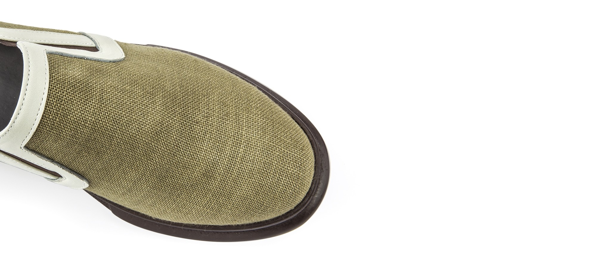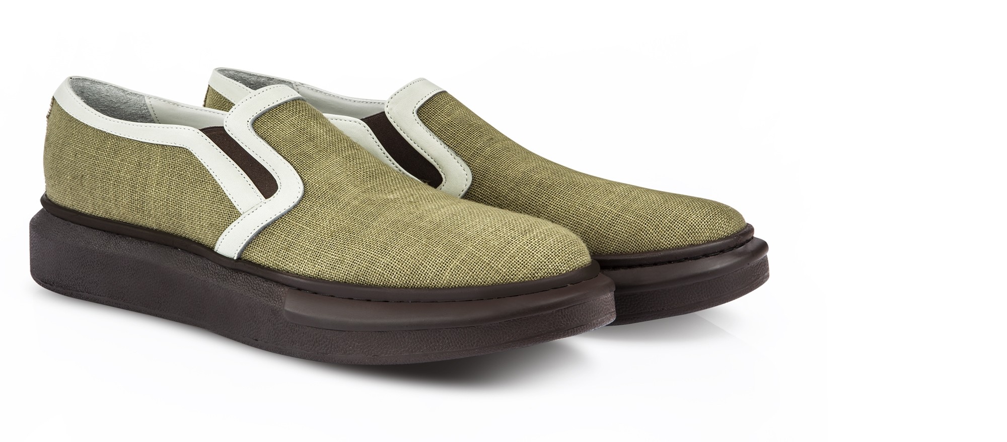 Elevator slip-ons inspired by the luxury and richness of the mythological kingdom of Agarthi made of breathable green fabric with finishes and details in gray full-grain leather. The new brown sole is in ultra-light natural rubber.