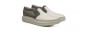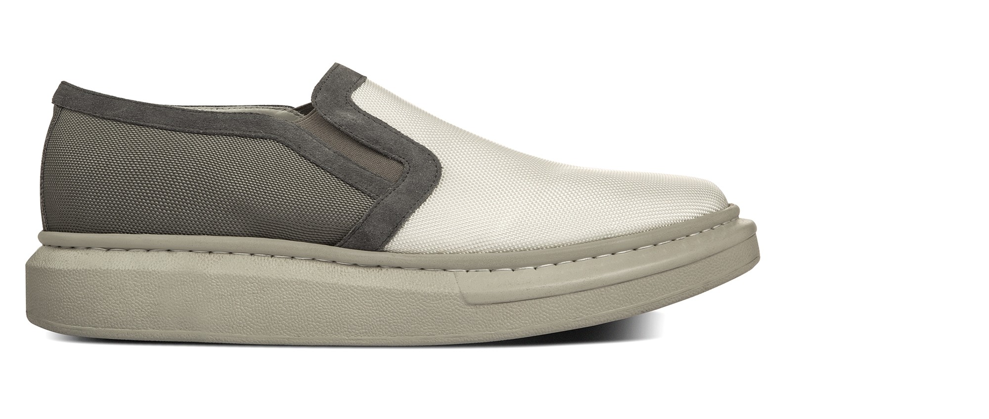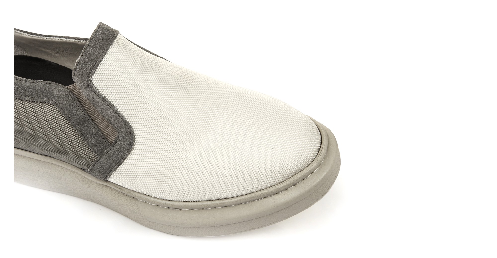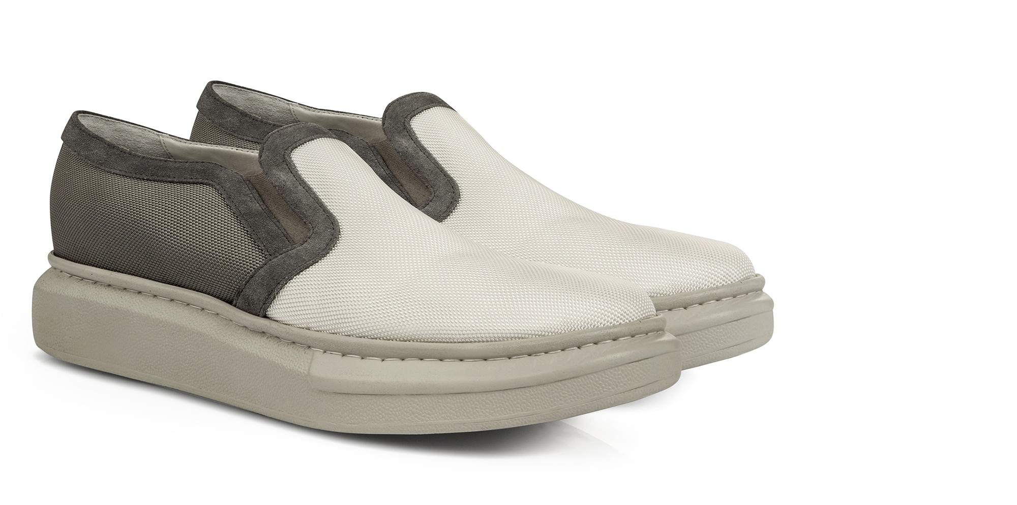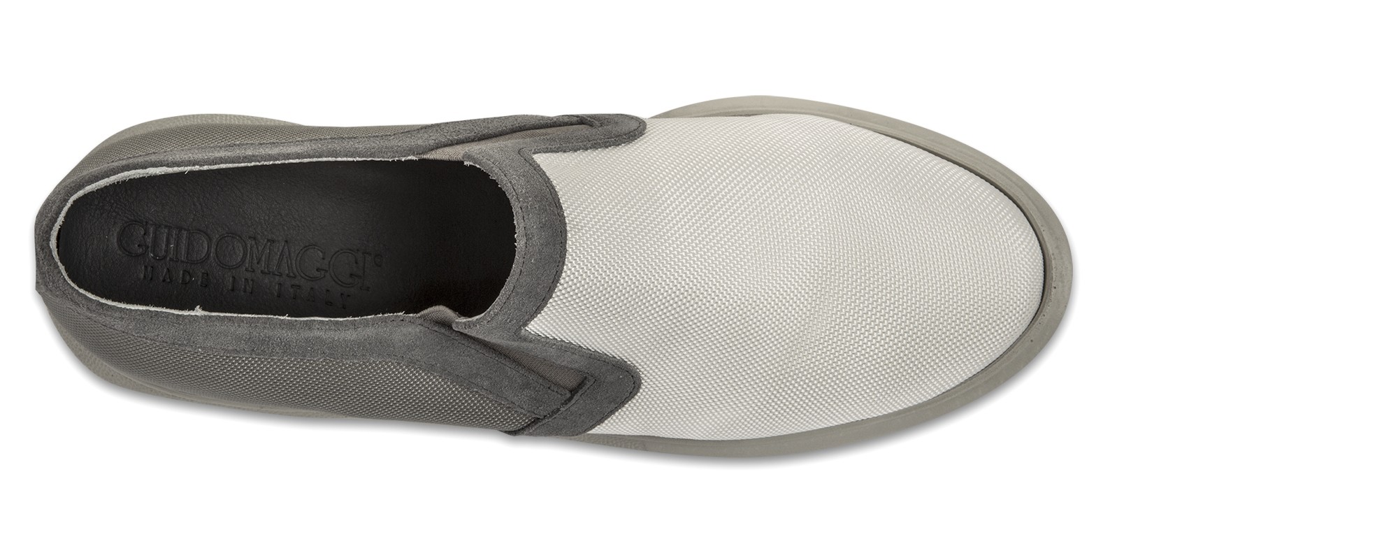 Stylish elevator slip-on in pearl gray fabric, white fabric and gray suede. The new and resistant gray sole is in ultra-light natural rubber.