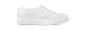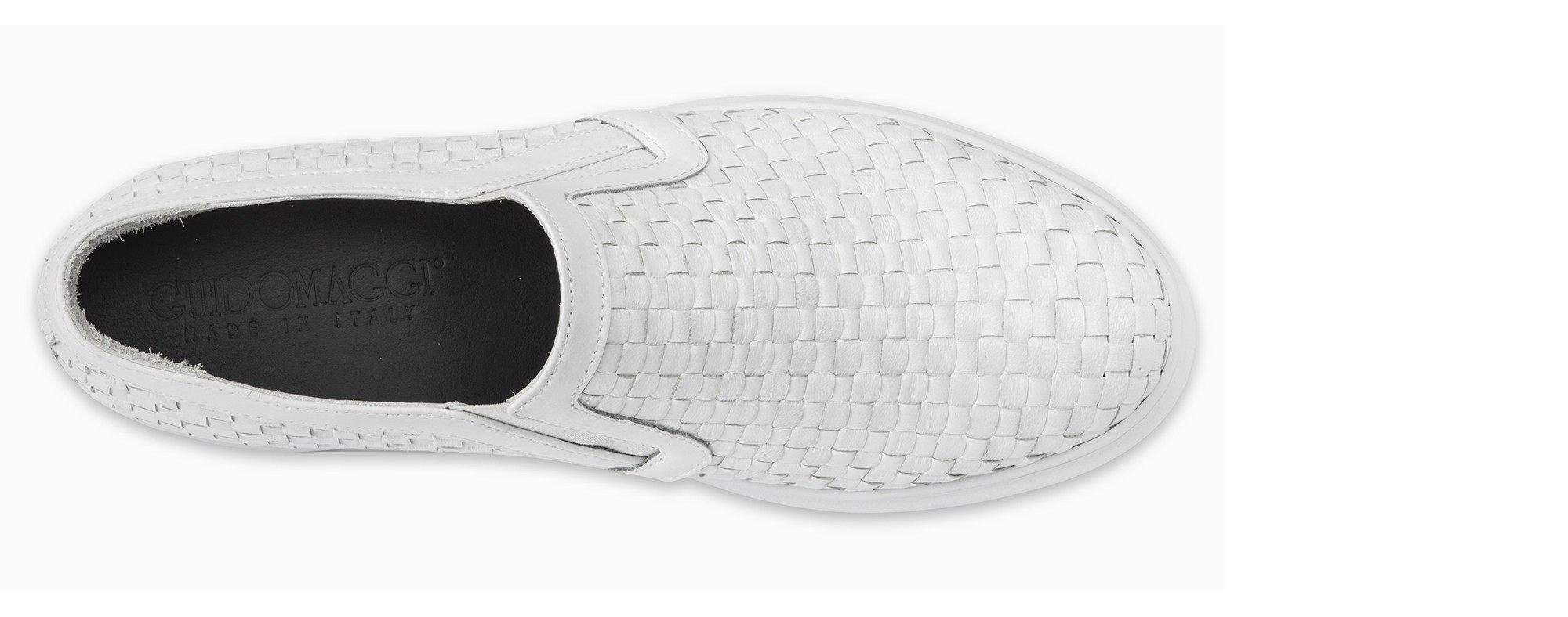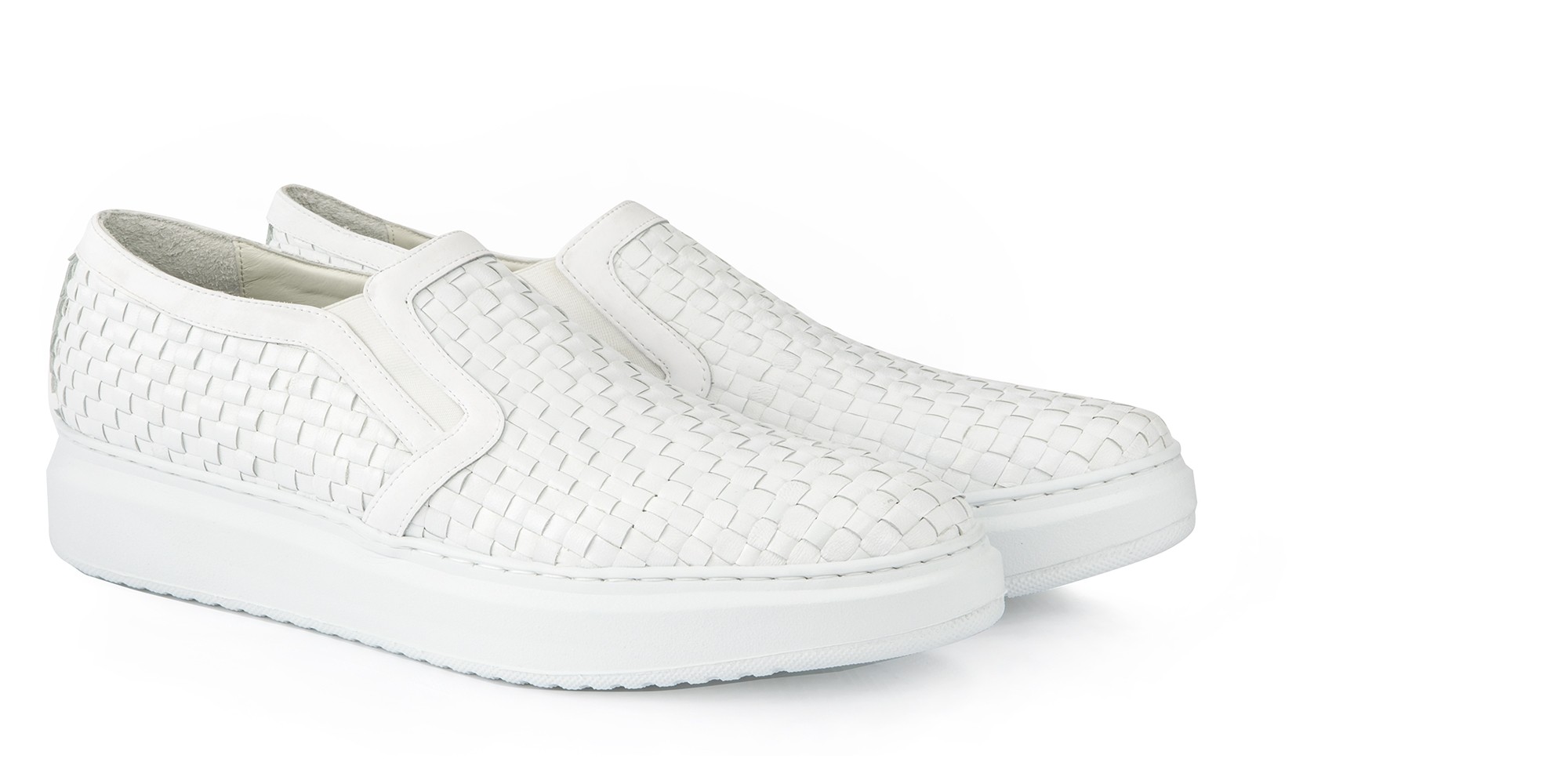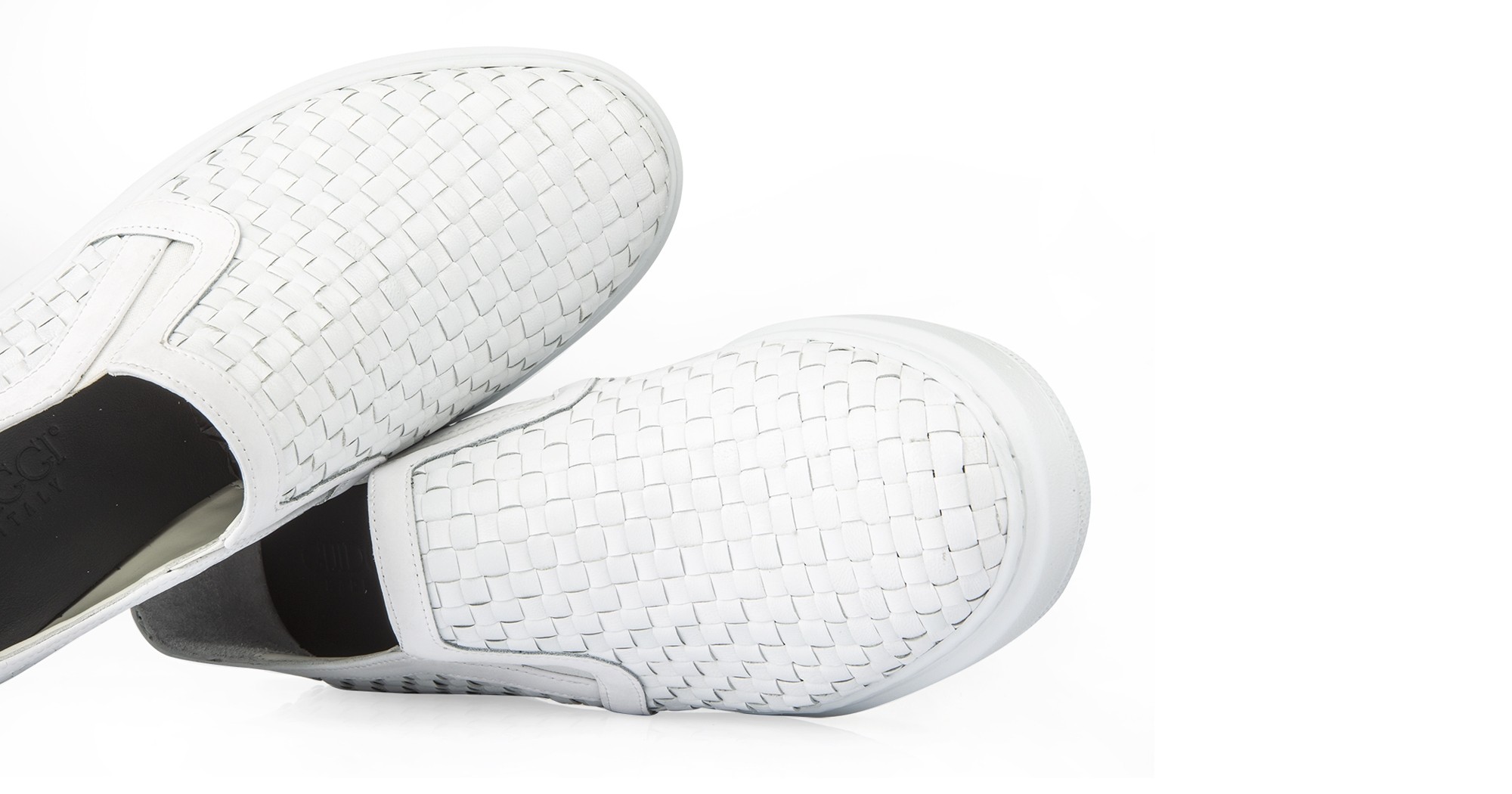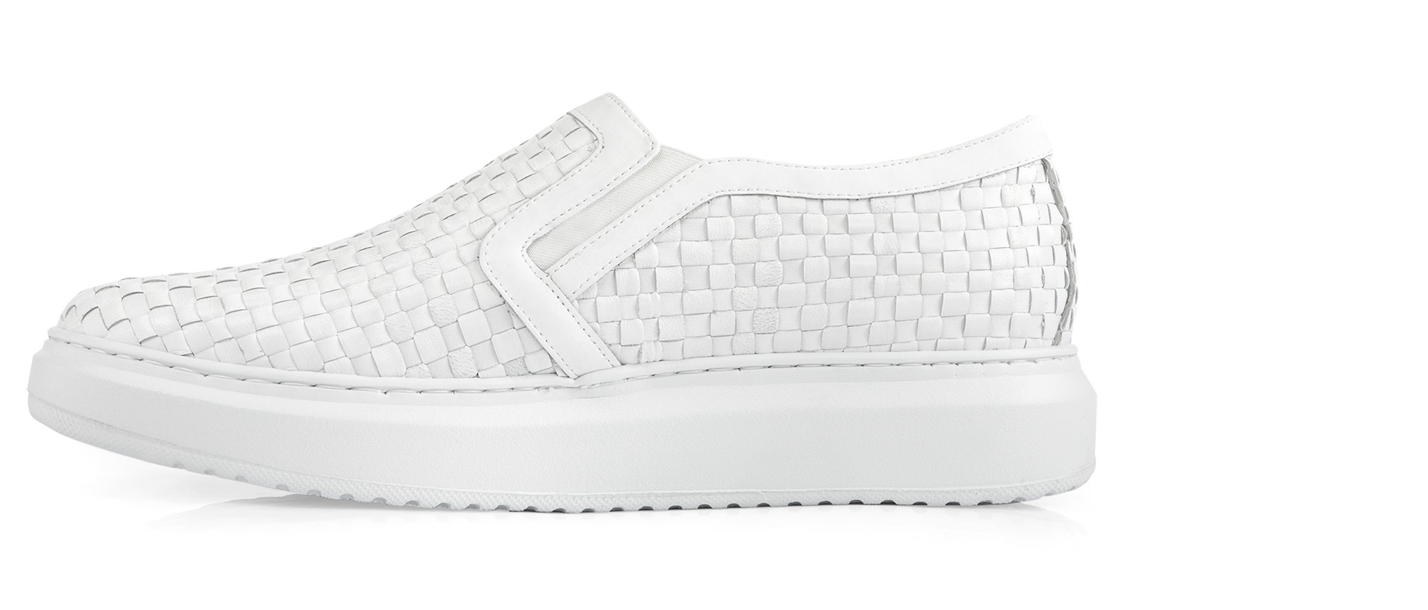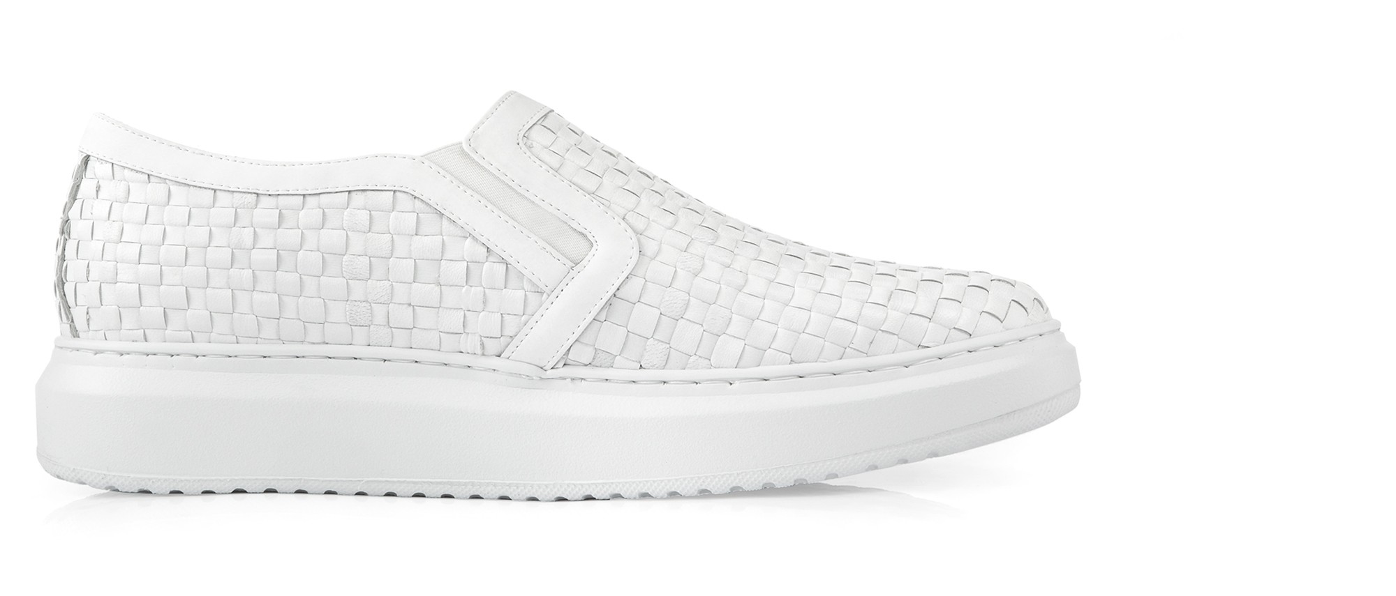 Luxury sportswear: handcrafted elevator slip-ons made of white hand-woven calf leather, edges and details in full-grain leather and ultra lightweight tone-on-tone natural rubber sole.