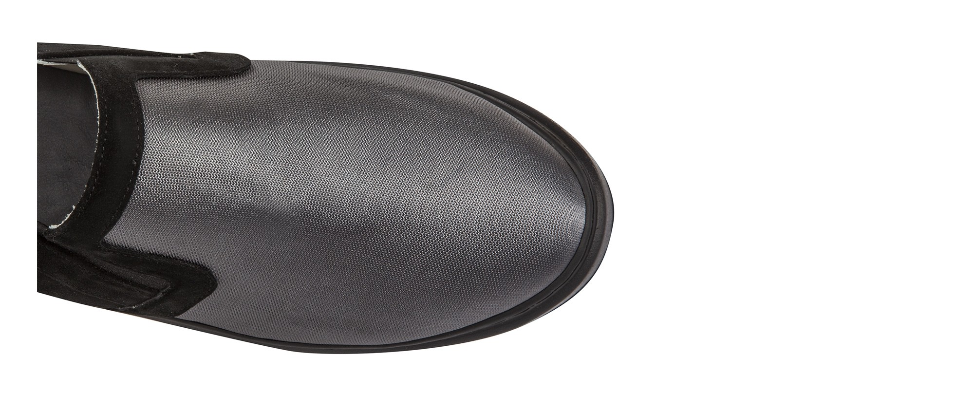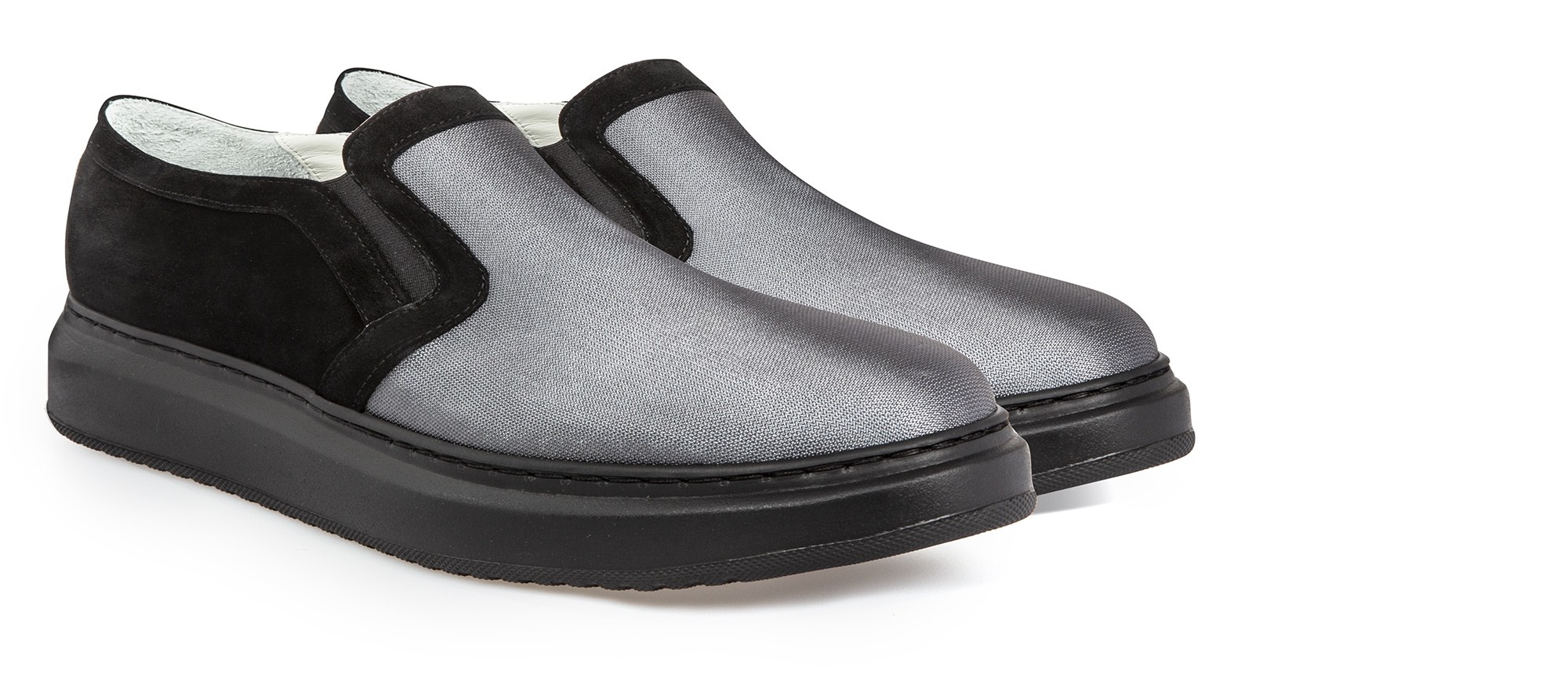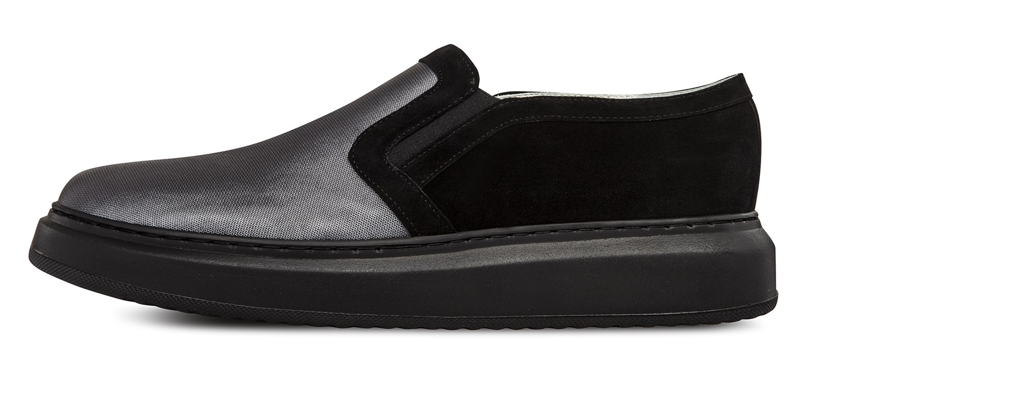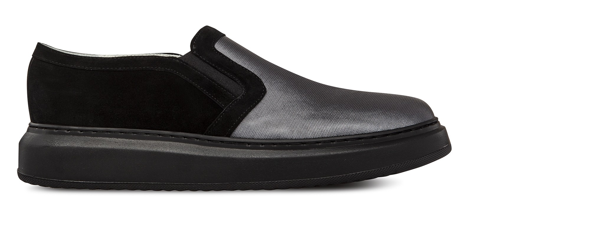 Versatile elevator slip-on where different colors and materials come together with balance, made of gray technical fabric on the front of the upper and black suede on the back. The sole is made of ultra-light natural rubber.