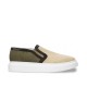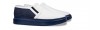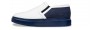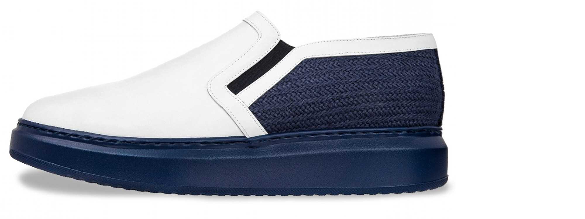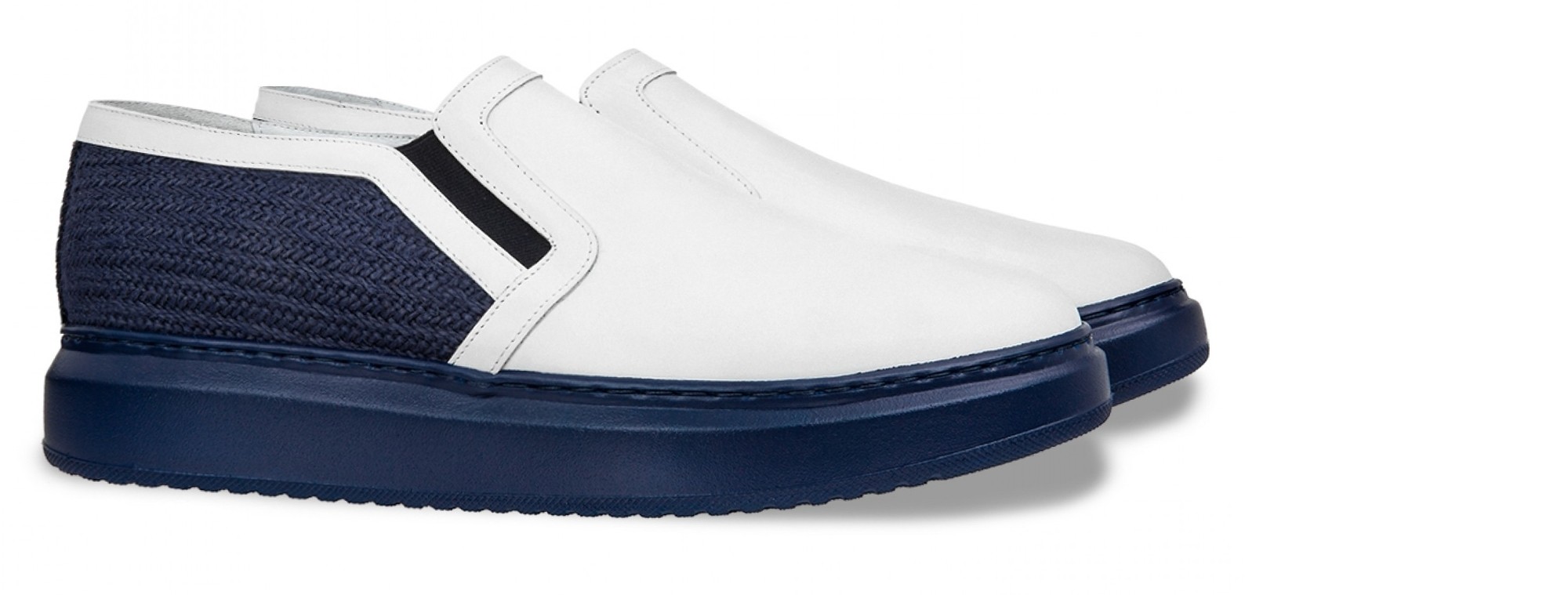 Handcrafted elevator slip-ons with upper in white full-grain leather and blue woolen fabric that characterizes the back. The sole is made of natural rubber.