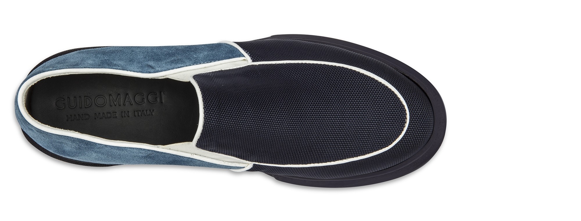Elevator slip ons inspired by one of the most beautiful islands of Hawaii and able to increase height by 2.4 inches (6 cm). The upper is made of blue fabric and soft blue suede with details in white rubberized calfskin.