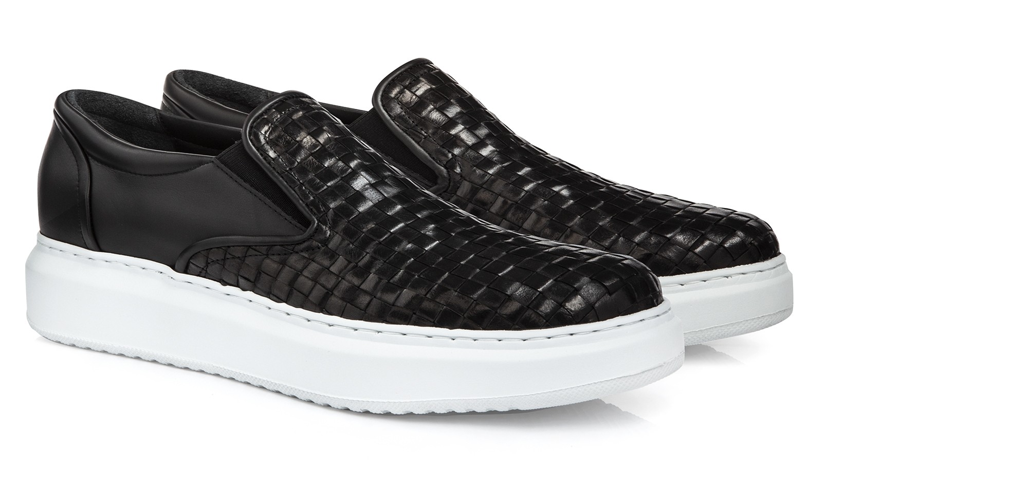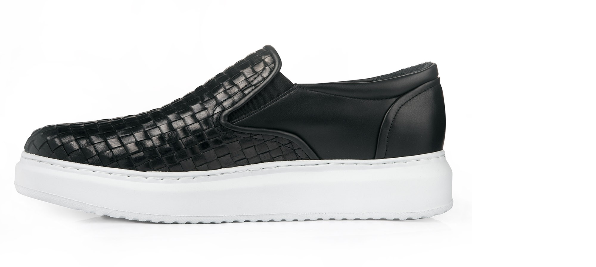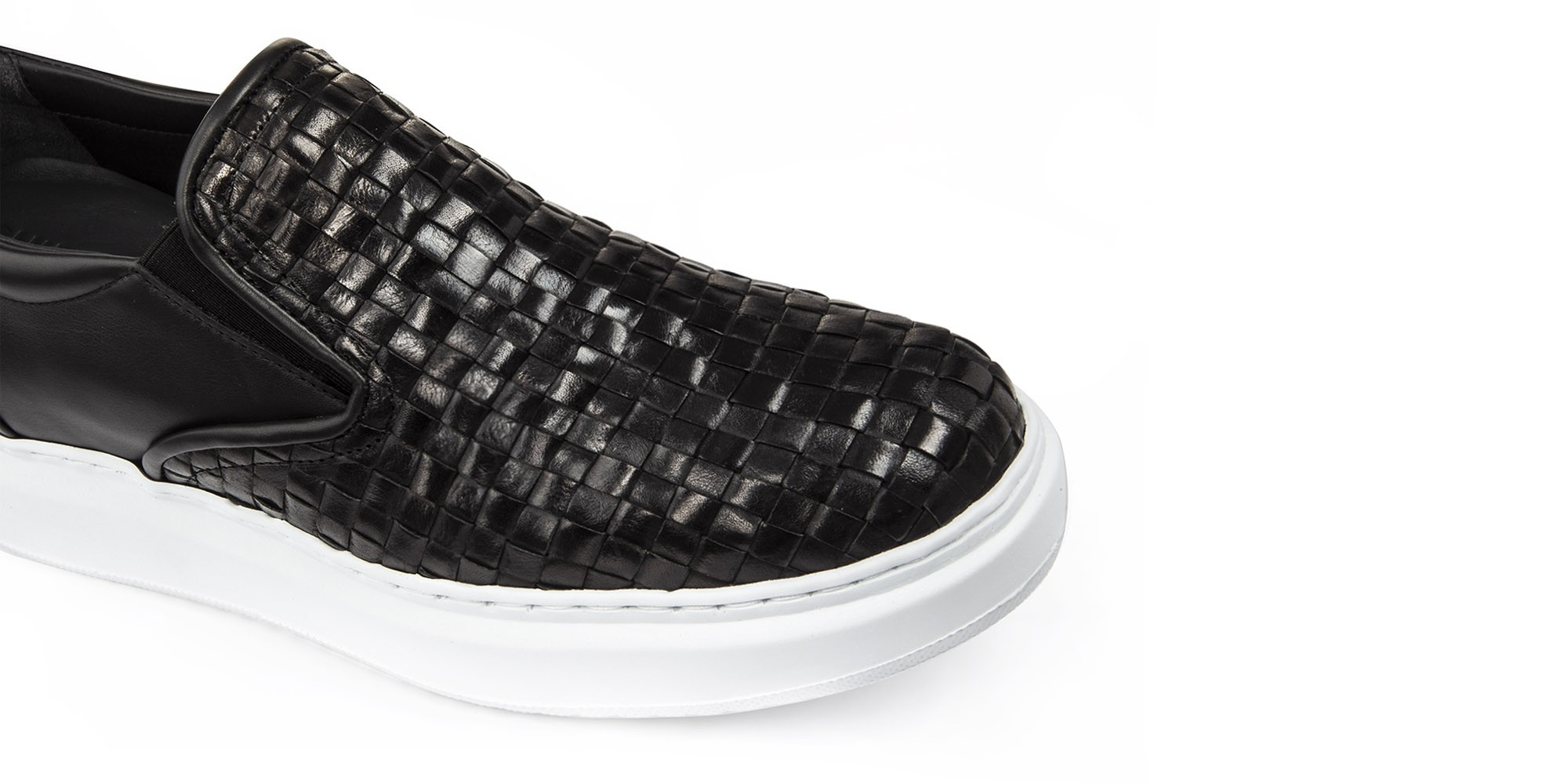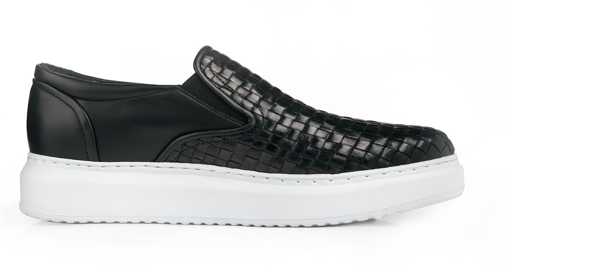Chic and comfortable slip-on with upper made of black hand-woven calf leather on the front and full-grain Tuscan leather on the back. The white sole in ultra lightweight natural rubber creates a stylish chromatic contrast.