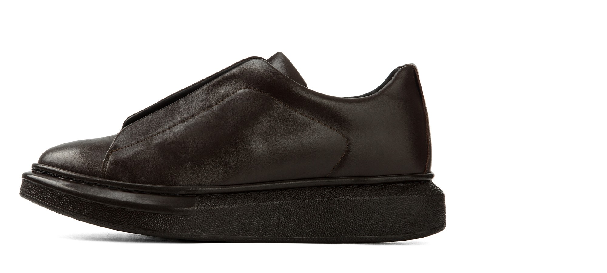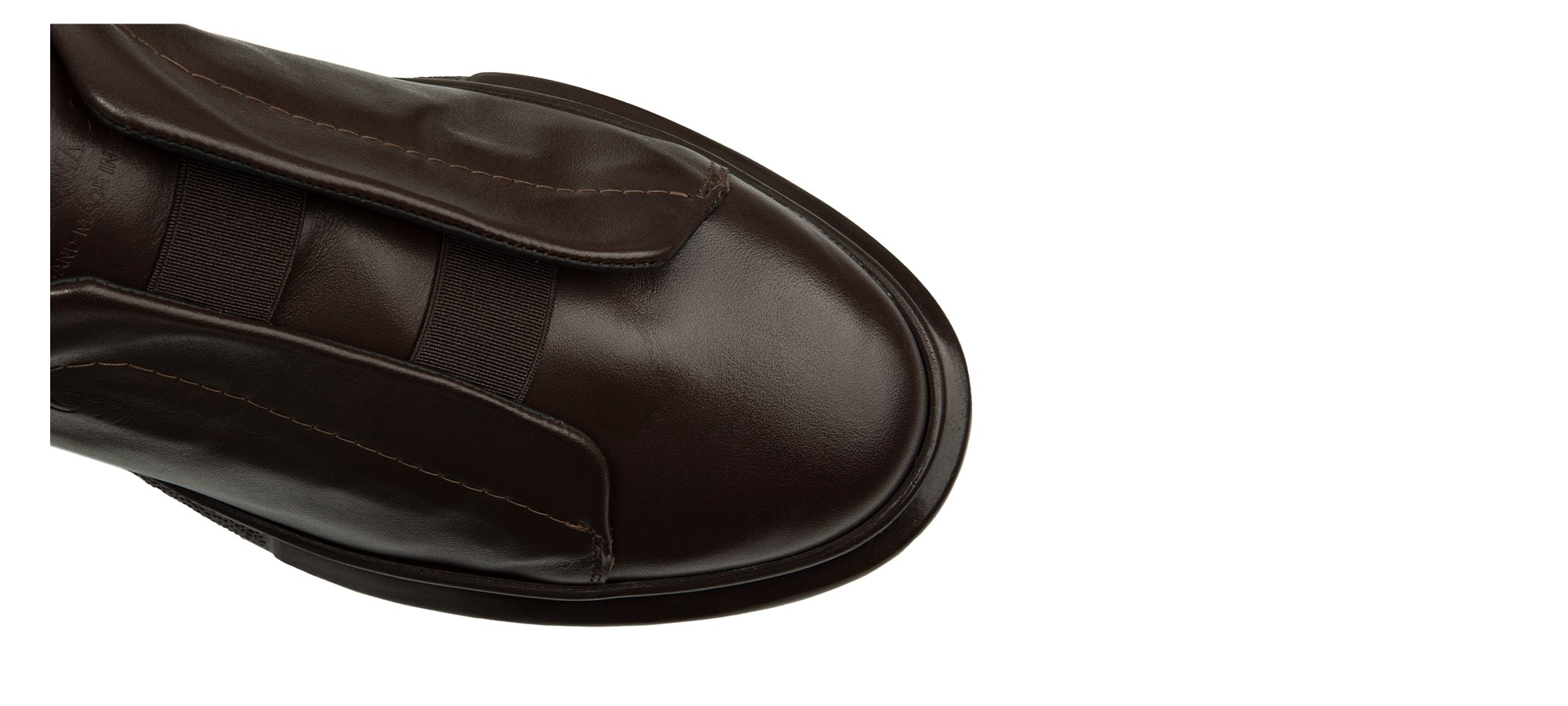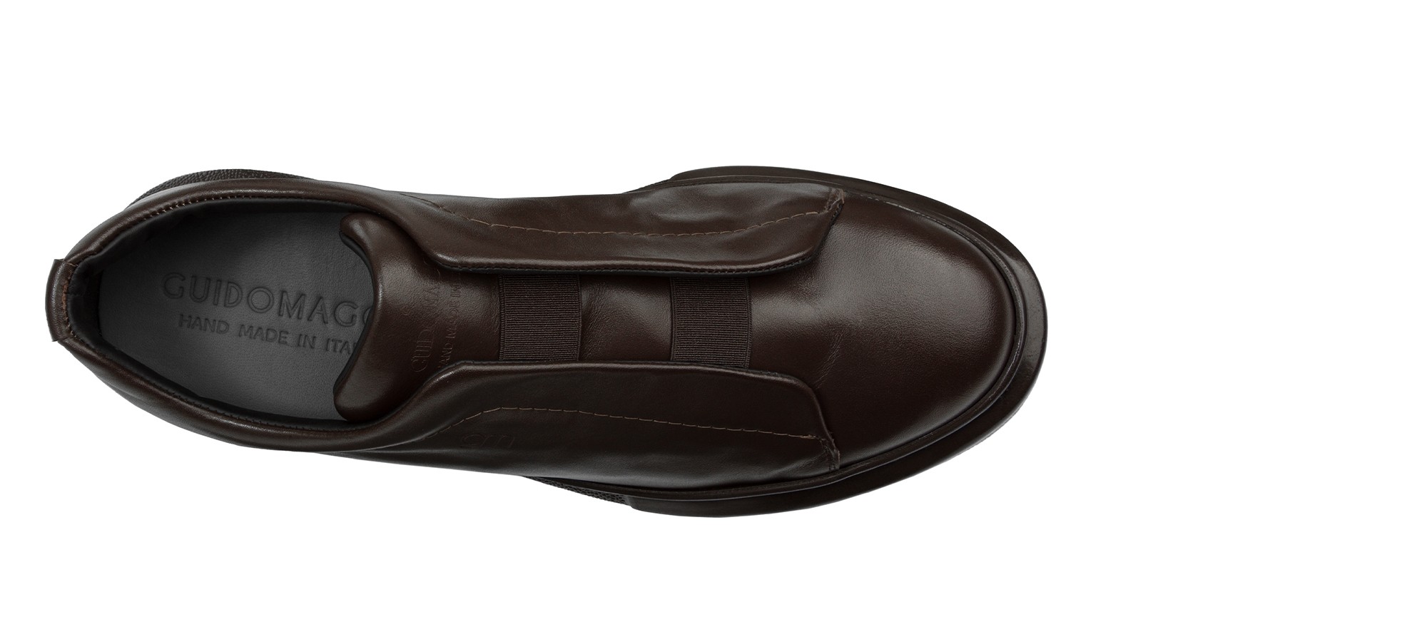 Innovative design for this elevator slip on, handmade in deerskin, a leather known for its extreme softness and durability. In an brown shade, it is characterized by elastic bands, to form a play of references that perfectly combines the artisan soul with a more contemporary mood.