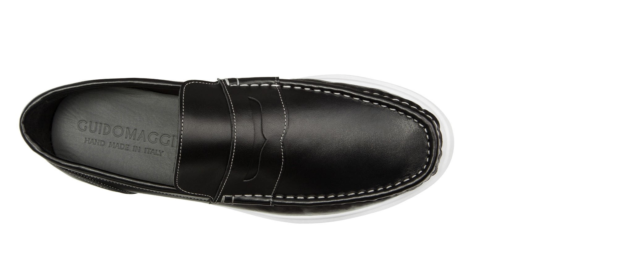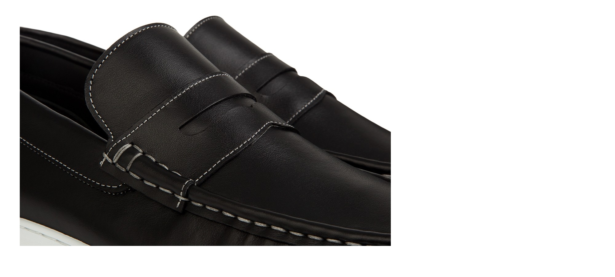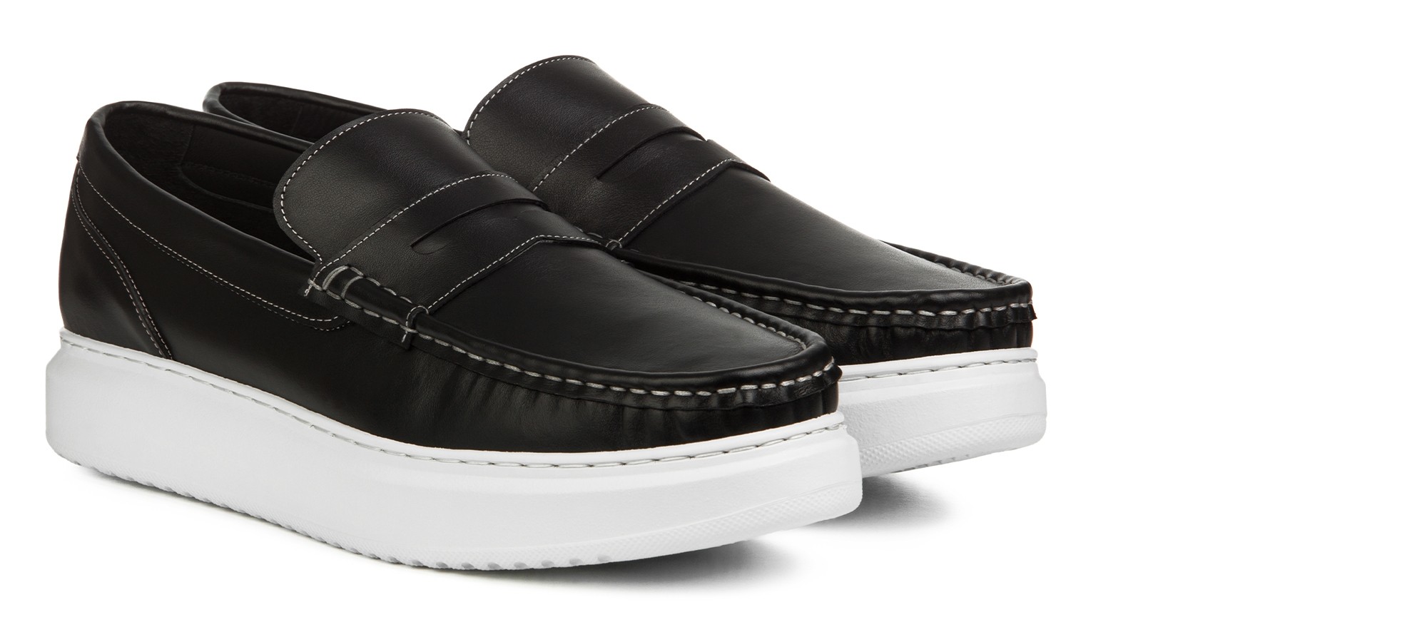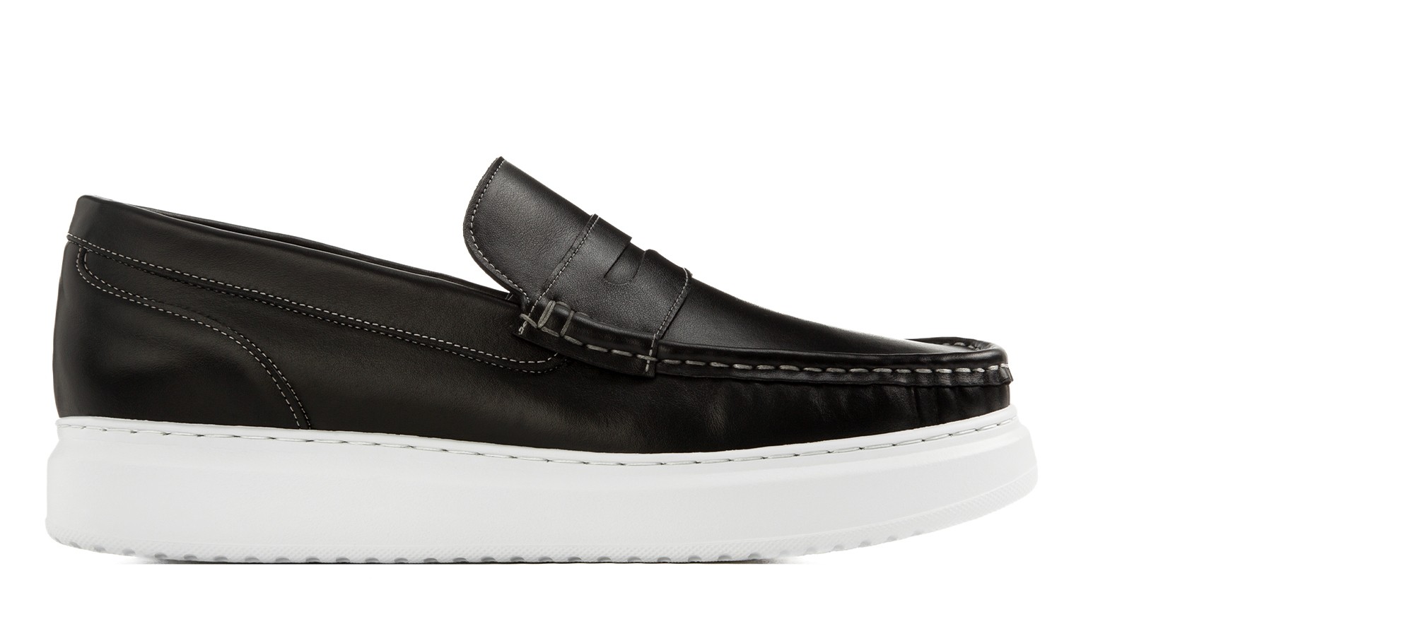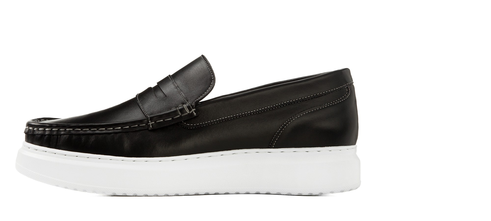 Contemporary hybrid penny loafer crafted from premium black full-grain leather with contrasting elastic bands for a bold, modern accent. The oversized ultra-light sole offers all-day comfort and ease.