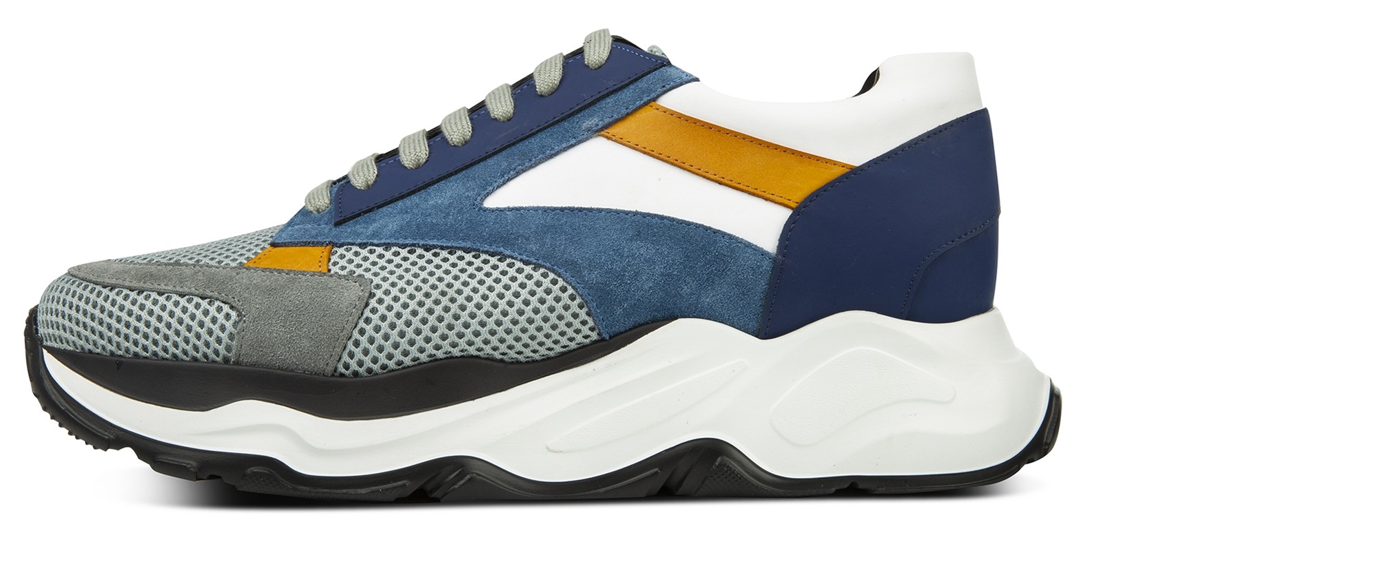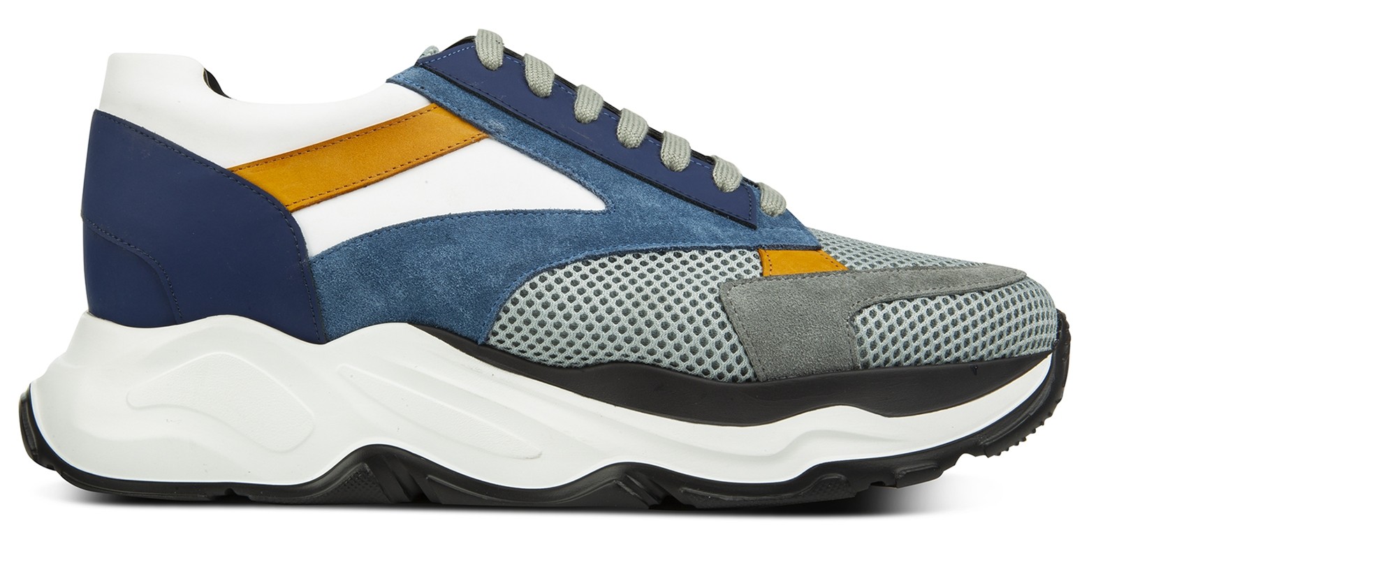 Bring some character to your outfit with these luxury elevator sneakers featuring an innovative and contemporary design. Entirely handcrafted in white and blue rubberized calf leather, gray and blue suede, soft yellow waxed calfskin and gray breathable perforated fabric. The two-tone white/black sole is in extralight rubber.