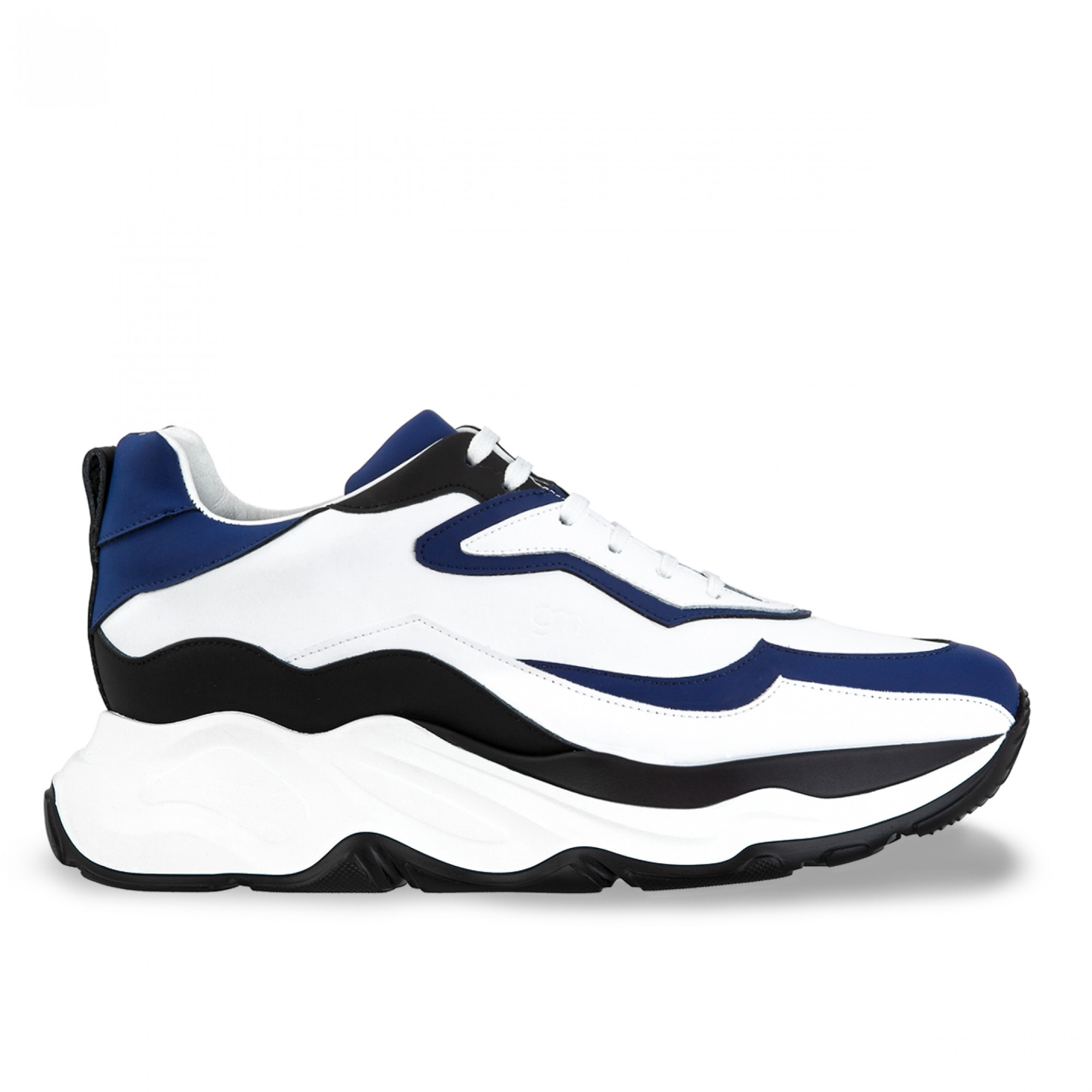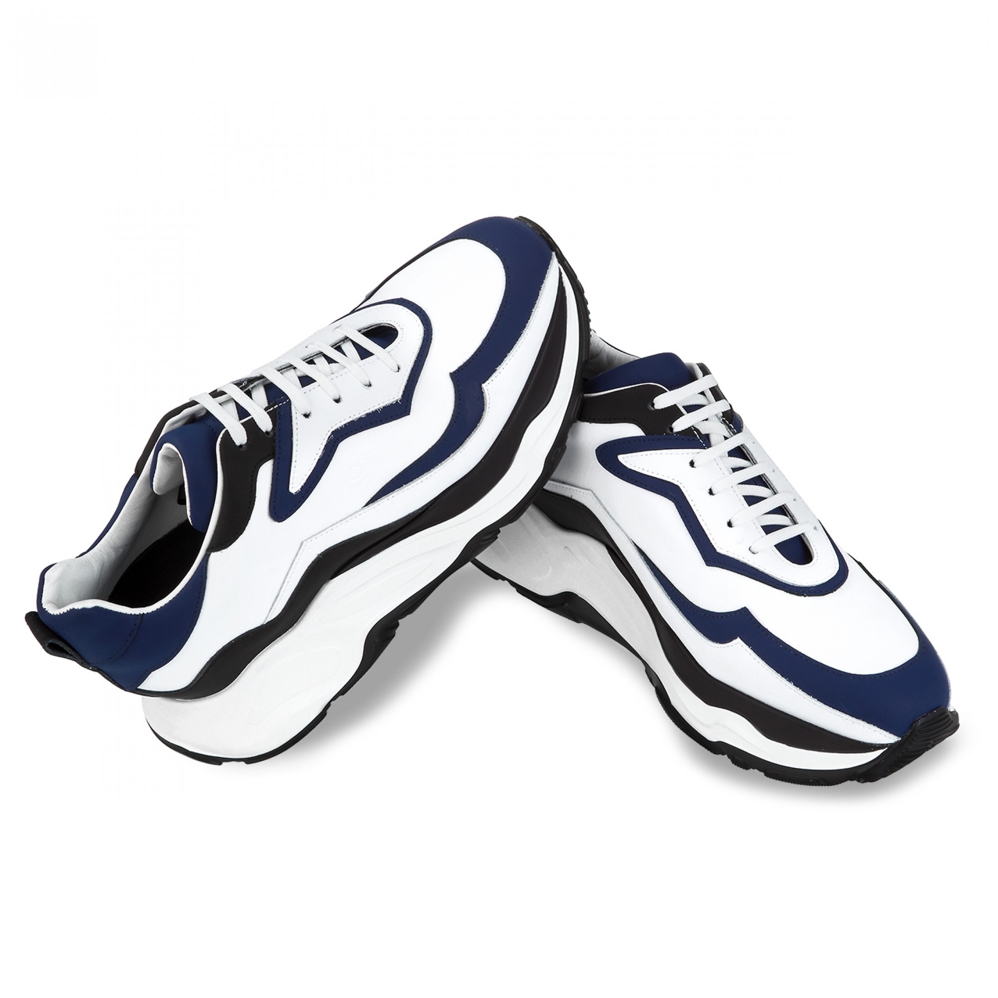 Giant Dragon is handcrafted with upper made of rubberized calfskin in white, blue and black. The two-tone white / black sole is in extralight rubber. The Giant Dragon model allows to increase height from 2.4 (6 cm) up to 4.3 inches (11 cm).