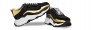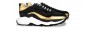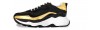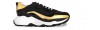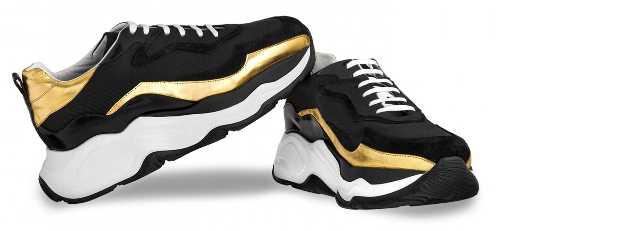Black & Gold: elevator chunky sneakers with upper made of gold calf leather, black breathable technical fabric, shiny calfskin and tone-on-tone suede. The two-tone sole is made of extralight rubber.