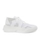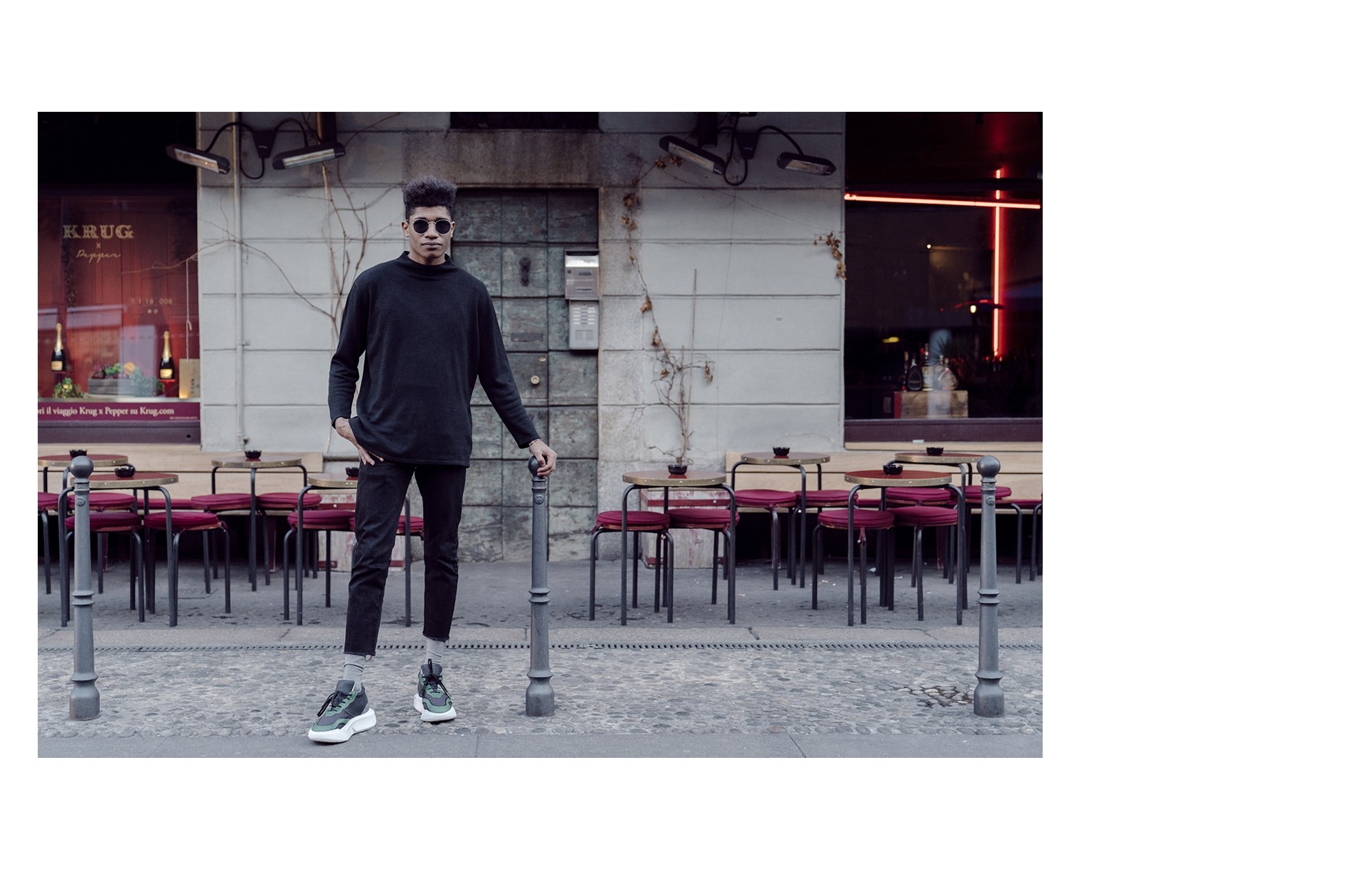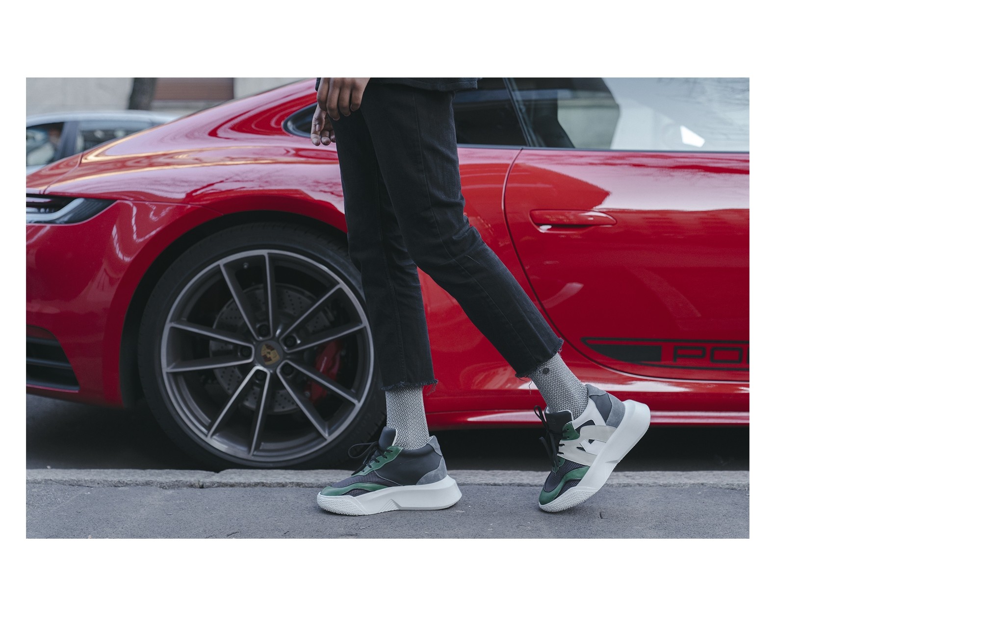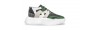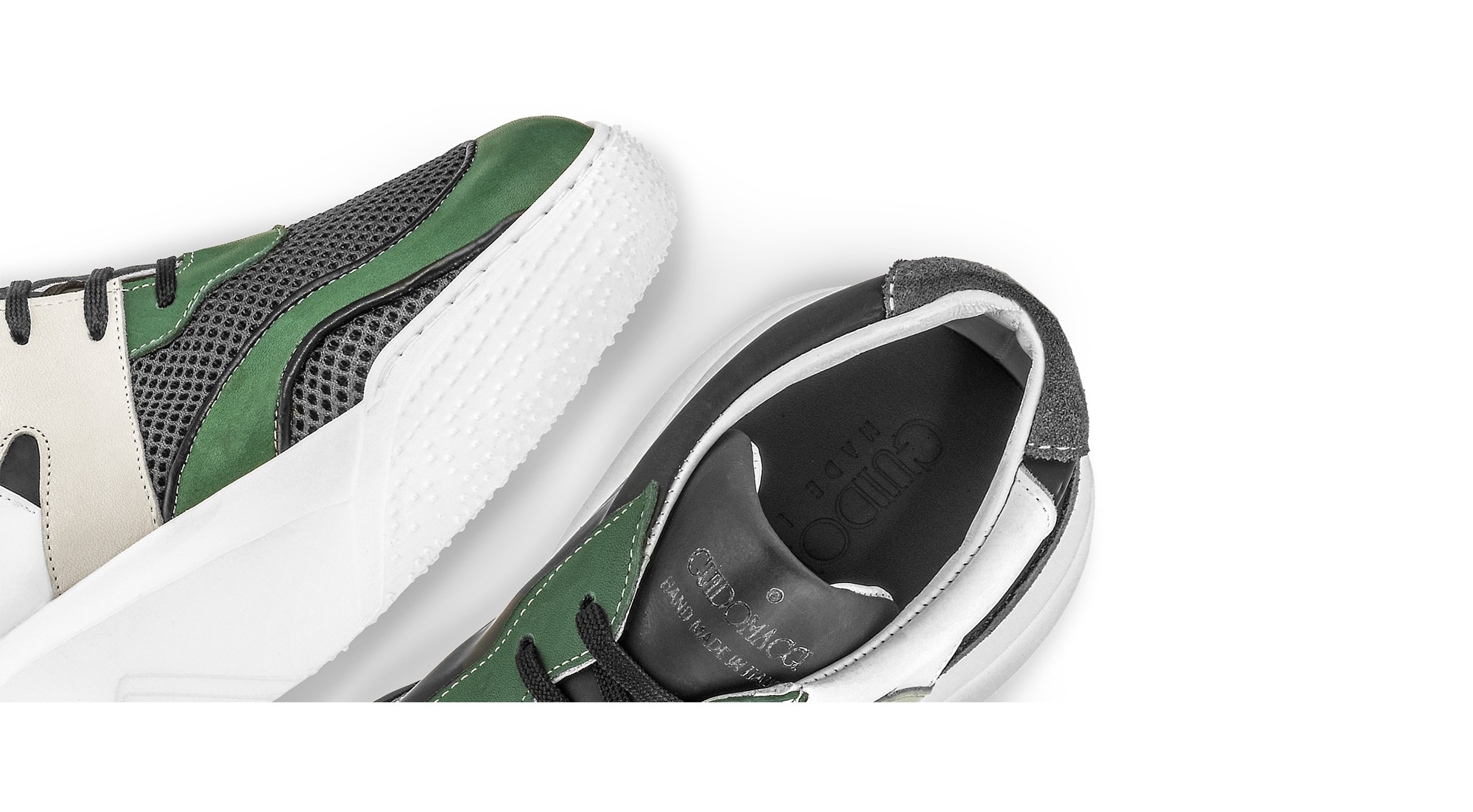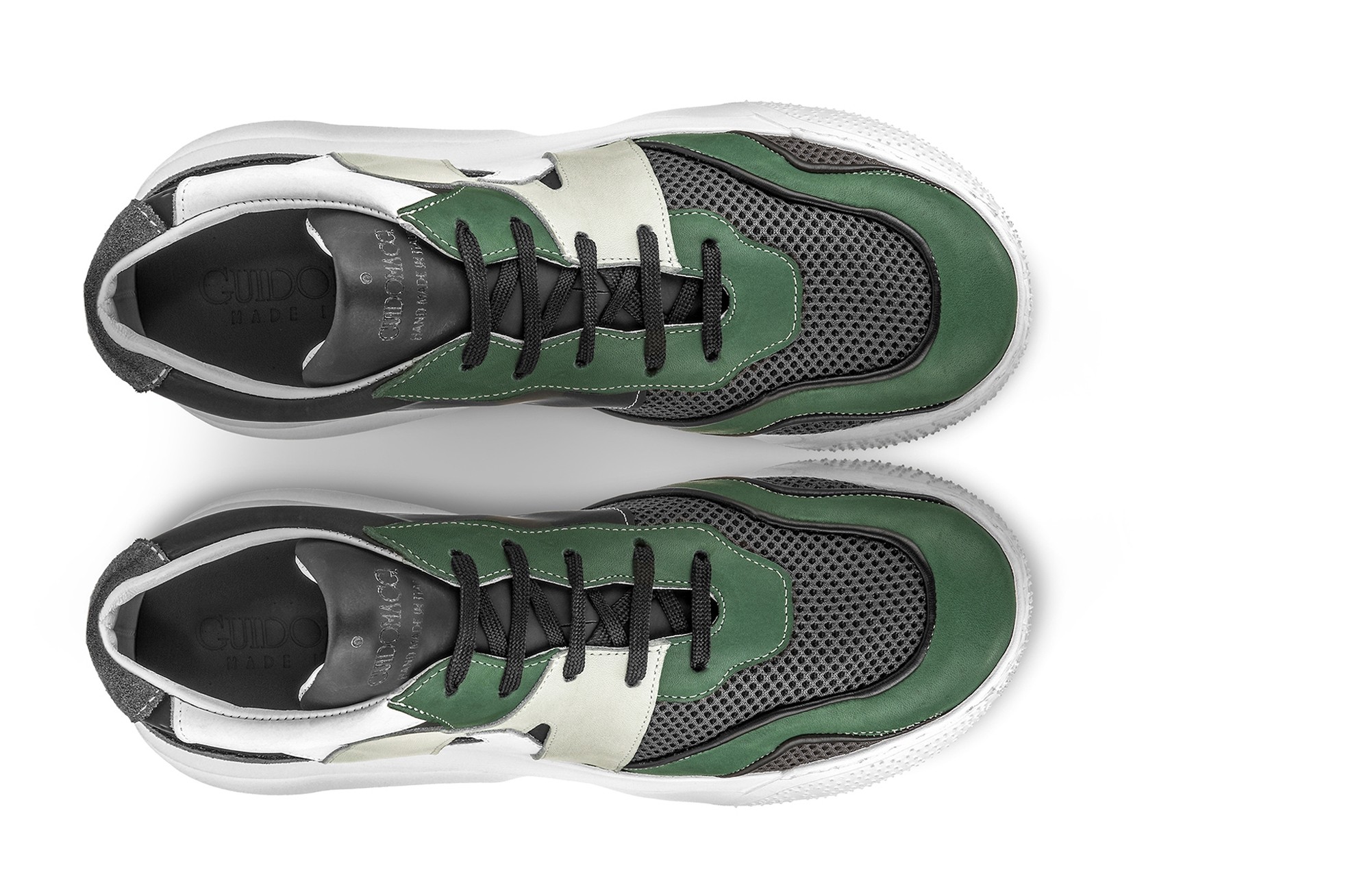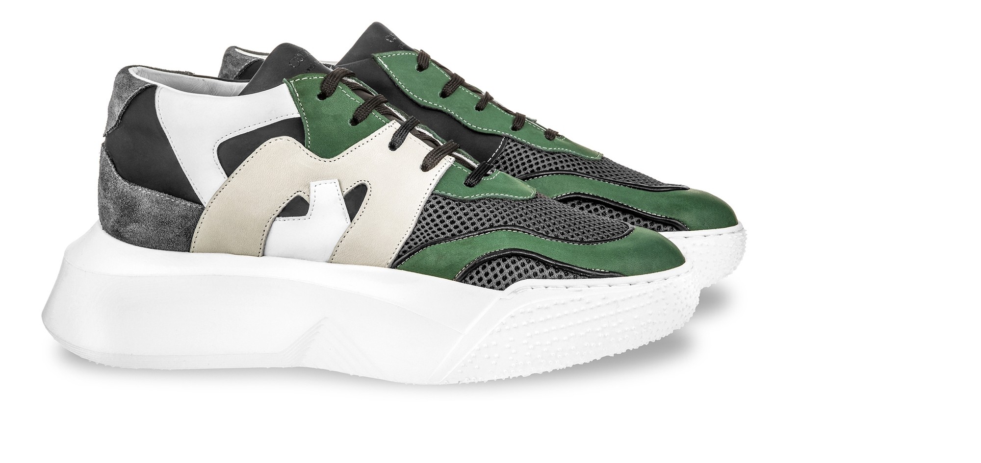 The 90s style is back in the limelight. O'Neal is a chunky elevator sneaker made of white and black rubberized calfskin, full-grain vegetable tanned leather with green and light gray nuances, gray suede and breathable perforated steel gray fabric. The white sole is in superlight natural rubber.