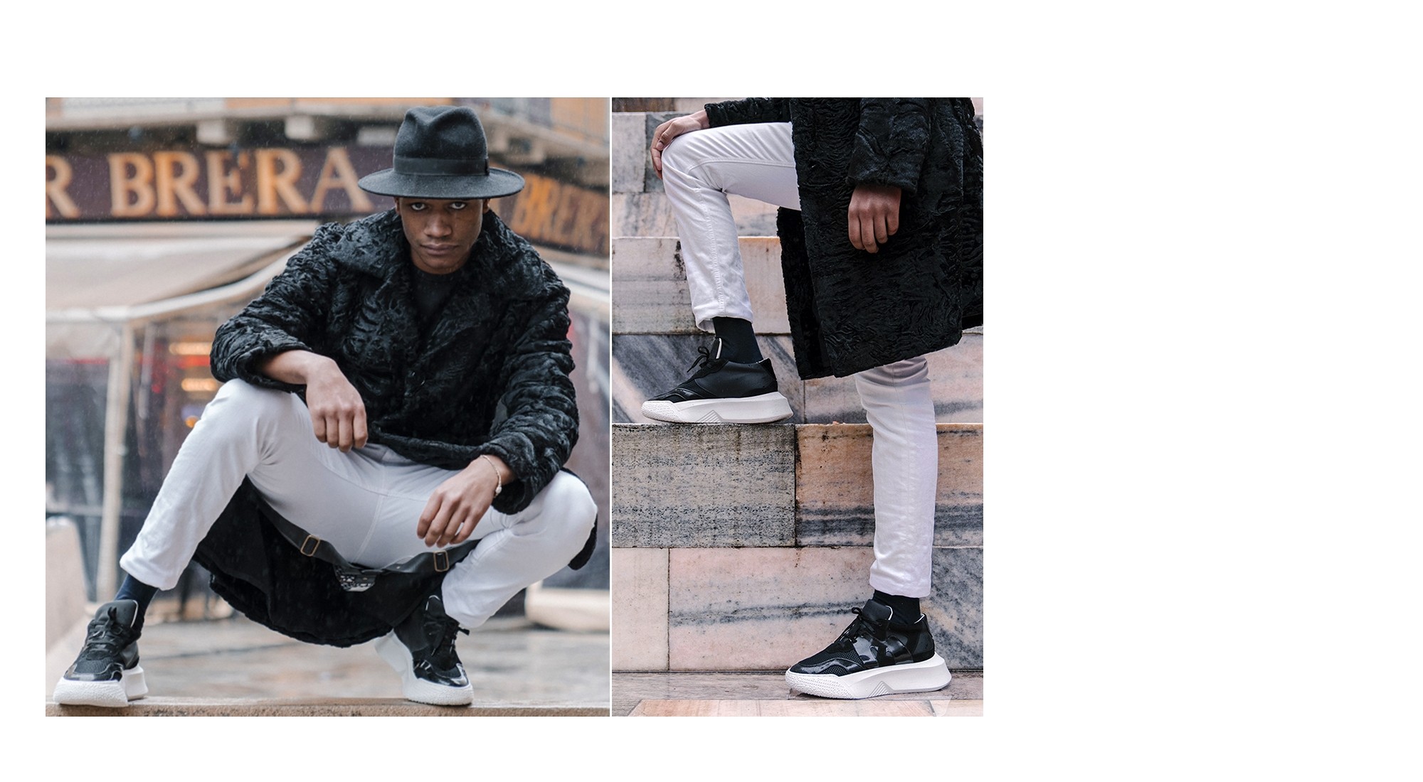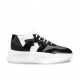 Chunky elevator sneakers inspired by the basketball world and hip hop culture with upper made using 4 black different fine materials: brushed calfskin, soft suede, rubberized calfskin and breathable perforated fabric. The thick white sole featuring an irregular design is made of super-light natural rubber.