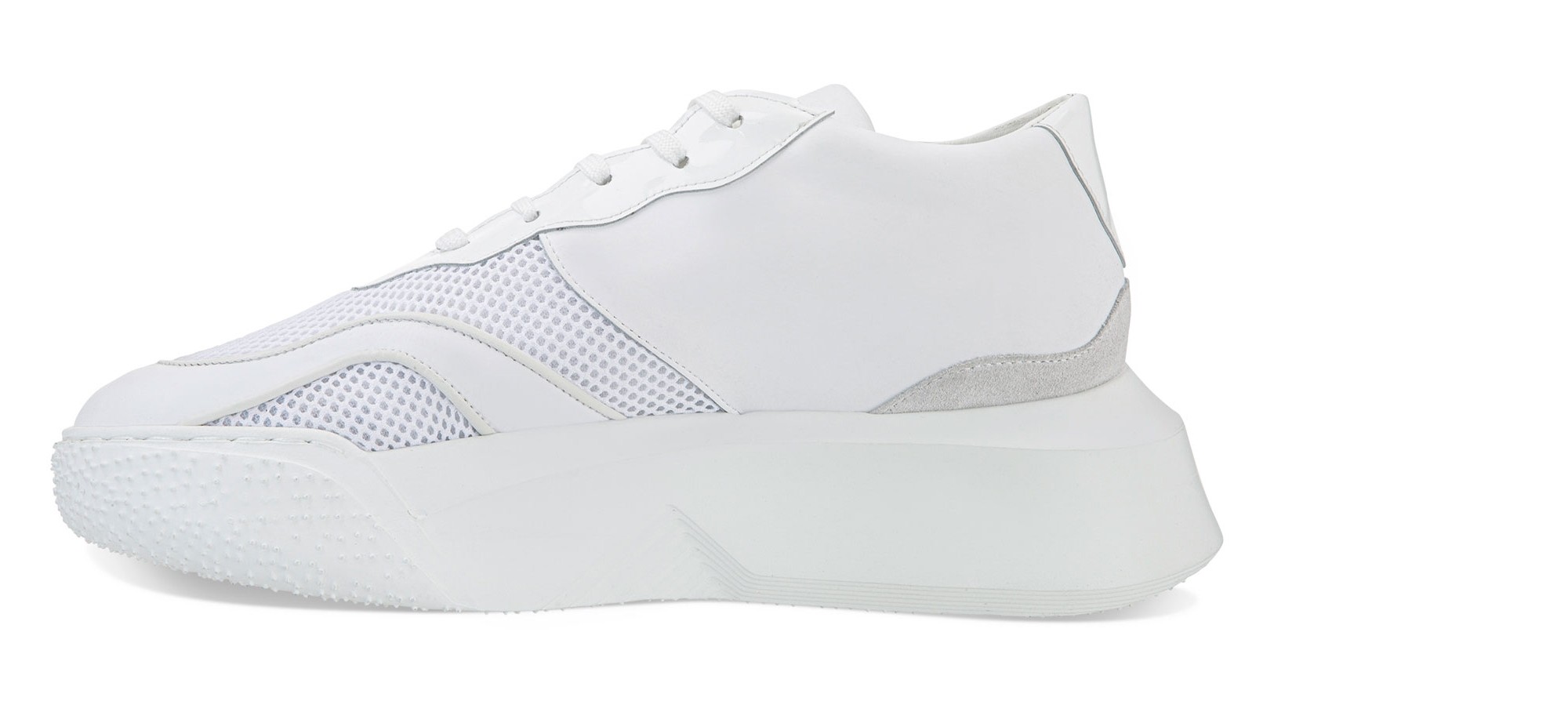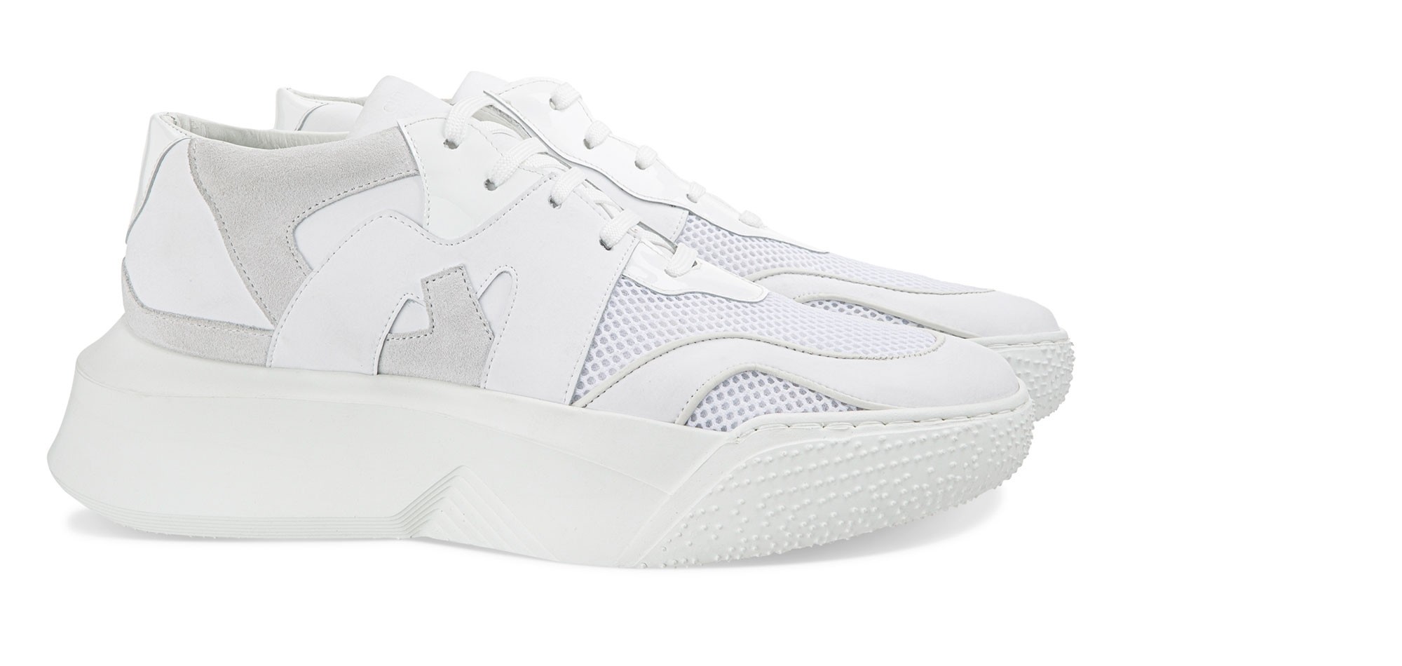 GuidoMaggi's tribute to Jason William one of the greatest NBA basketball players of all time. White Chocolate is a chunky elevator sneaker with upper handcrafted from 4 white fine materials: suede, breathable perforated fabric, patent leather and rubberized calfskin. The sole is in tone-on-tone super light natural rubber.