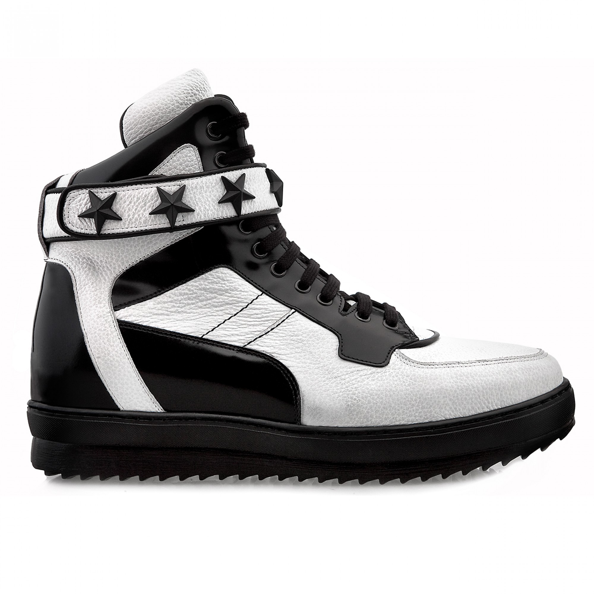 Upper in white full grain leather and shiny black calfskin. Lining in soft goatskin. Insole in genuine leather. Lightweight high quality rubber outsole anti-slip. Height increase: 2.4in(6cm), 2.75in(7cm), 3.1in(8cm) or 4 in(10cm). Hand Made in Italy