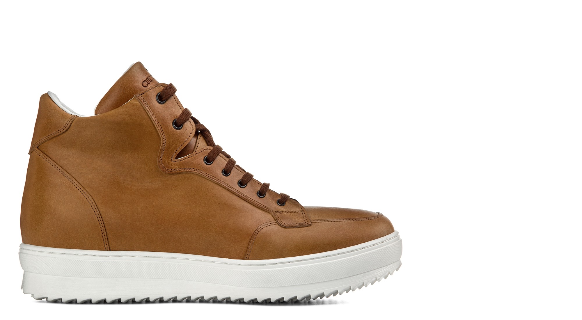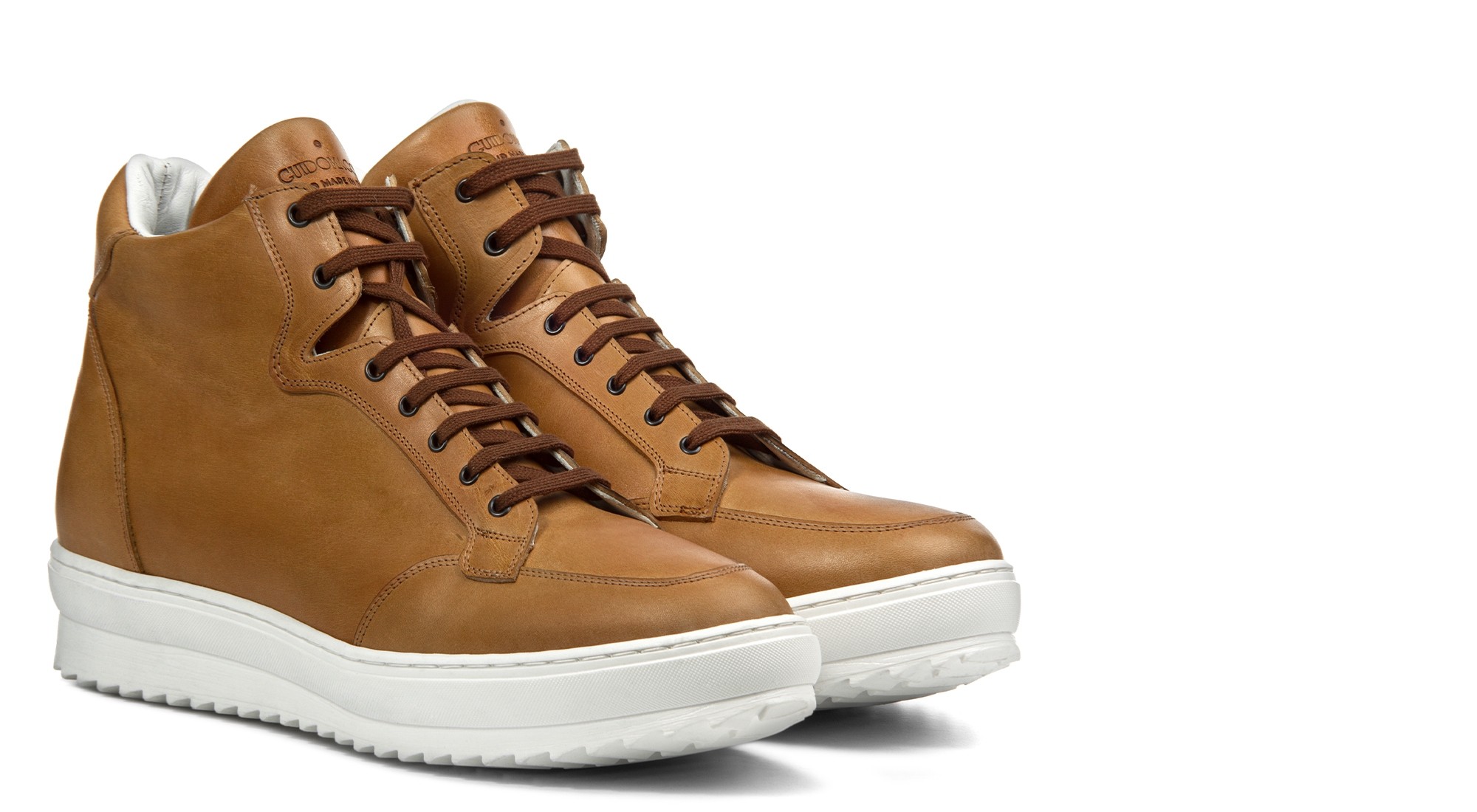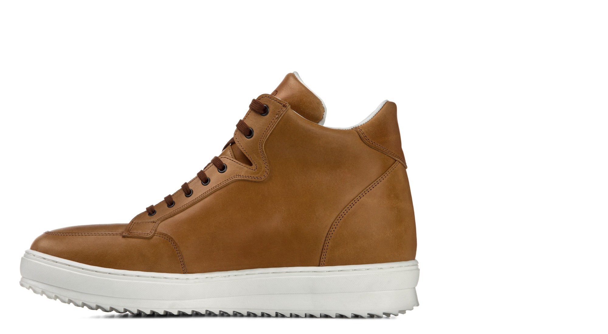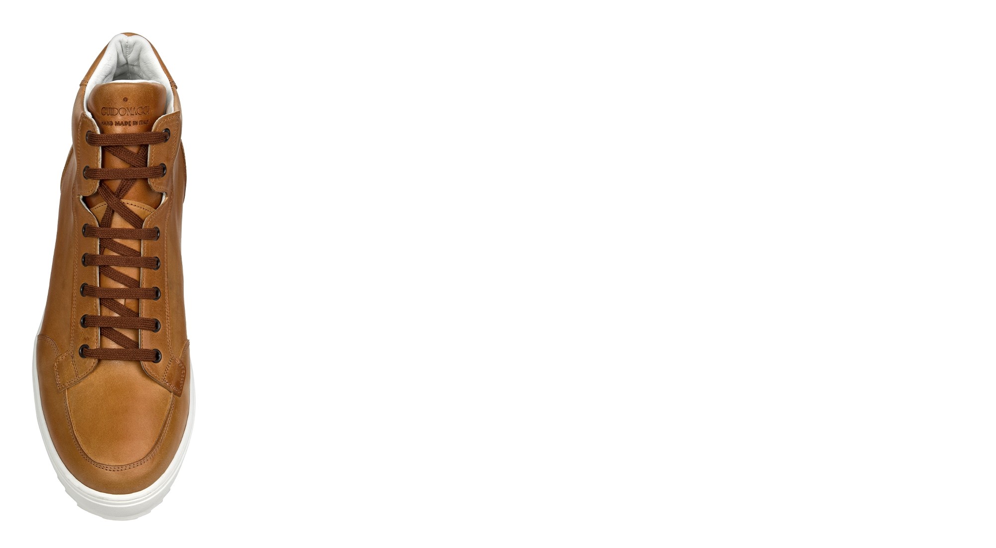 Named " Worth Avenue " The new elevator sneakers in natural tanned cognac full-grain leather by GuidoMaggi. The specific treatment used gives the shoes a vintage effect. The warm inner lining made of soft goatskin, ensures maximum comfort. The insole is made of genuine Italian leather while the white outsole of the latest generation is super light rubber with anti slip. The invisible and anatomic increaser - depending on needs - can be selected from 6 cm, 7 cm, 8 cm, 10 cm. GuidoMaggi's artisans allow a range of possibilities for customization.