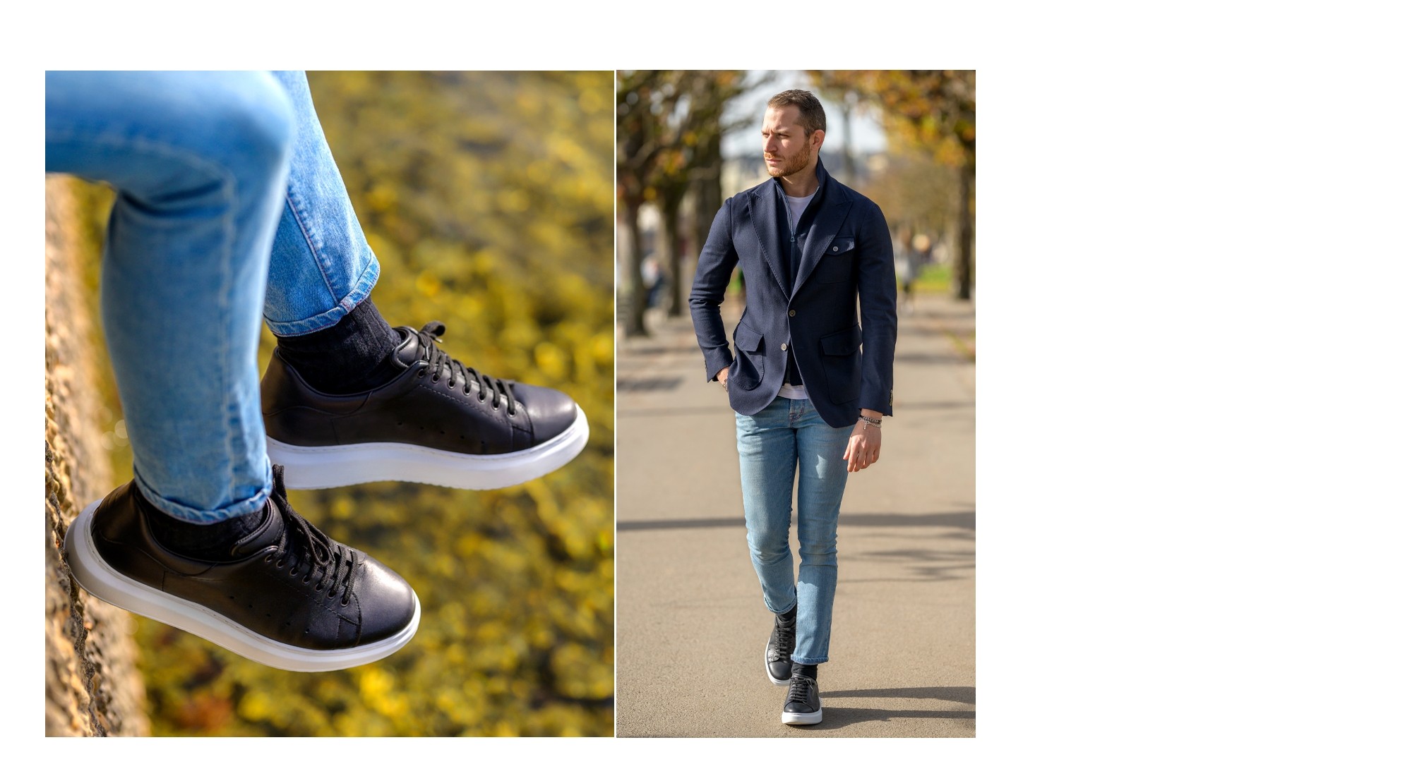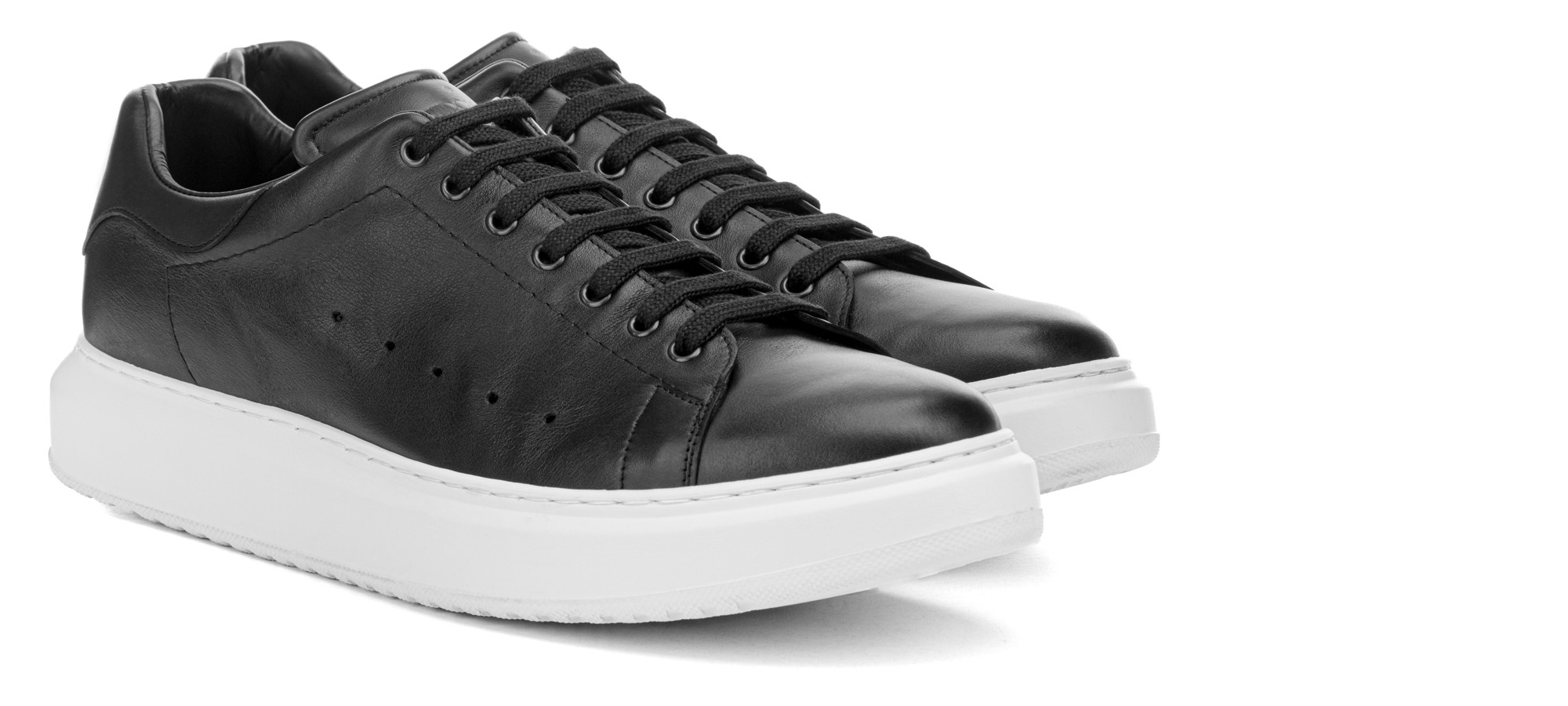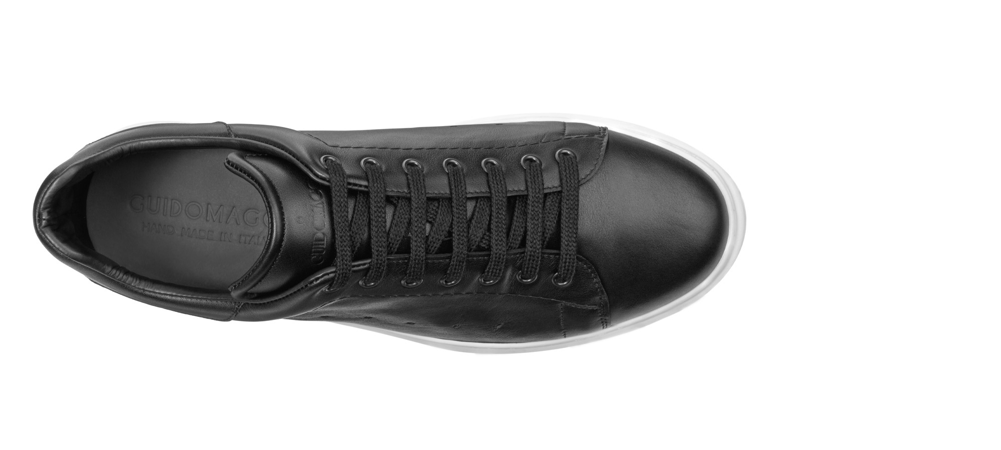 Luxury elevated sneaker with a casual appeal able to increase the height of the wearer up to 3.1 (8 cm) in a discreet and invisible way. The upper is in fine black full-grain calfskin and the white sole in super-light natural rubber. Handmade in Italy.