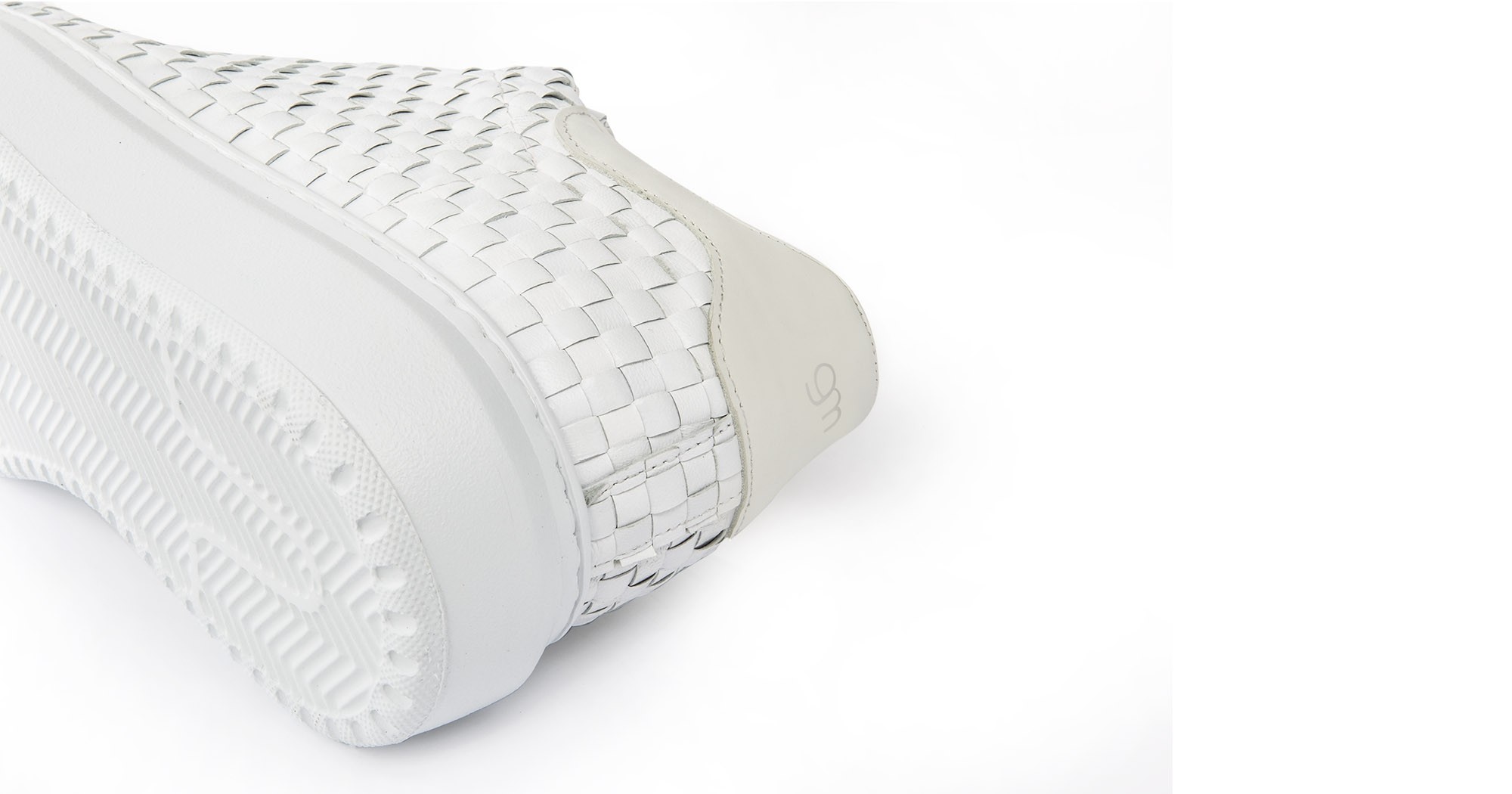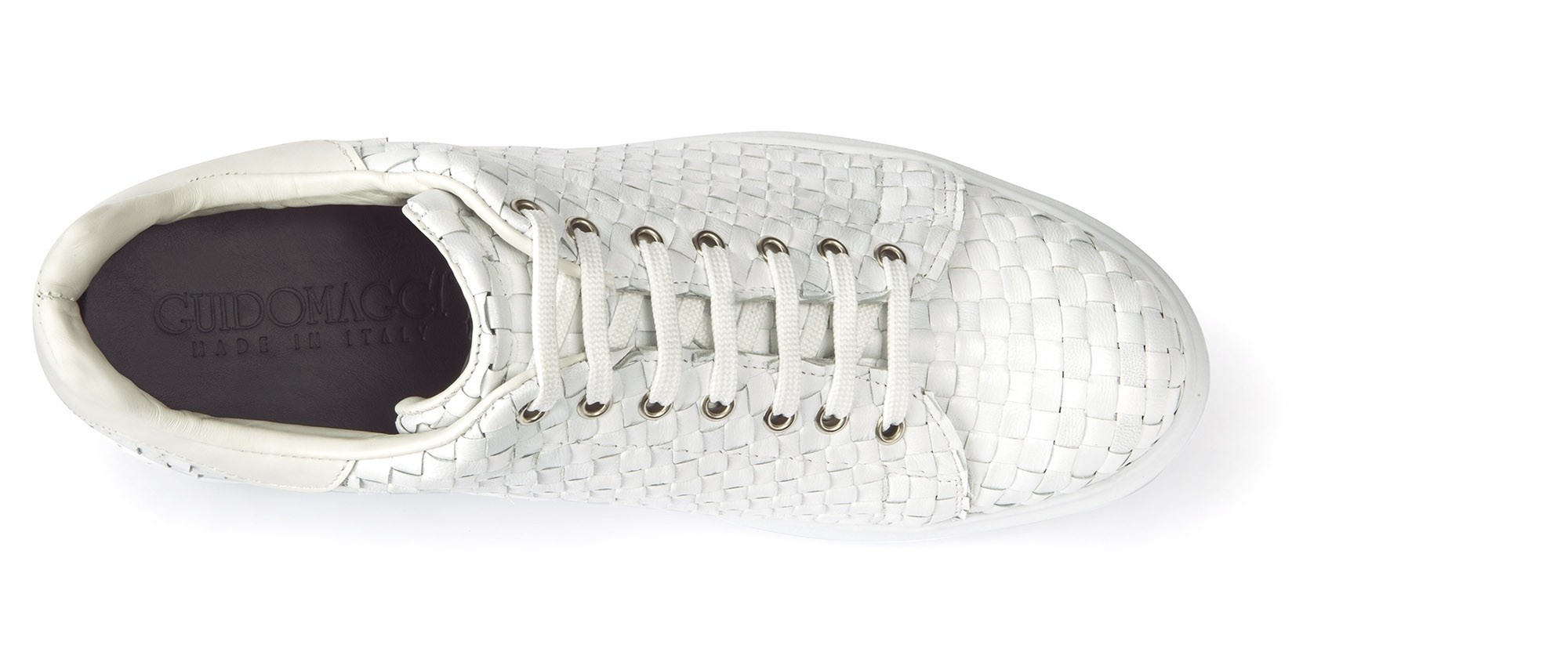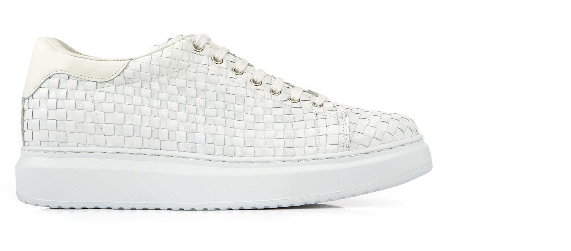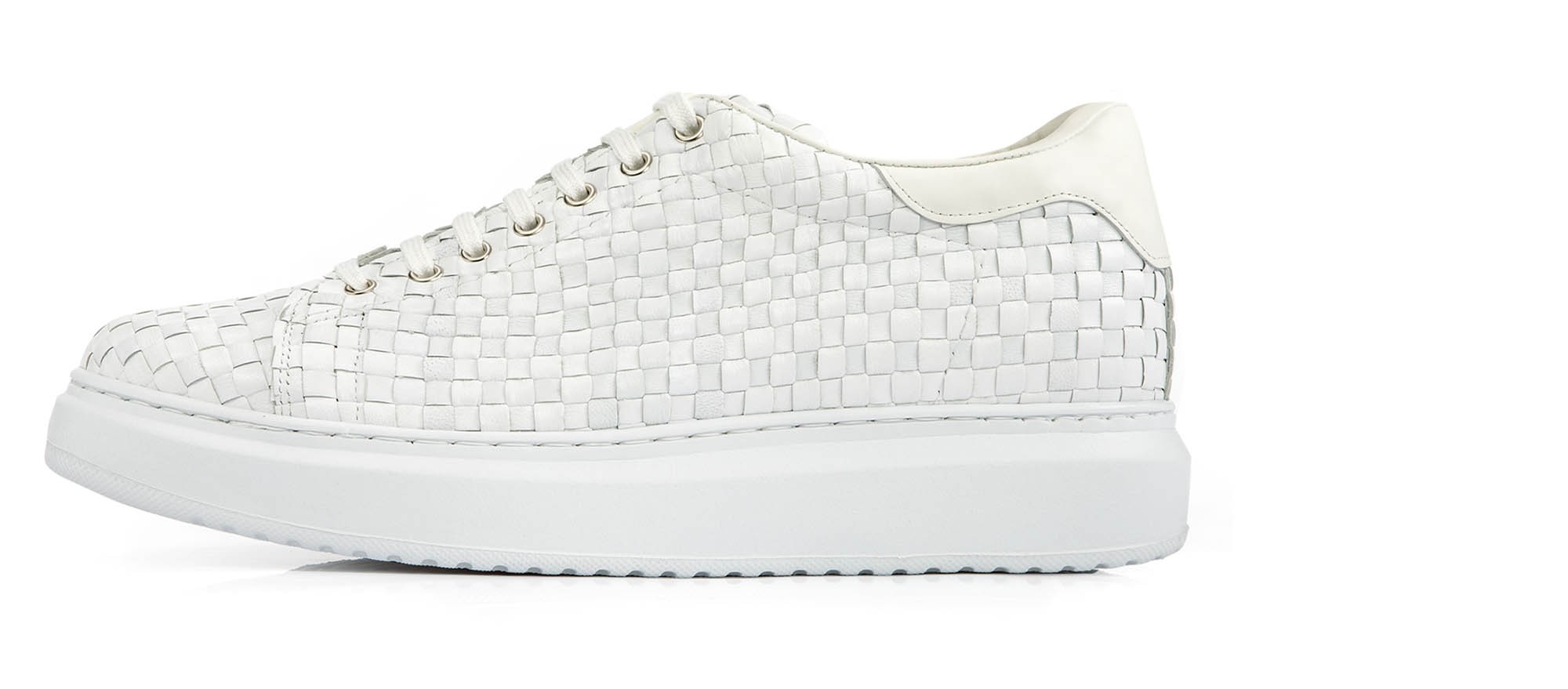 Luxury elevator sneakers featuring upper made of white hand-woven calf leather and tone-on-tone heel tab in vegetable-tanned full-grain leather. The white sole in super light natural rubber improves the flexibility and stability of the walk, making them comfortable to wear all day.