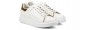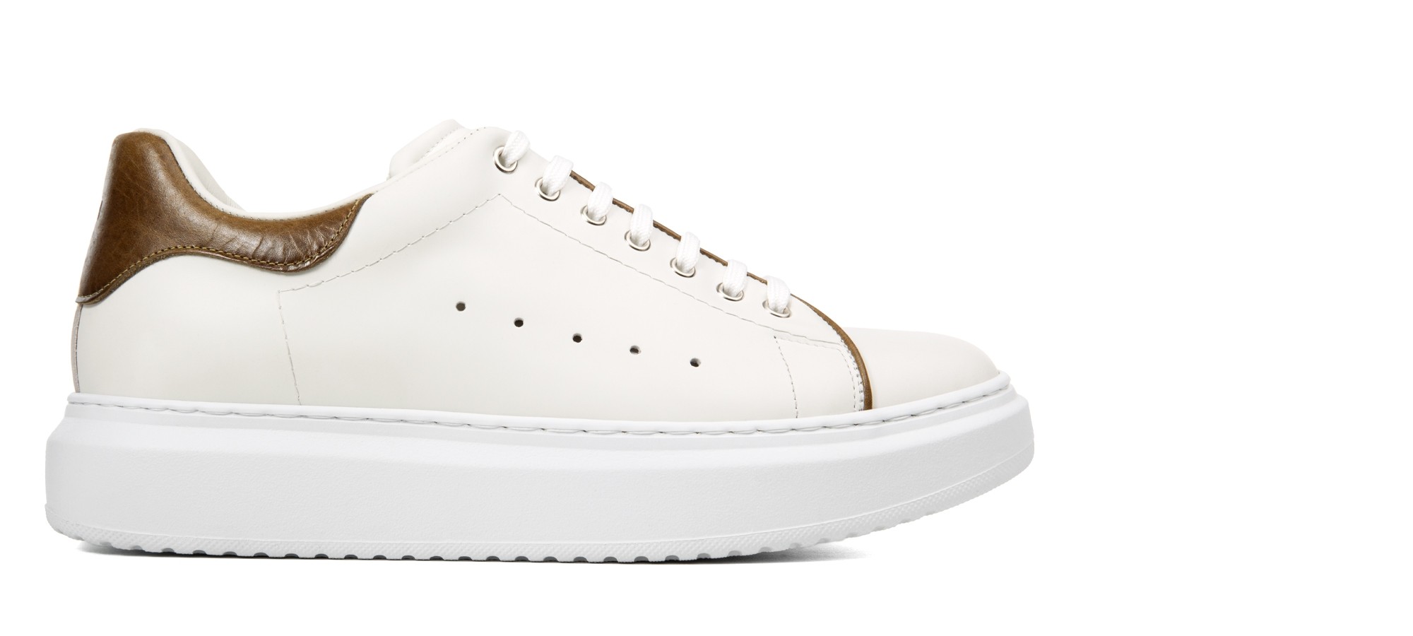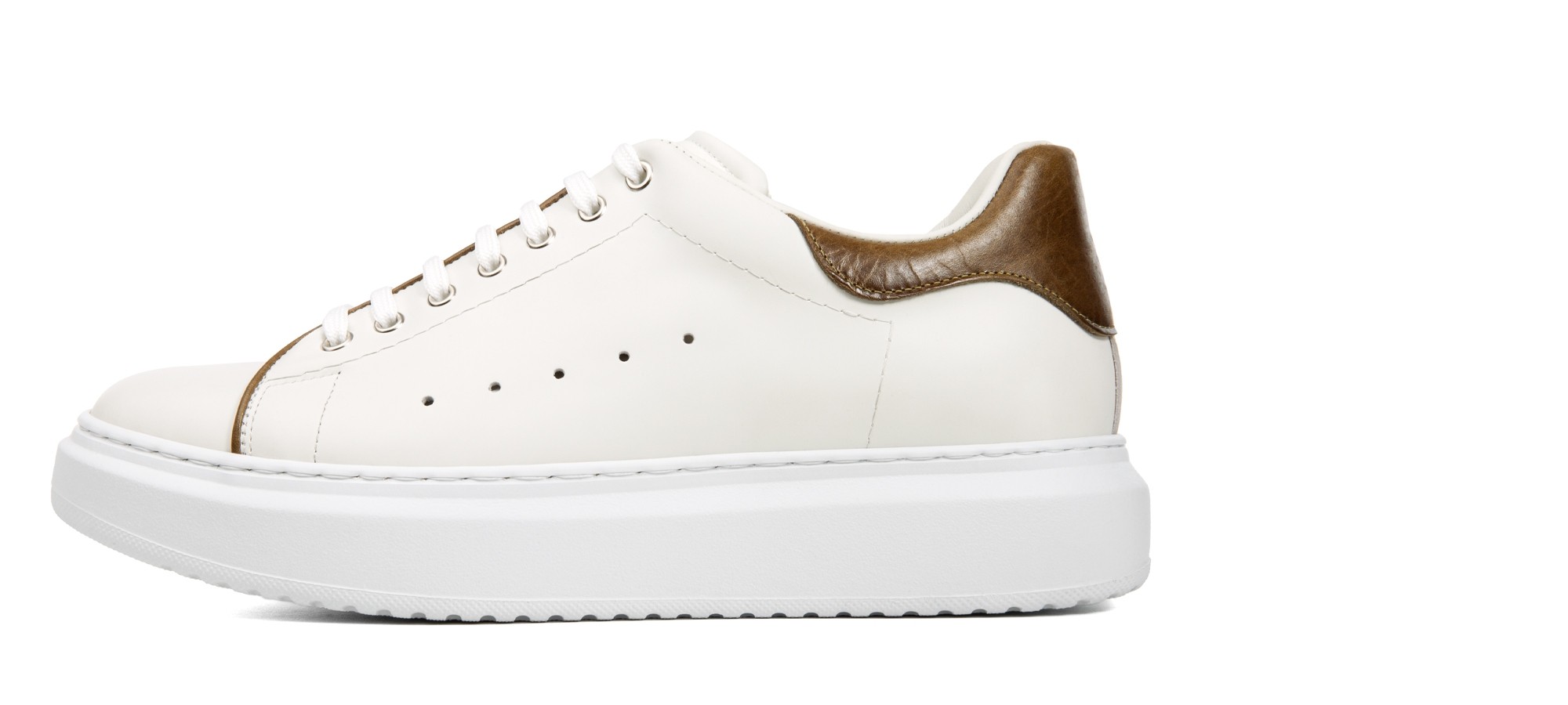 These height-increasing sneakers feature an oversized white rubber sole, ensuring stability and comfort. The footwear, handcrafted, is made with high-quality full-grain white leather. The edges details and heel tab are in Tuscan nappa leather, characterized by an elegant wrinkled effect in a shade of green.