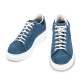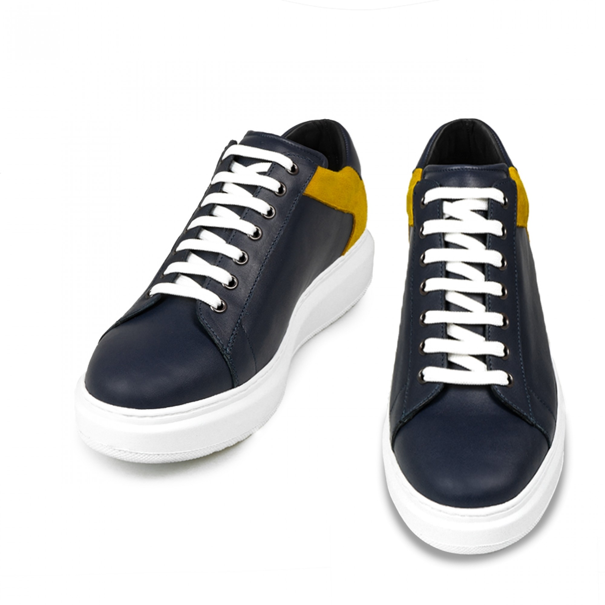 Exclusive elevator sneakers with upper in blue calfskin and ocher yellow suede, and ultra-light natural rubber sole.